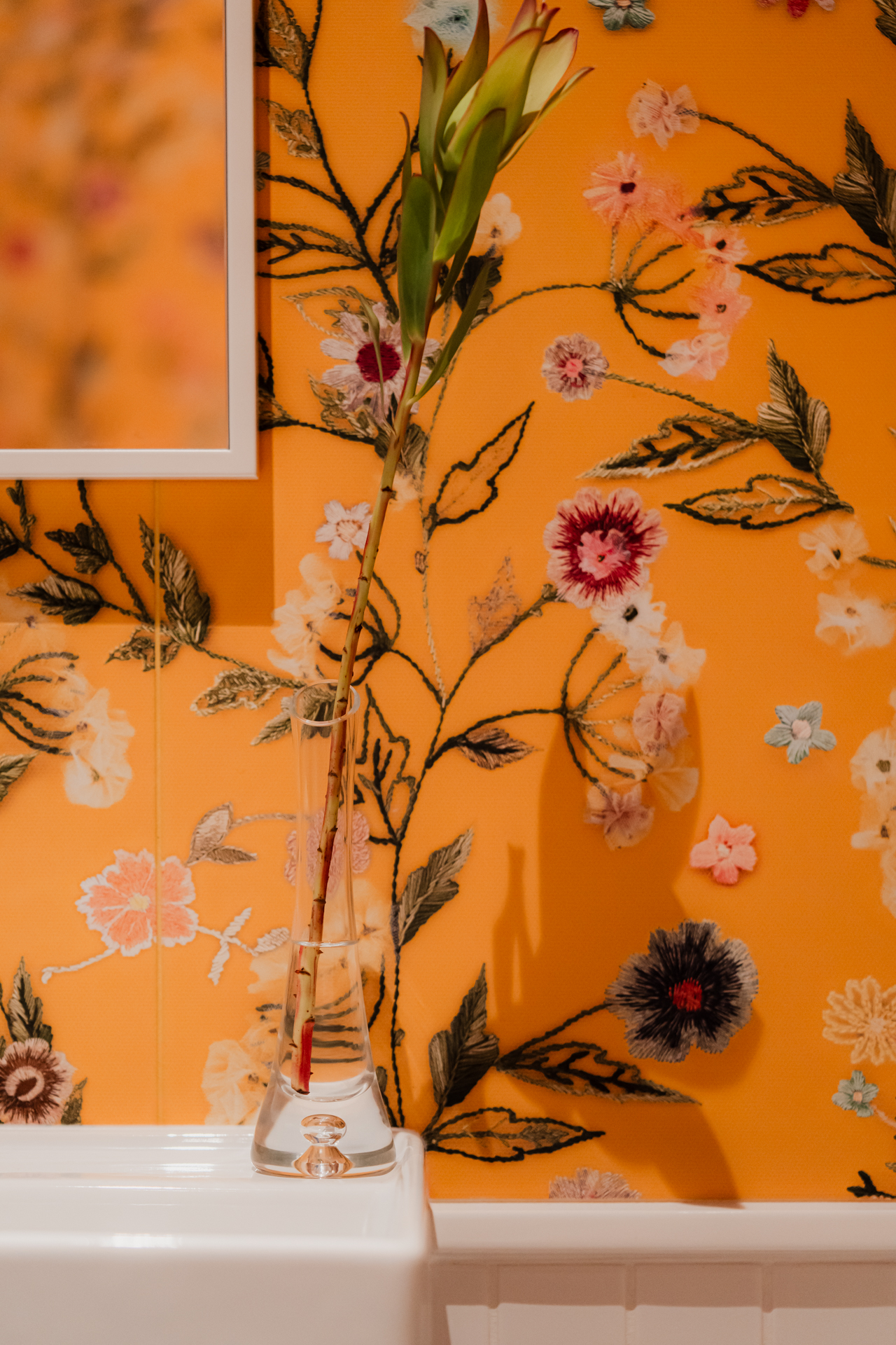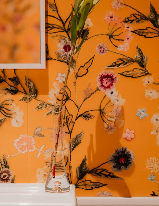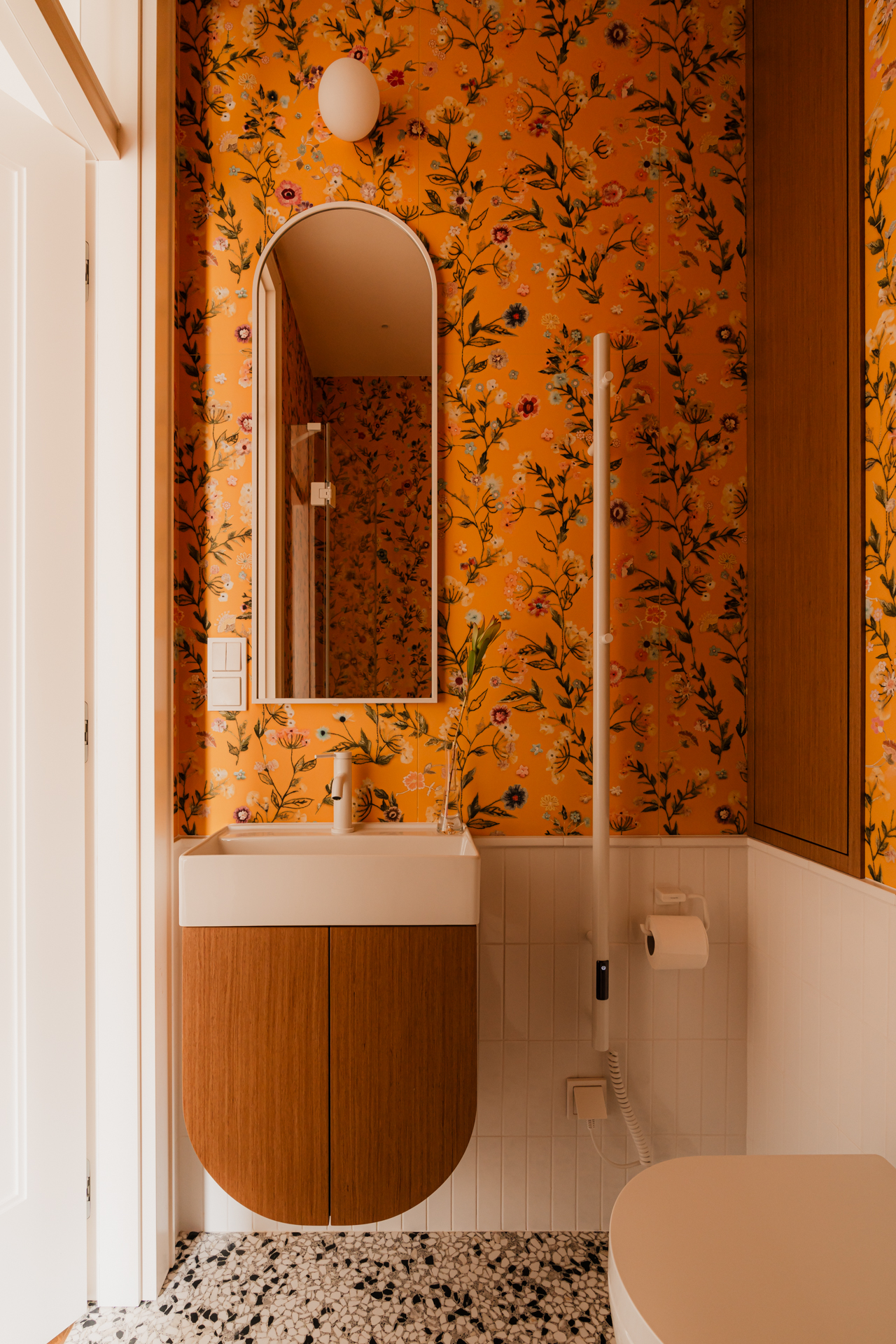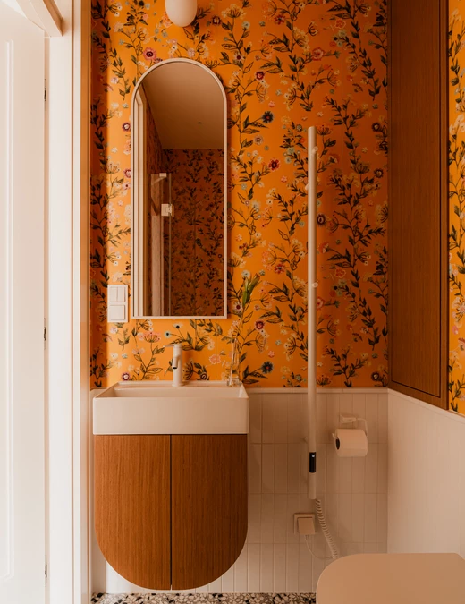 Ten sam radosny motyw kontynuowany jest w łazience dziecięcej, gdzie żółte kafle z florystycznym wzorem okalają wnętrze, a lastrykowa posadzka subtelnie nawiązuje do przedwojennej historii mieszkania.