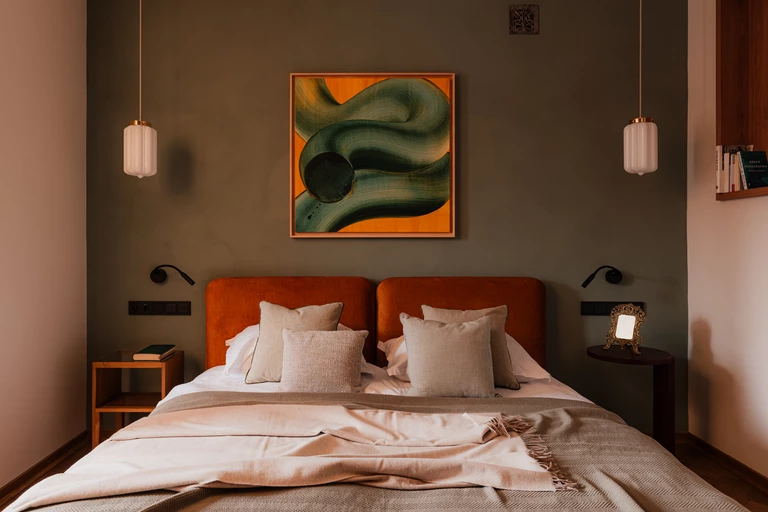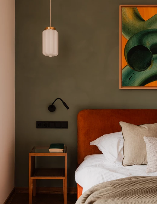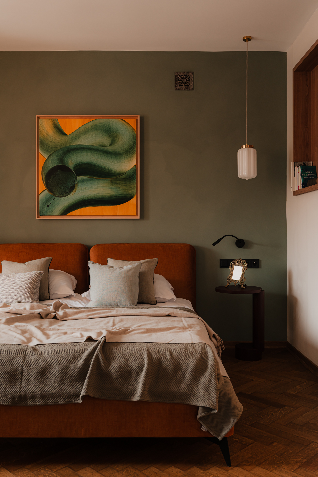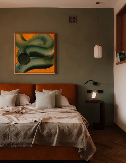 W głównej sypialni króluje szałwiowo-miętowy odcień glinianej farby, który tworzy spokojne tło dla dzieł współczesnych artystów: Nikodema Szpunara oraz Mikołaja Kasprzyka.