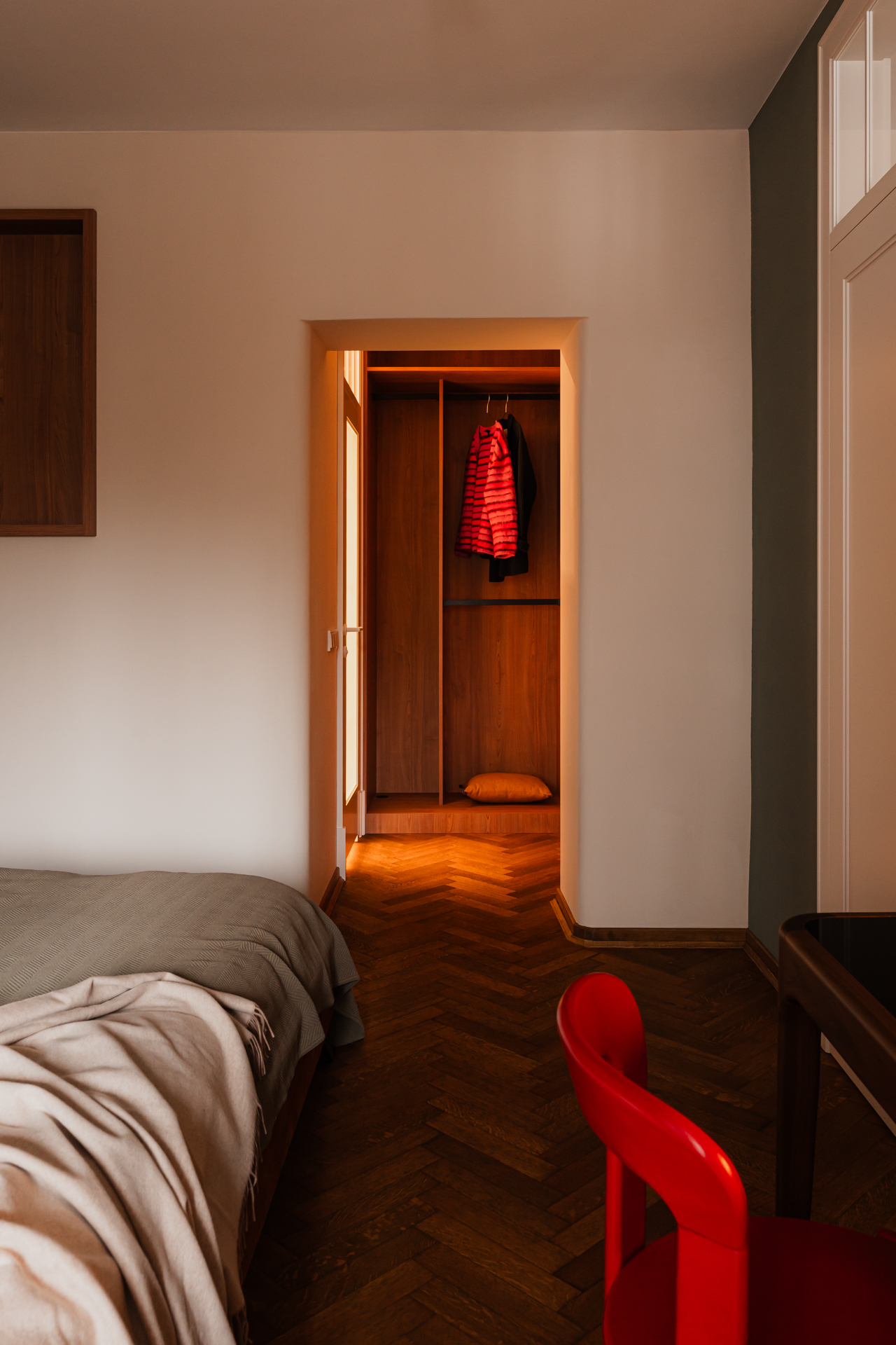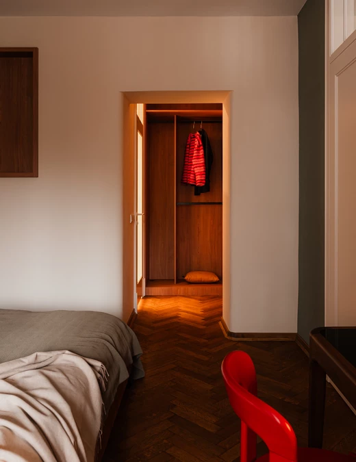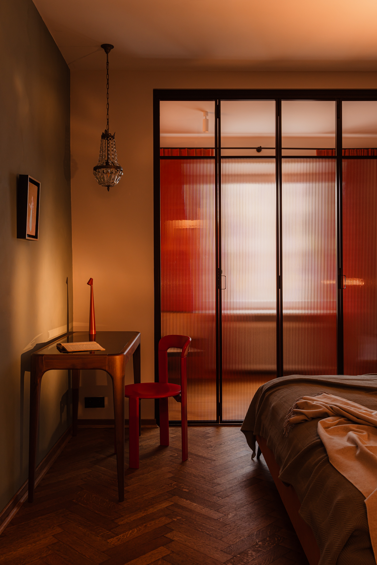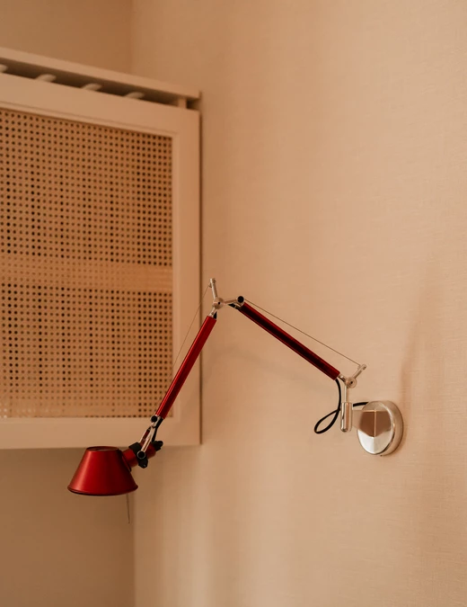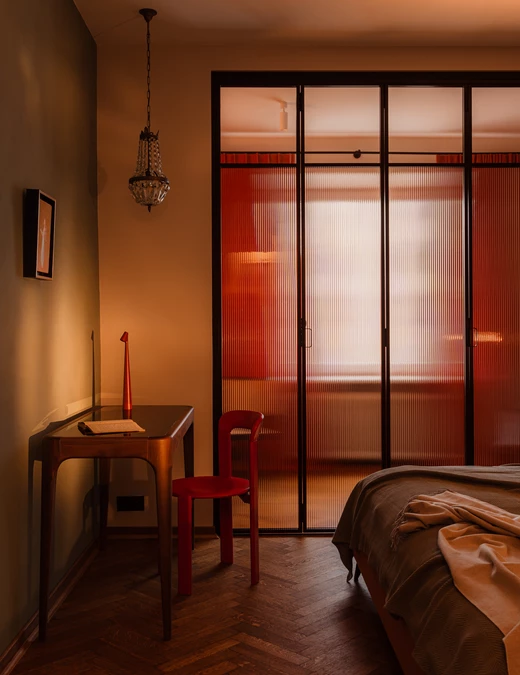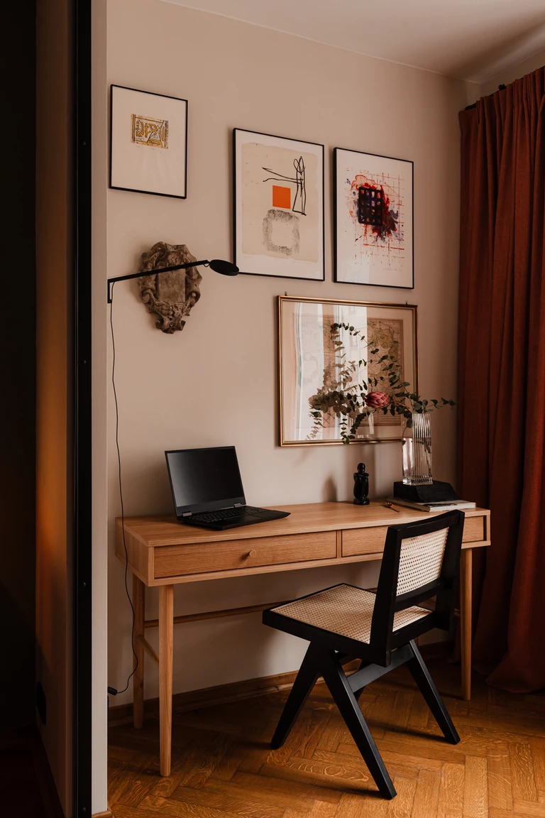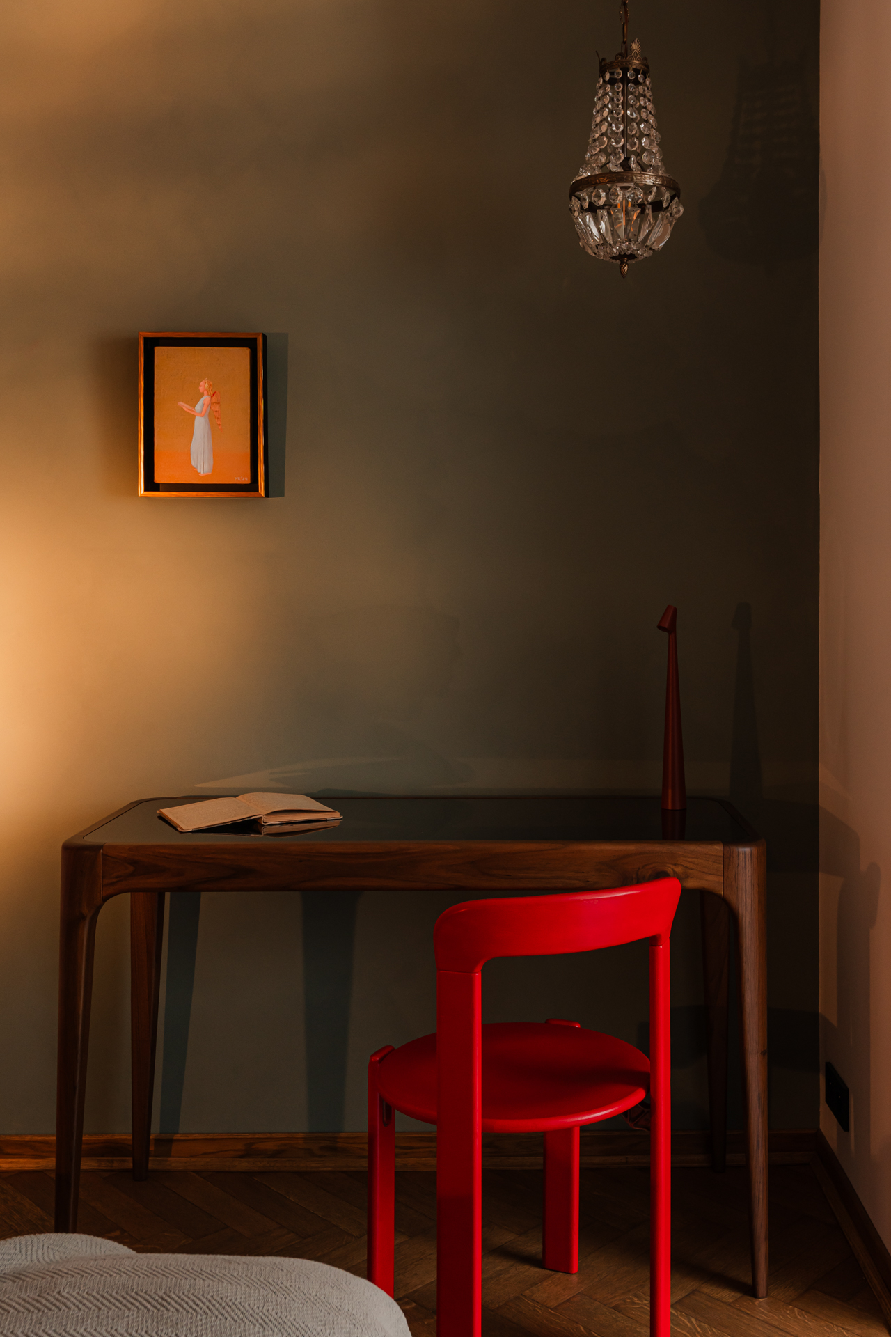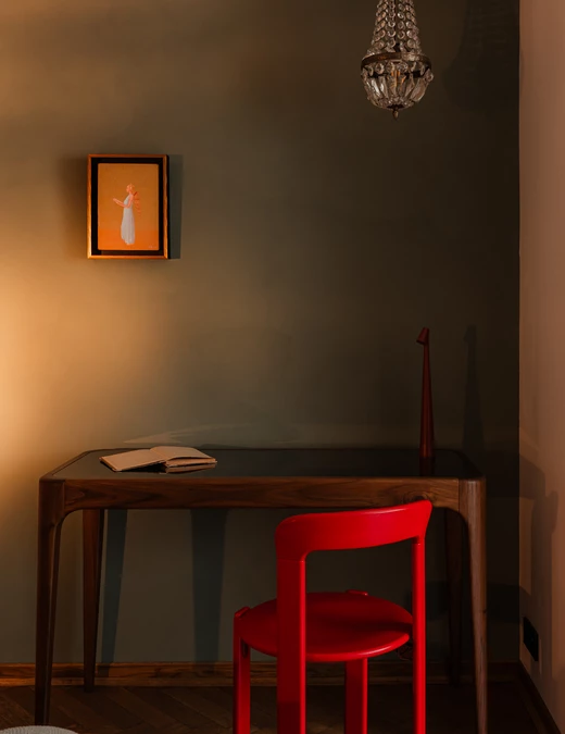 Do minimalistycznego biurka z orzecha amerykańskiego dobrano krzesło zaprojektowane przez Bruno Raya w 1971 roku – egzemplarz z aukcji vintage w oryginalnym kolorze Ferrari red. Znalazła się tu także lampka biurkowa Africa zaprojektowana przez Francisco Gómeza Paza.