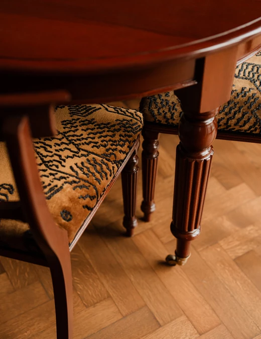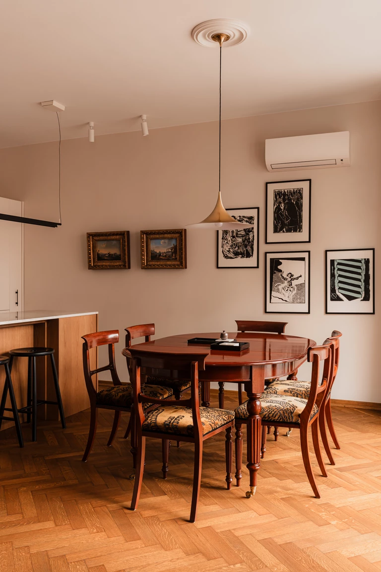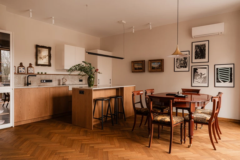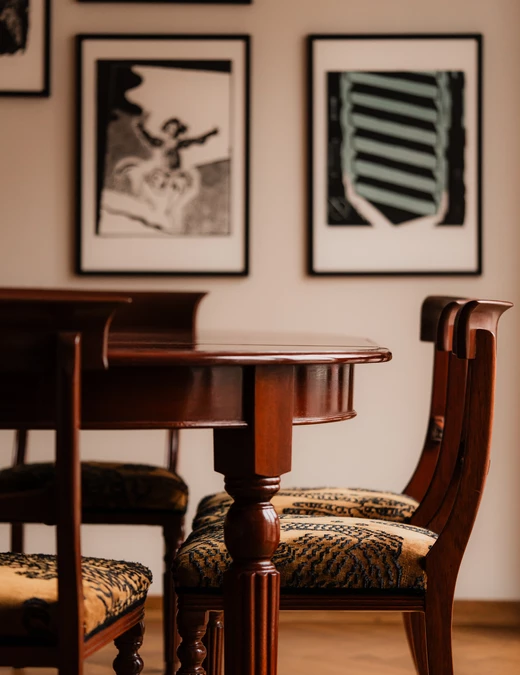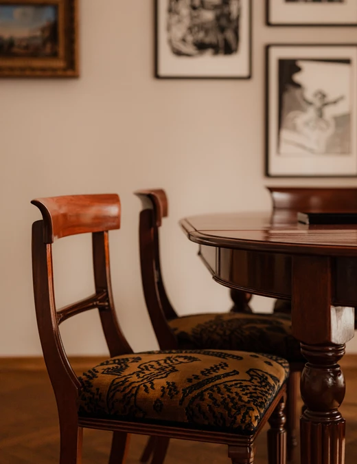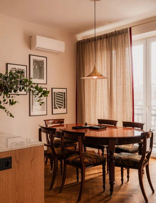 Sercem części dziennej jest historyczny stół z mahoniu i orzecha europejskiego, osadzony na toczonych nogach zakończonych mosiężnymi kółkami. Towarzyszą mu drezdeńskie krzesła o miękkiej, romantycznej linii oparć. Meble przeszły staranną renowację w jednej z warszawskich pracowni. Nad stołem zawisła lampa z mosiężnym wykończeniem z połowy XX wieku, zaprojektowana w 1955 roku przez duet: Claus Bonderup i Torsten Thorup.