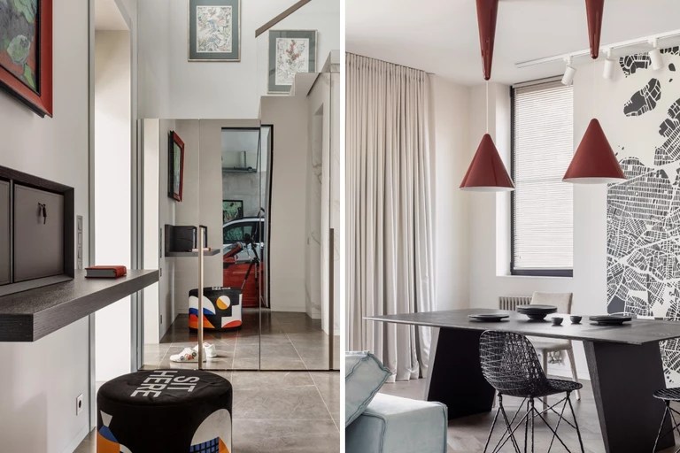 Projektantki, Tanya Guzik i Tatiana Sinitseva zadbały, by już od wejścia uwagę przyciągał zielony dziedziniec – widoczny zaraz po przekroczeniu progu, staje się naturalnym centrum salonu. Zamiast dominować nad sztuką, wnętrze zostało zaprojektowane tak, by ją podkreślać. Proste, matowe i błyszczące powierzchnie, ograniczone faktury i kontrastowe kolory tworzą ramę dla dzieł sztuki wiszących na ścianach. W salonie pojawiają się charakterystyczne elementy, jak czerwona sofa czy nietypowa rzeźba. Śmiała estetyka pop-artu przeplata się tu z funkcjonalnością i komfortem.