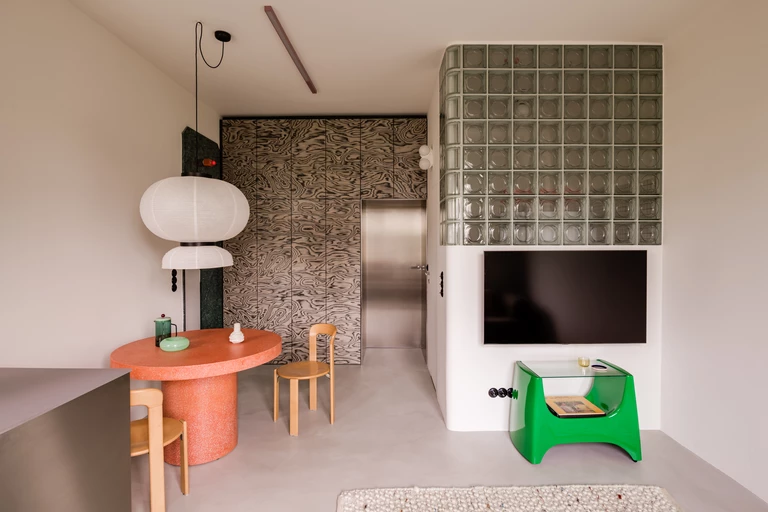 Akcent numer dwa wita gości mieszkania w strefie wejściowej – po przekroczeniu portalu wykończonego brazylijskim zielonym marmurem ich oczom ukazuje się iście psychodeliczny motyw, który wprawdzie stworzyła natura, ale dopracował postmodernista Ettore Sottsass. To zabudowa mieszcząca szafę wykończona efektownym fornirem, który Sottsass zaprojektował w 1985 roku. Ukłonem w stronę barwnej estetyki Grupy Memphis jest kolorystyka okrągłego stołu wykonanego z różowego lastryko oraz przyjemne obłości krzeseł projektu Bruno Rey’a (vintage).