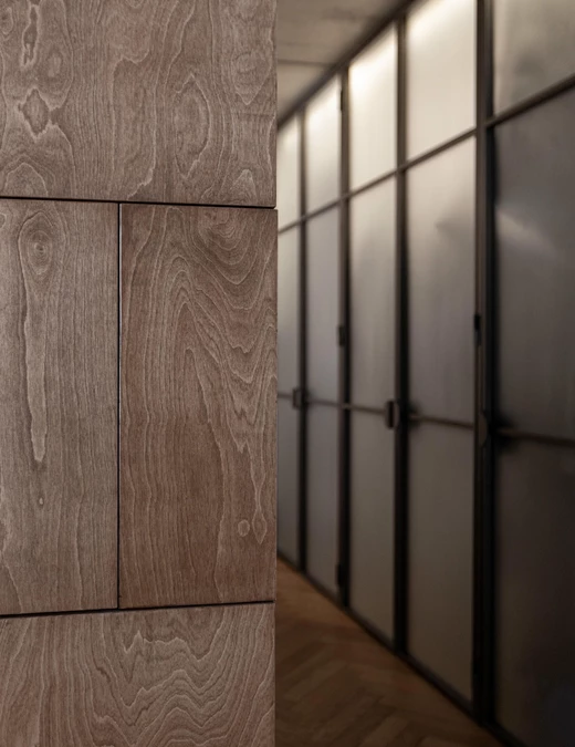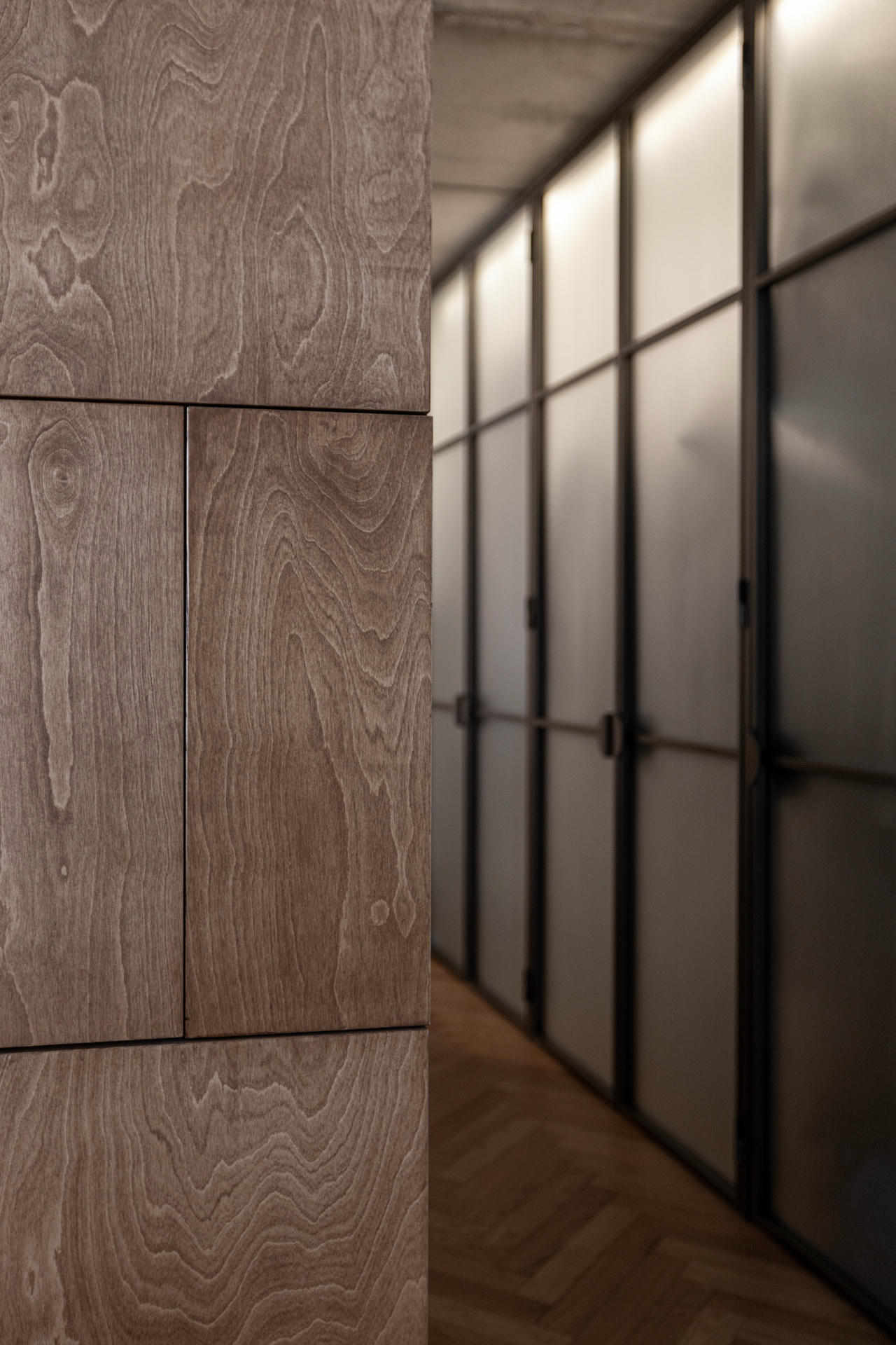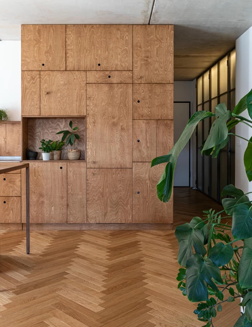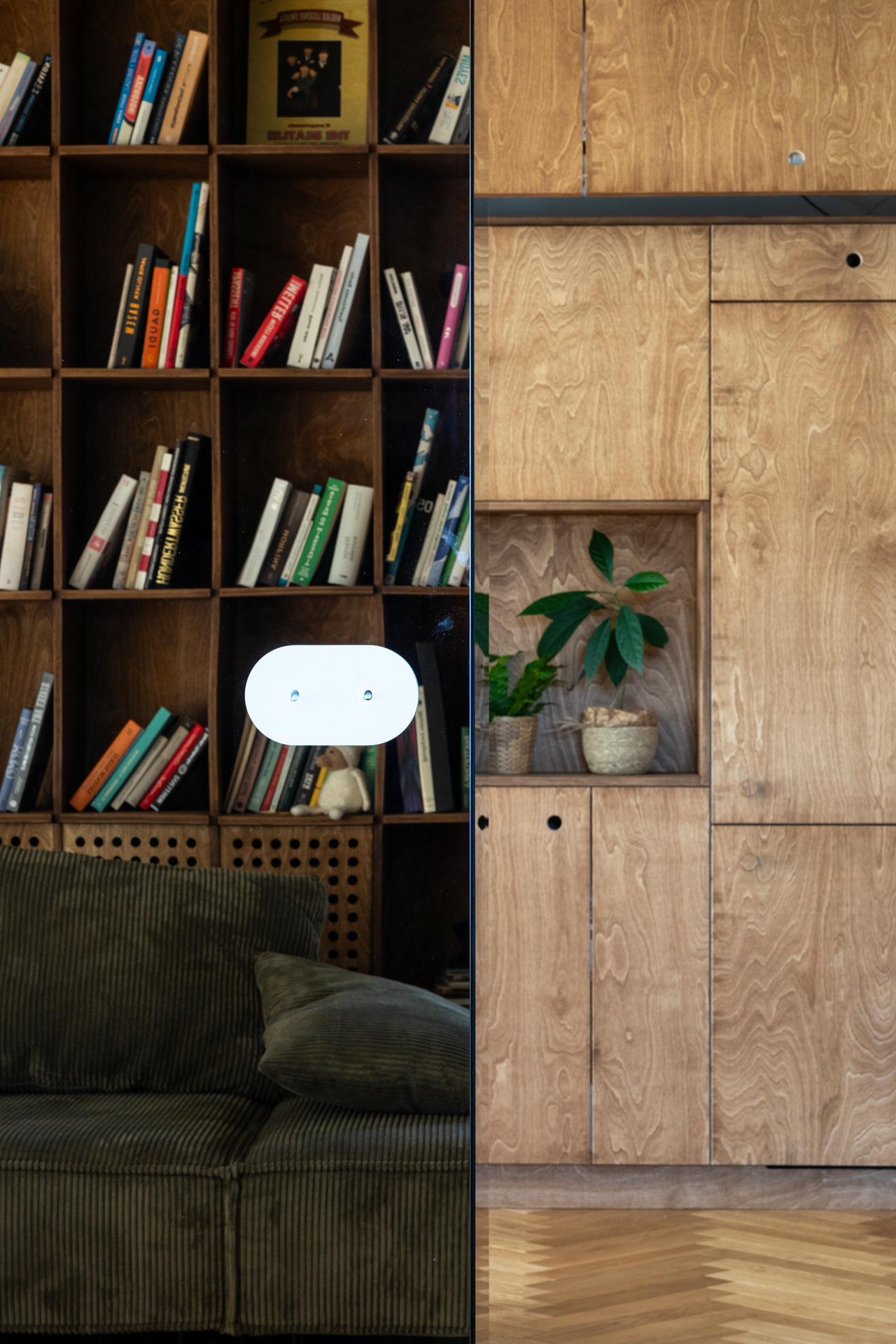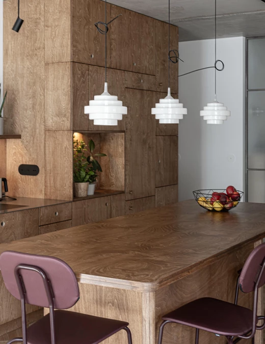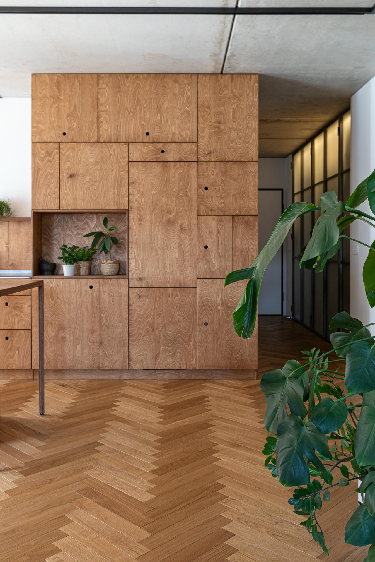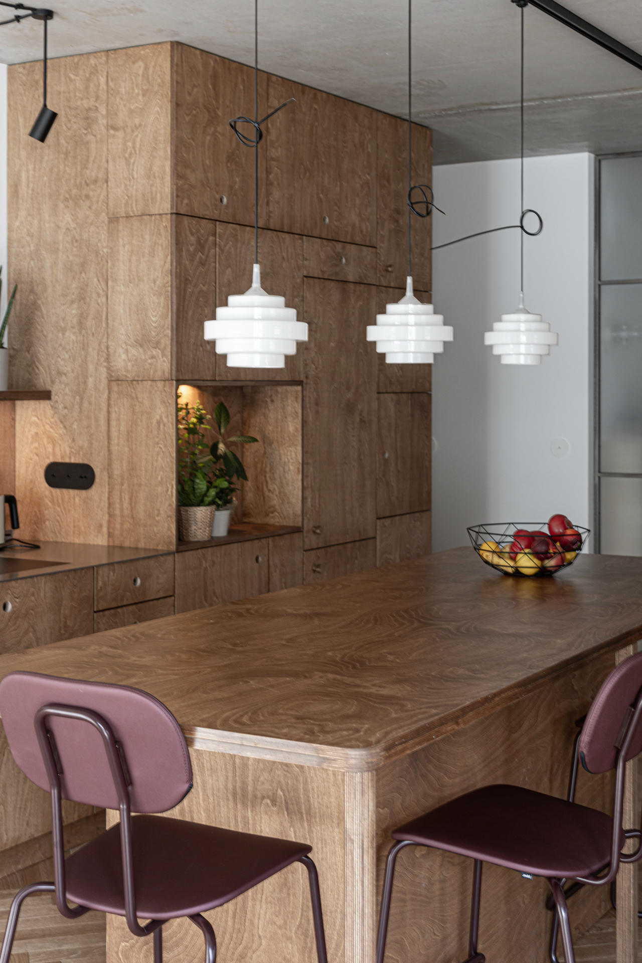 Motywem przewodnim wnętrza stała się sklejka, która pojawia się w większości pomieszczeń, dzięki czemu tworzy spójne i ciepłe tło.