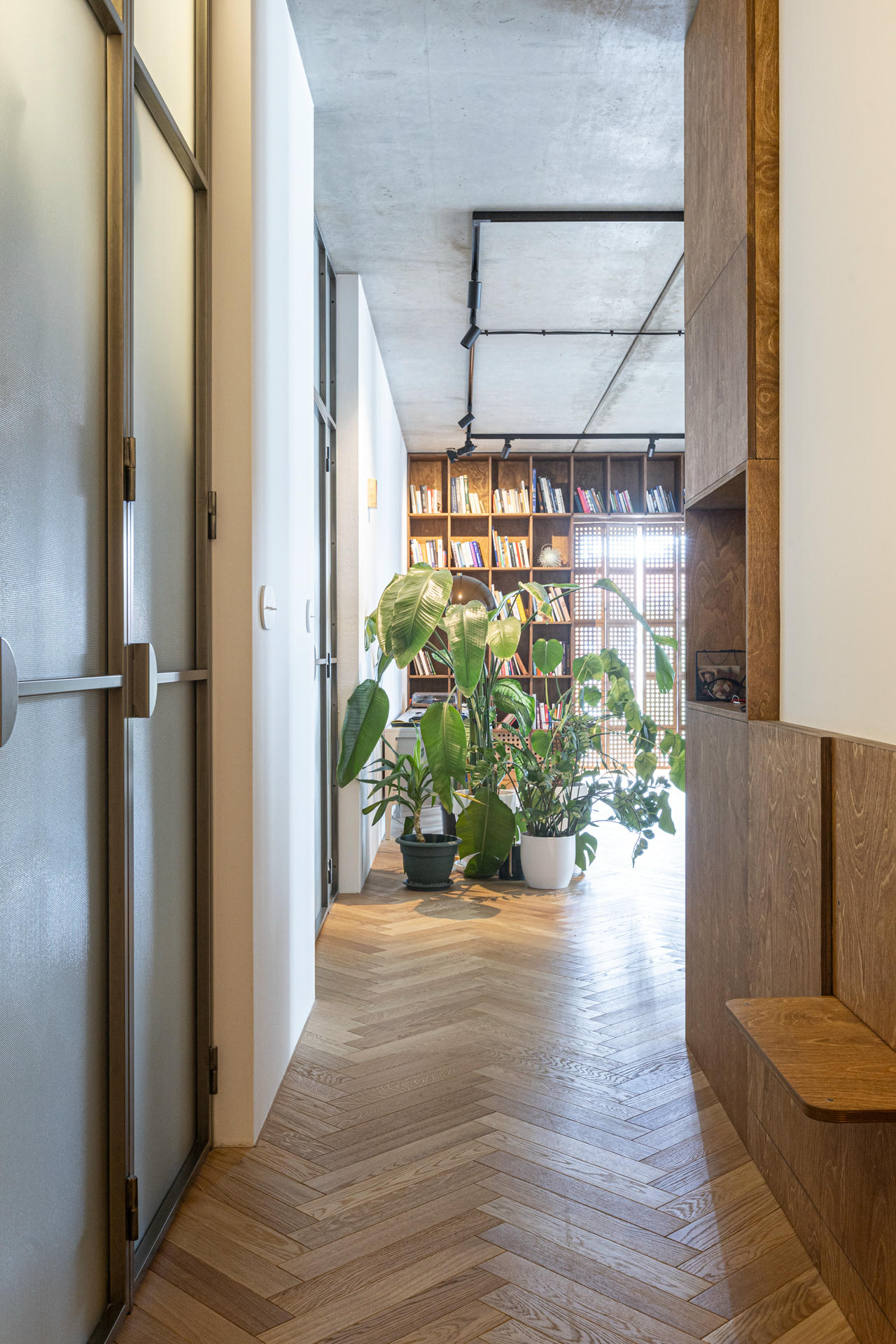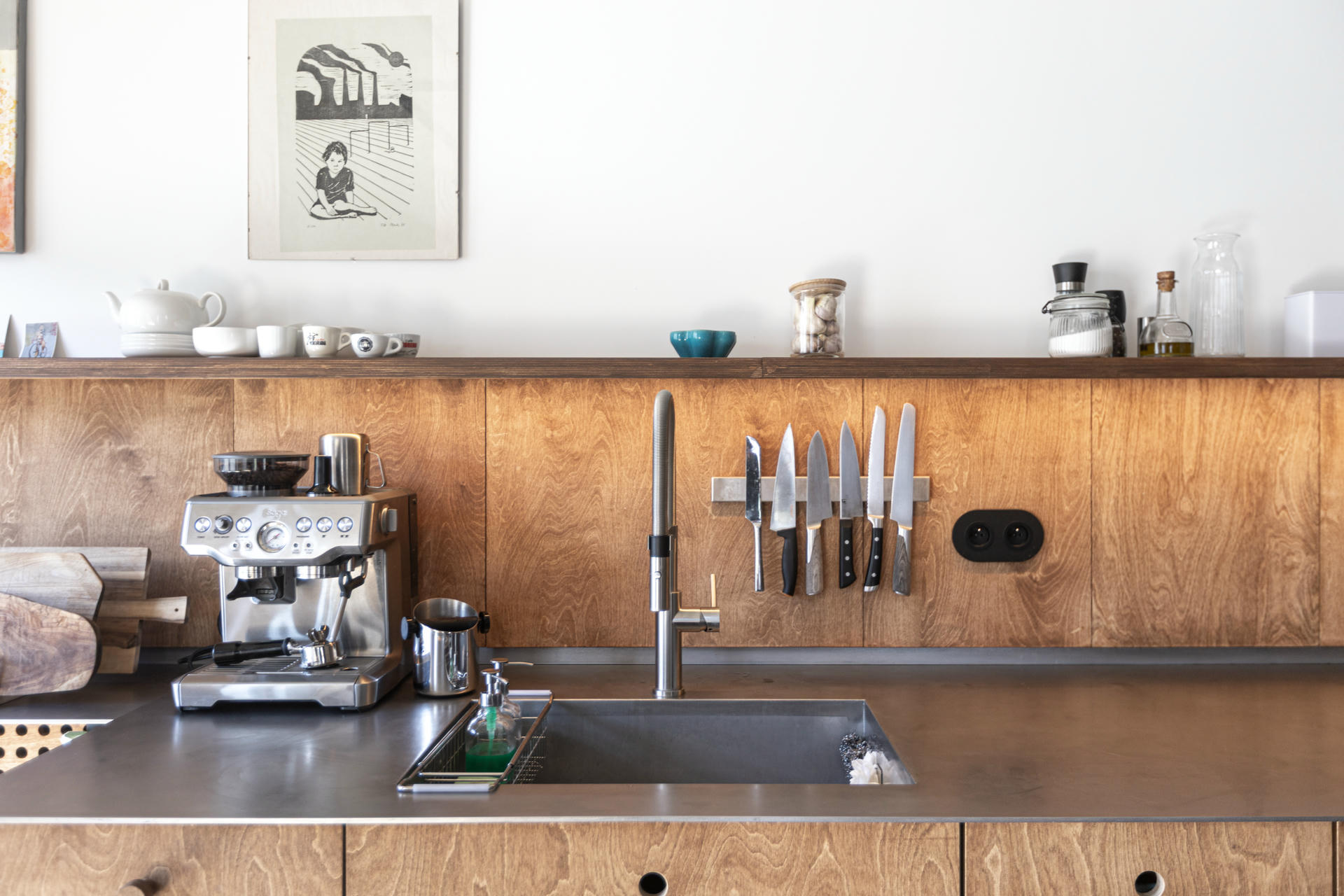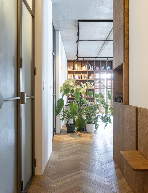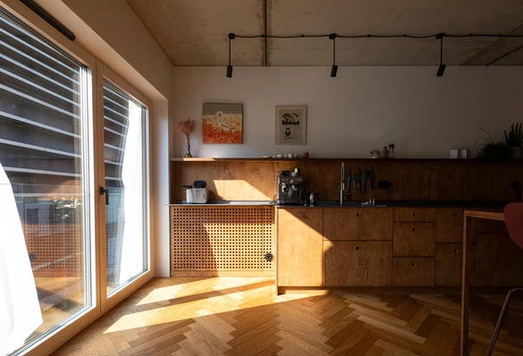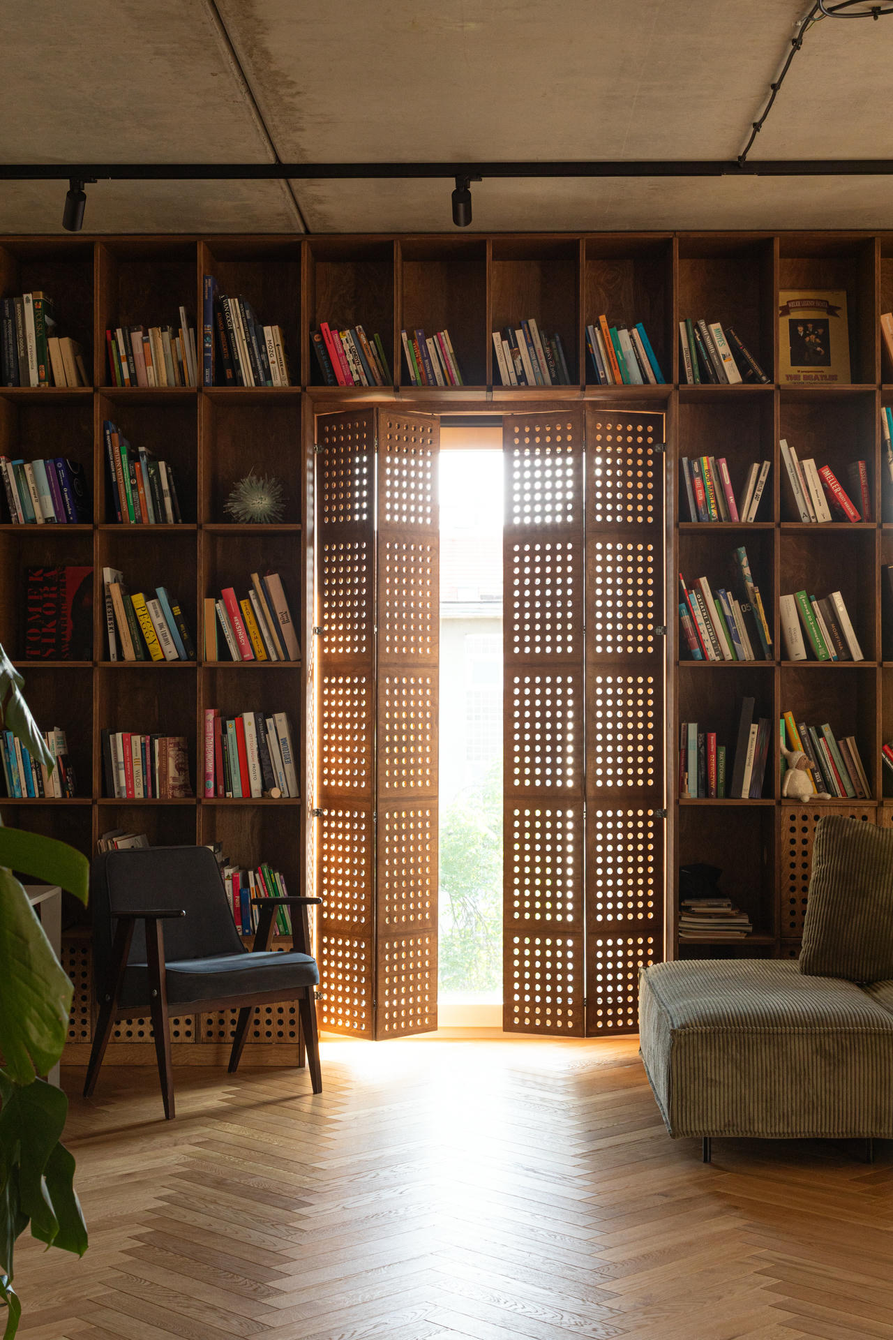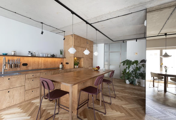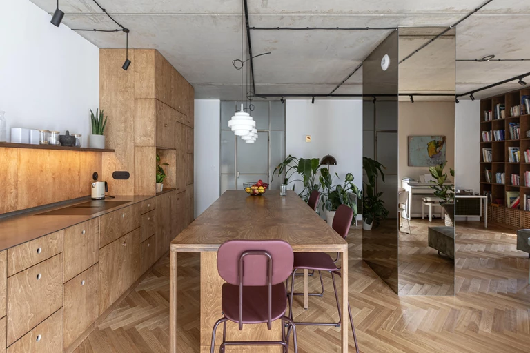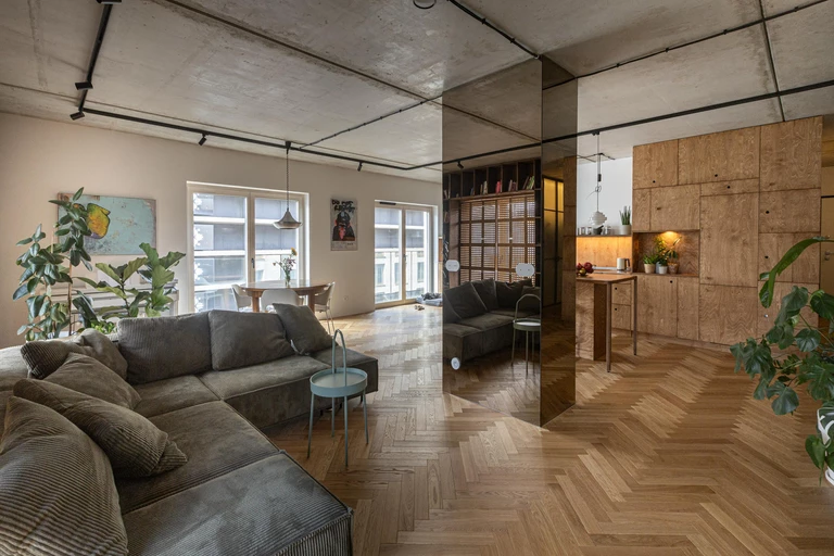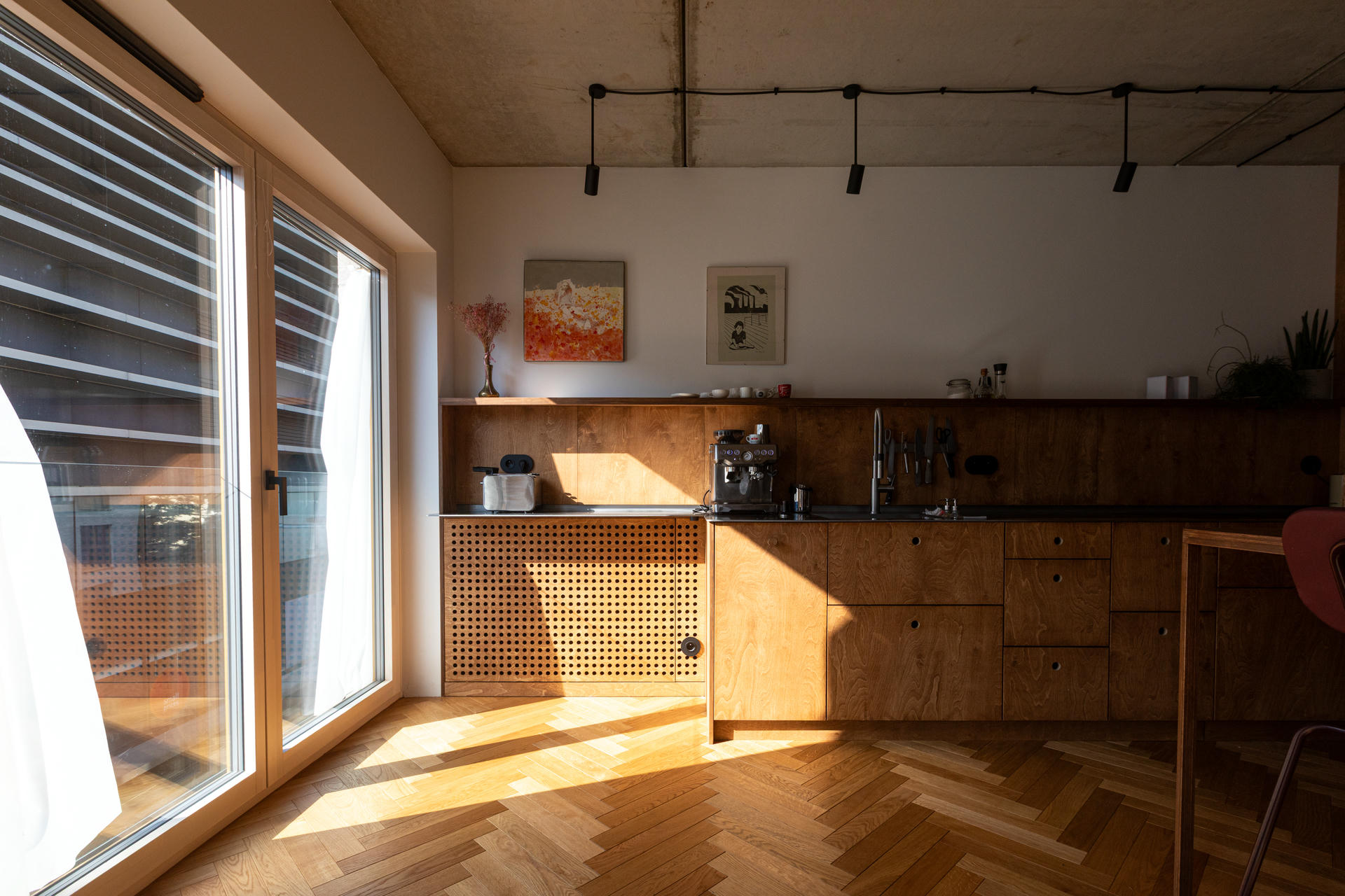 Motywem przewodnim wnętrza stała się sklejka, która pojawia się w większości pomieszczeń, dzięki czemu tworzy spójne i ciepłe tło.