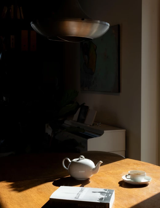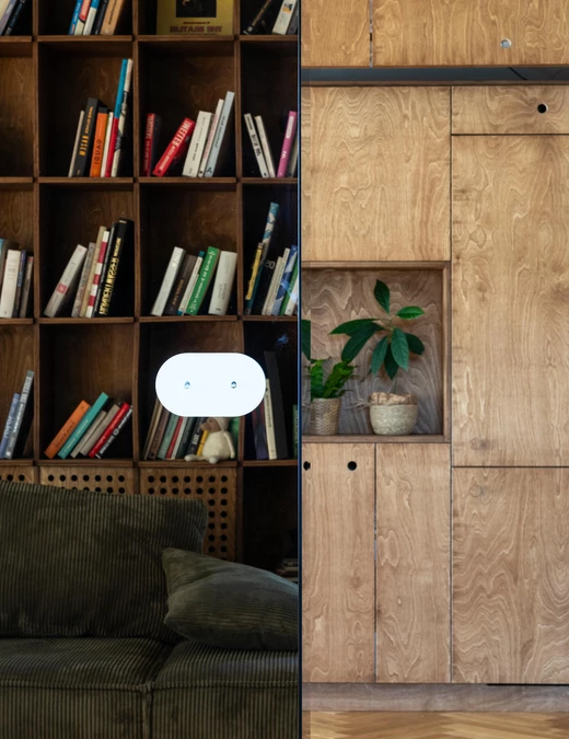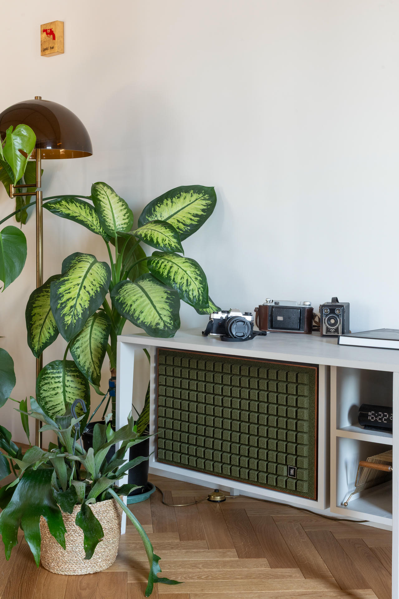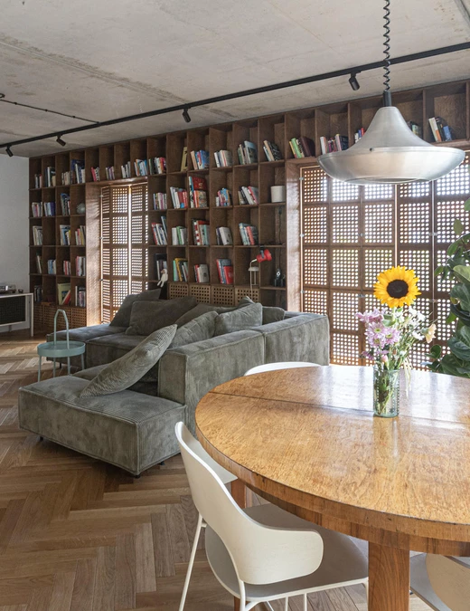 Kompozycję uzupełniają kwiaty, obrazy i książki, które nadają przestrzeni koloru, rytmu i osobistego wymiaru. Dzięki nim wnętrze staje się nie tylko uporządkowane pod względem materiałowym, lecz także pełne życia.