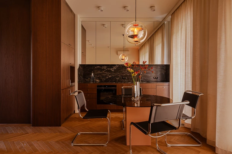 W części dziennej znalazły się charakterystyczne meble, m.in. skórzane fotele Ligne Roset oraz stół z graficzną lampą zawieszoną nad blatem. Aneks kuchenny tworzy nieco cięższa kompozycja naturalnego kamienia, chromowanych detali i minimalistycznej stolarki w ciepłych odcieniach drewna. Zabudowa kuchni miękko zaokrągla się, przechodząc w ścianę hallu – to jeden z przykładów organicznych form obecnych w całym projekcie.