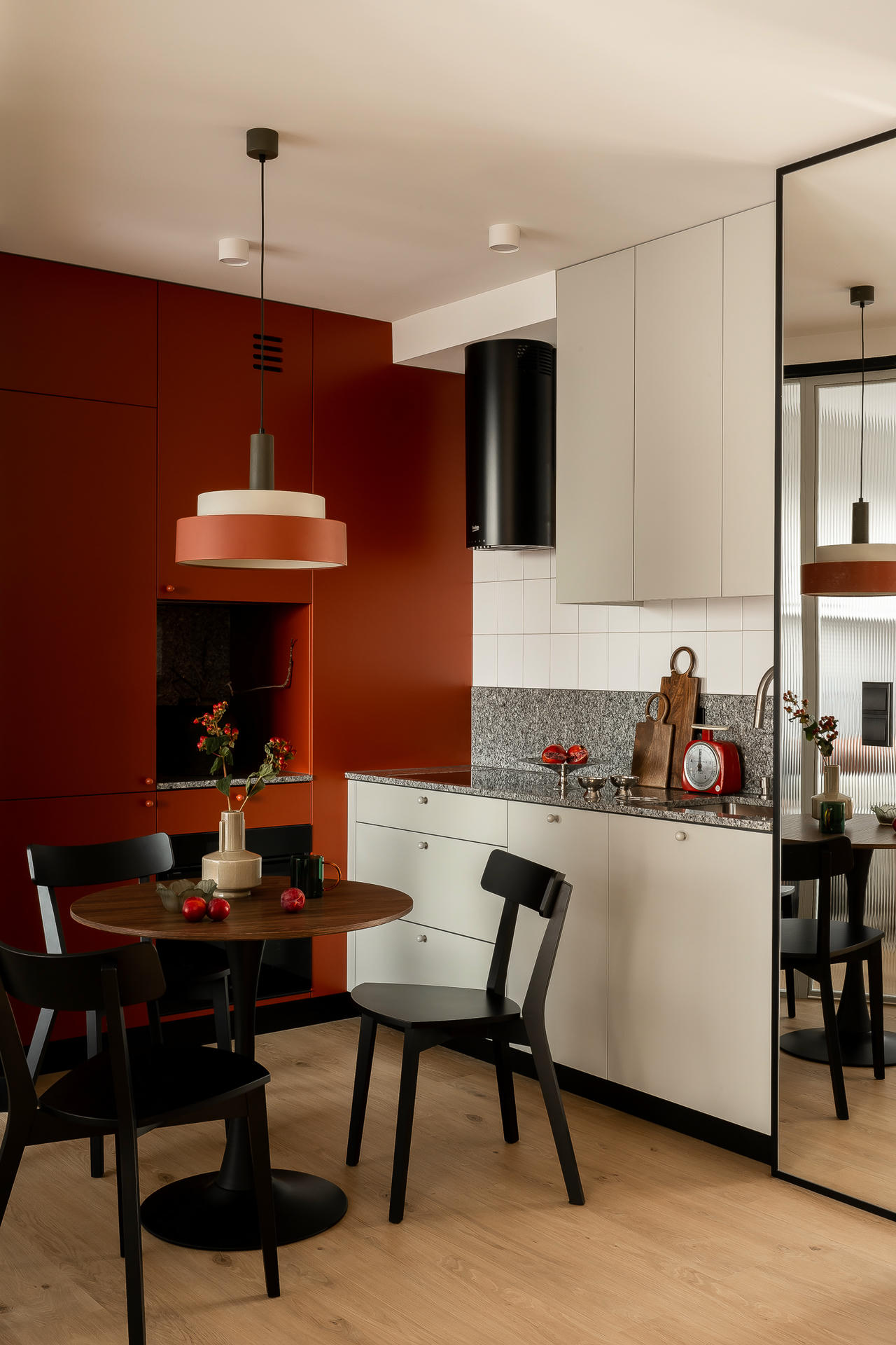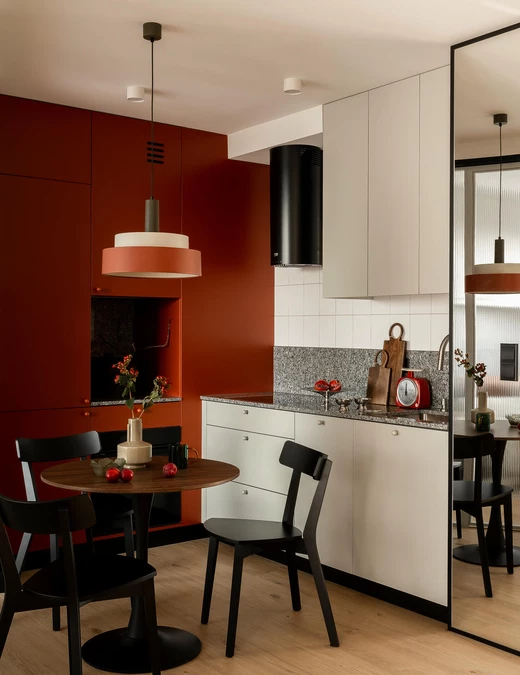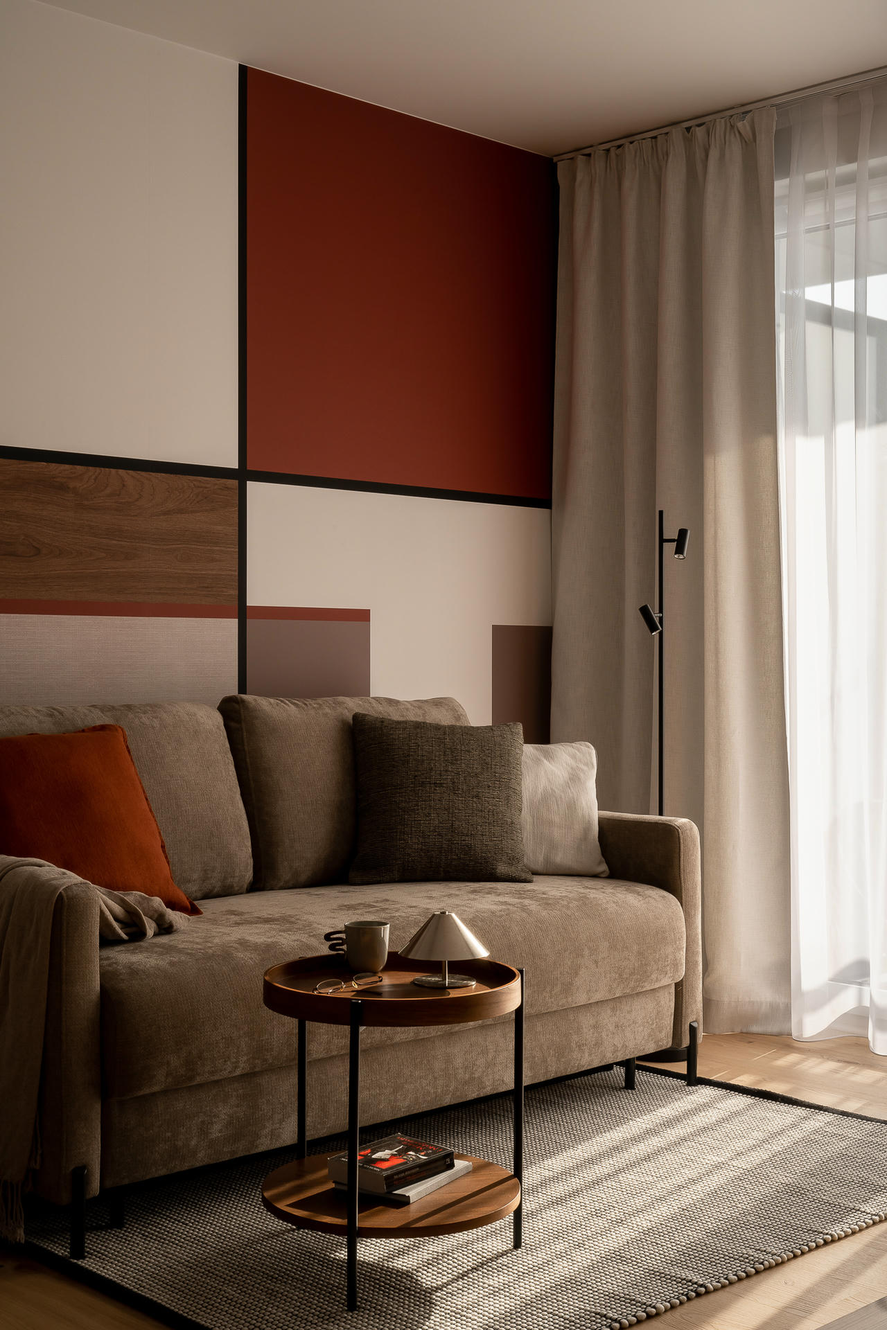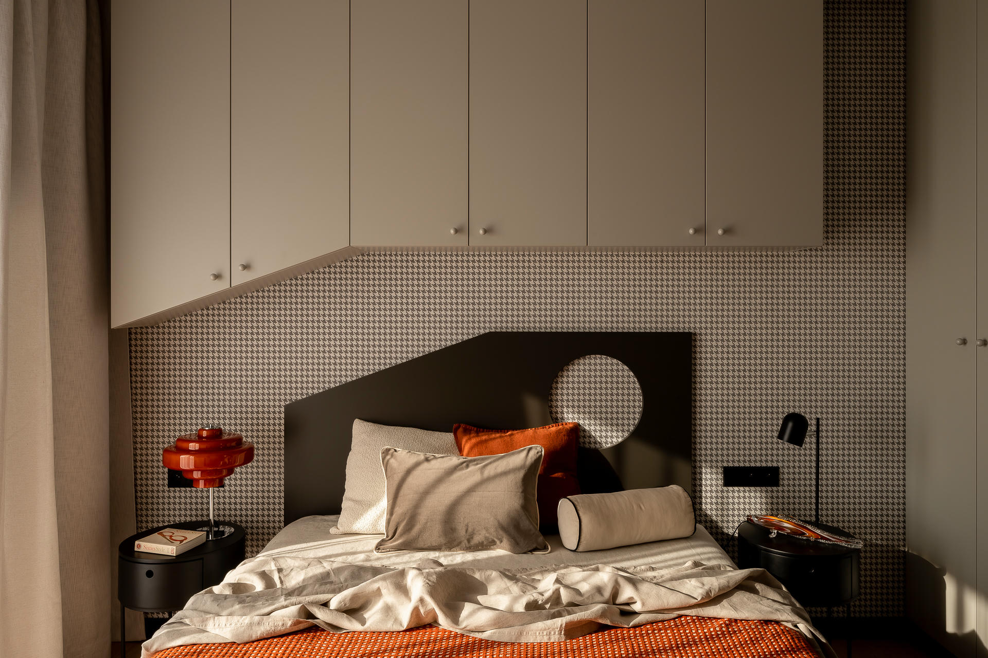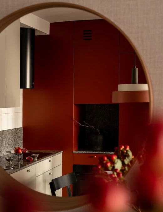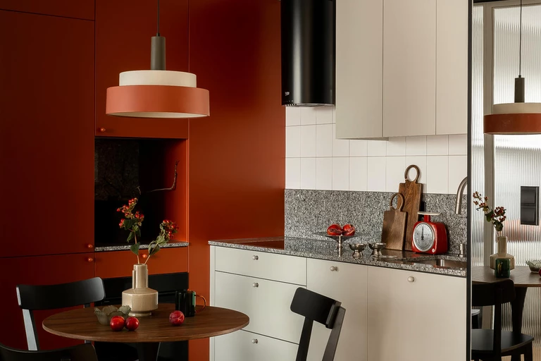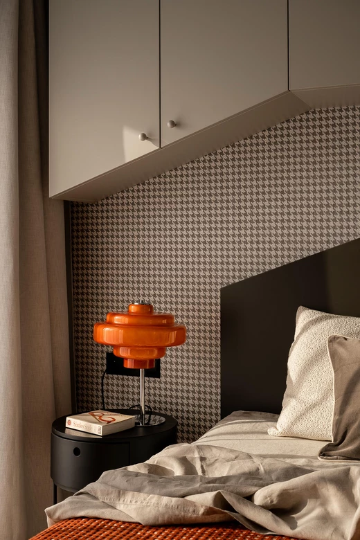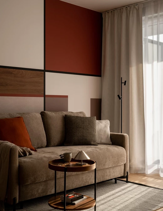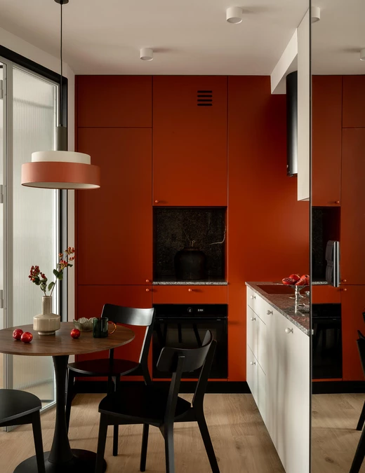 Bazą aranżacji są odcienie beżu, które ożywiają akcenty ceglastej czerwieni i pomarańczu. Intensywniejsze barwy pojawiają się na frontach mebli, w oświetleniu i dodatkach, budując charakter wnętrza. Całość dopełniają czarne detale – listwy przypodłogowe i metalowe elementy – które jawią się niby graficzny kontur.