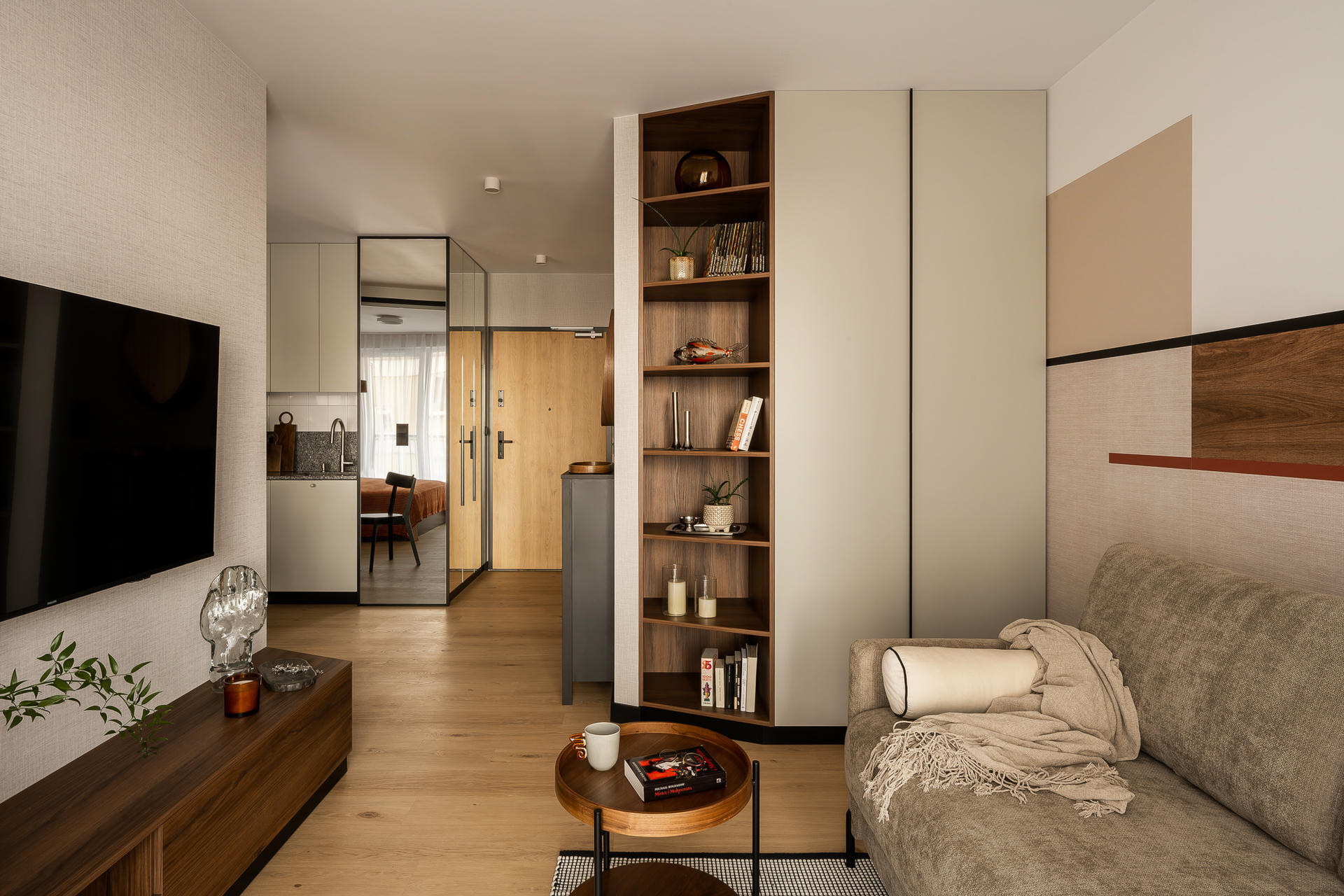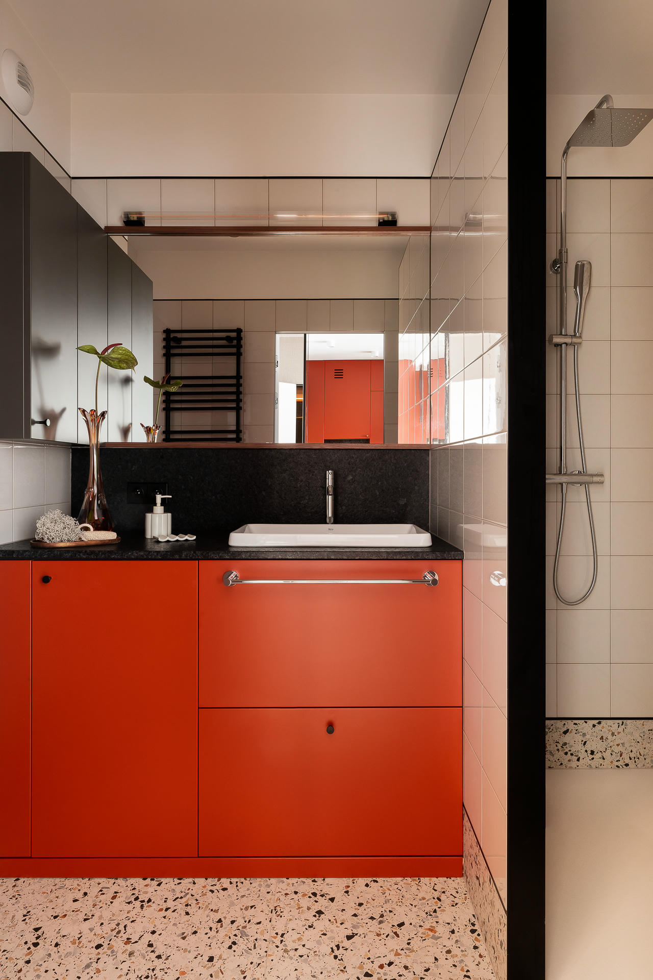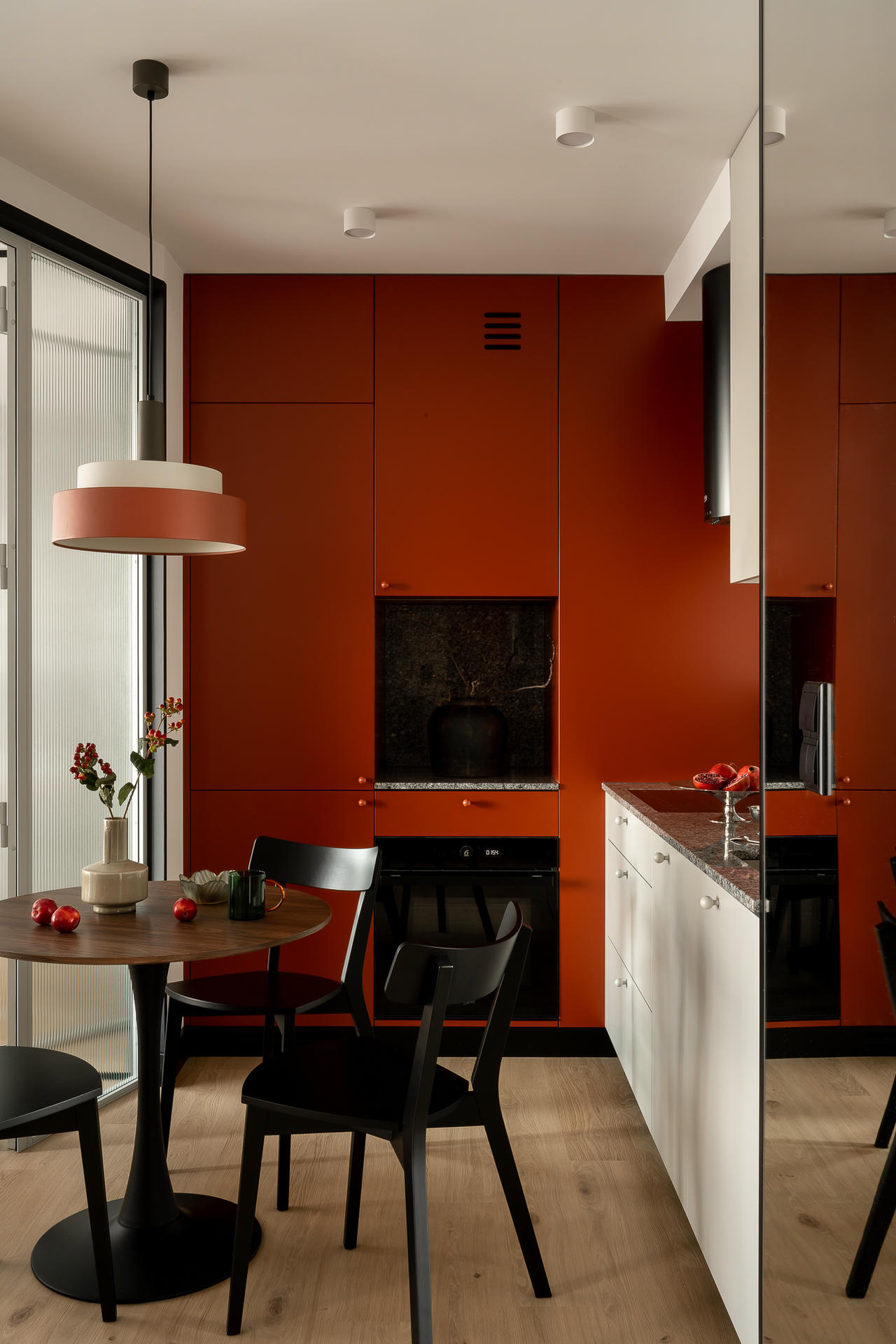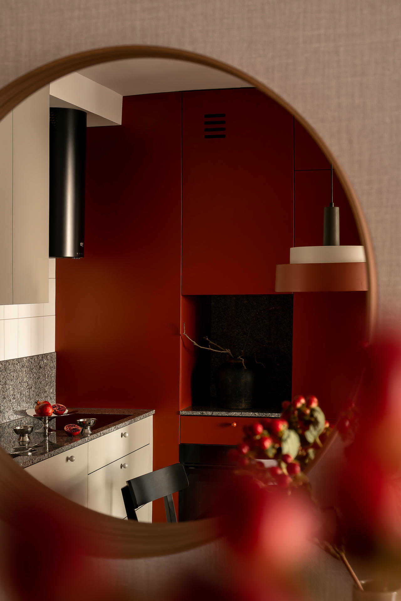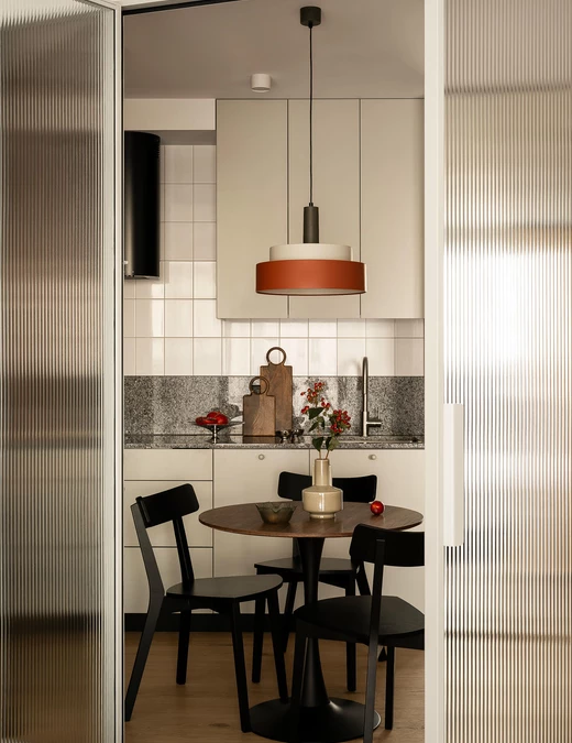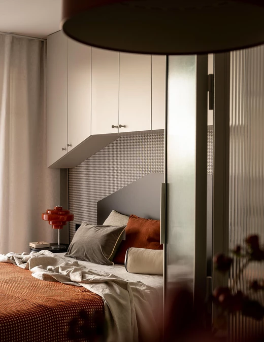 Bazą aranżacji są odcienie beżu, które ożywiają akcenty ceglastej czerwieni i pomarańczu. Intensywniejsze barwy pojawiają się na frontach mebli, w oświetleniu i dodatkach, budując charakter wnętrza. Całość dopełniają czarne detale – listwy przypodłogowe i metalowe elementy – które jawią się niby graficzny kontur.