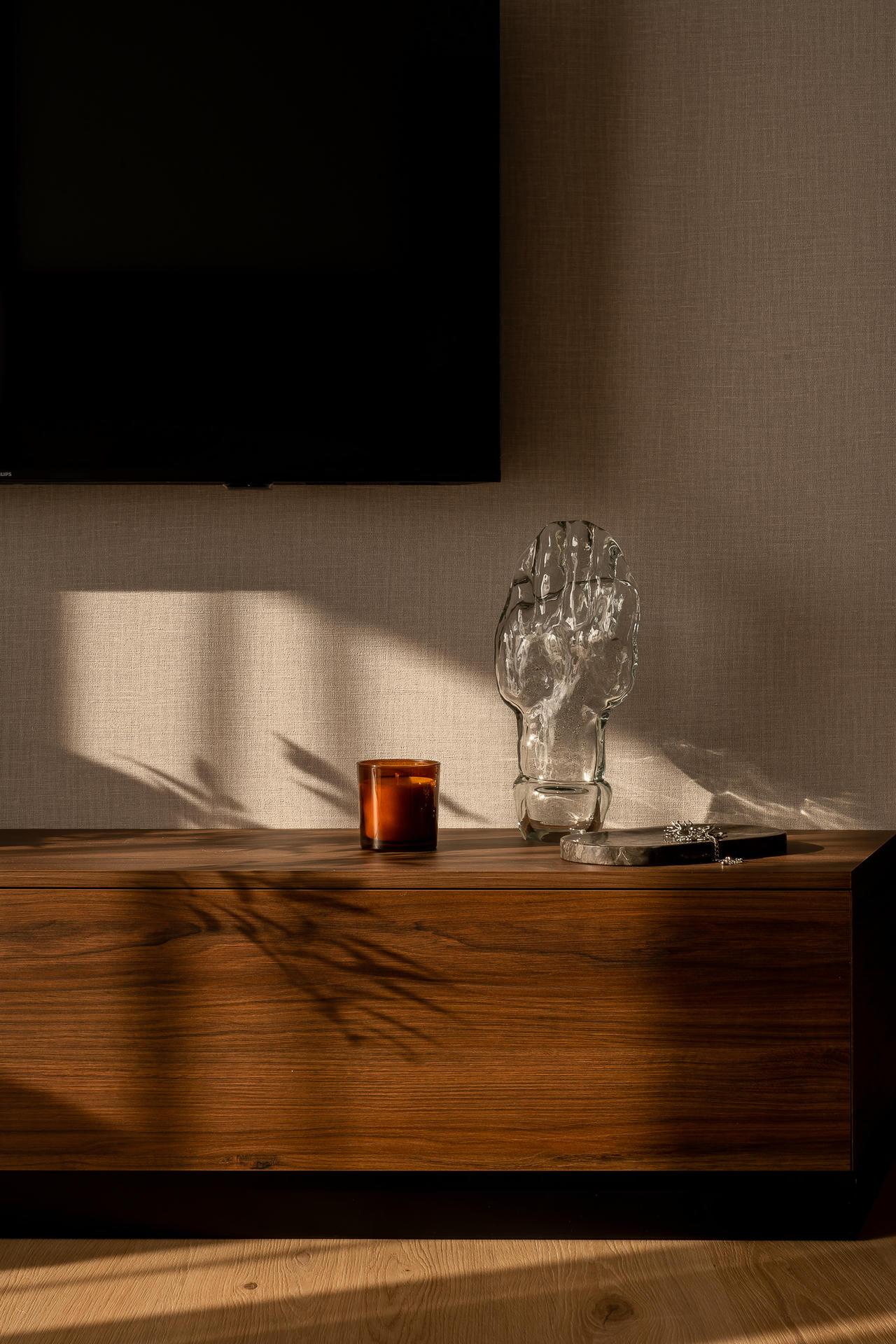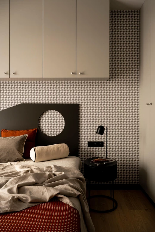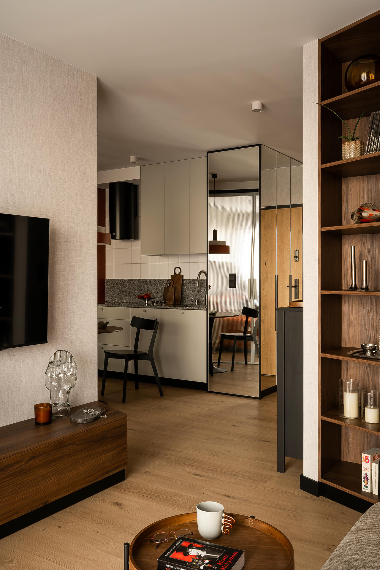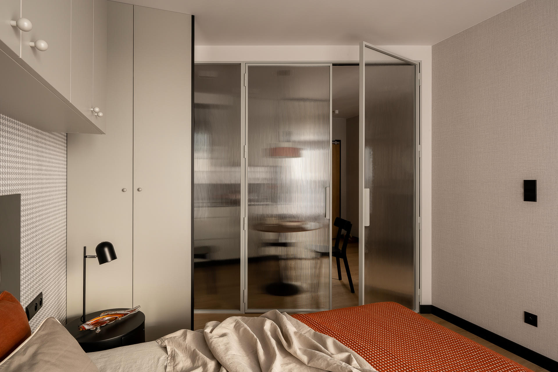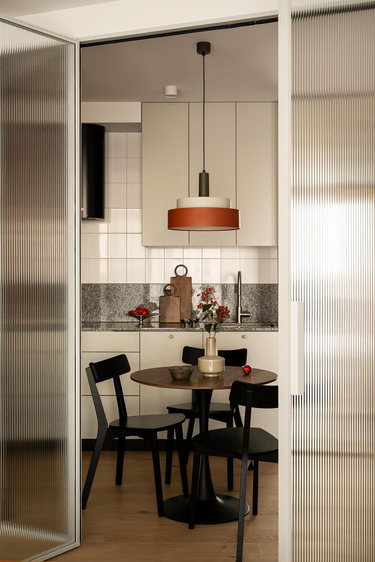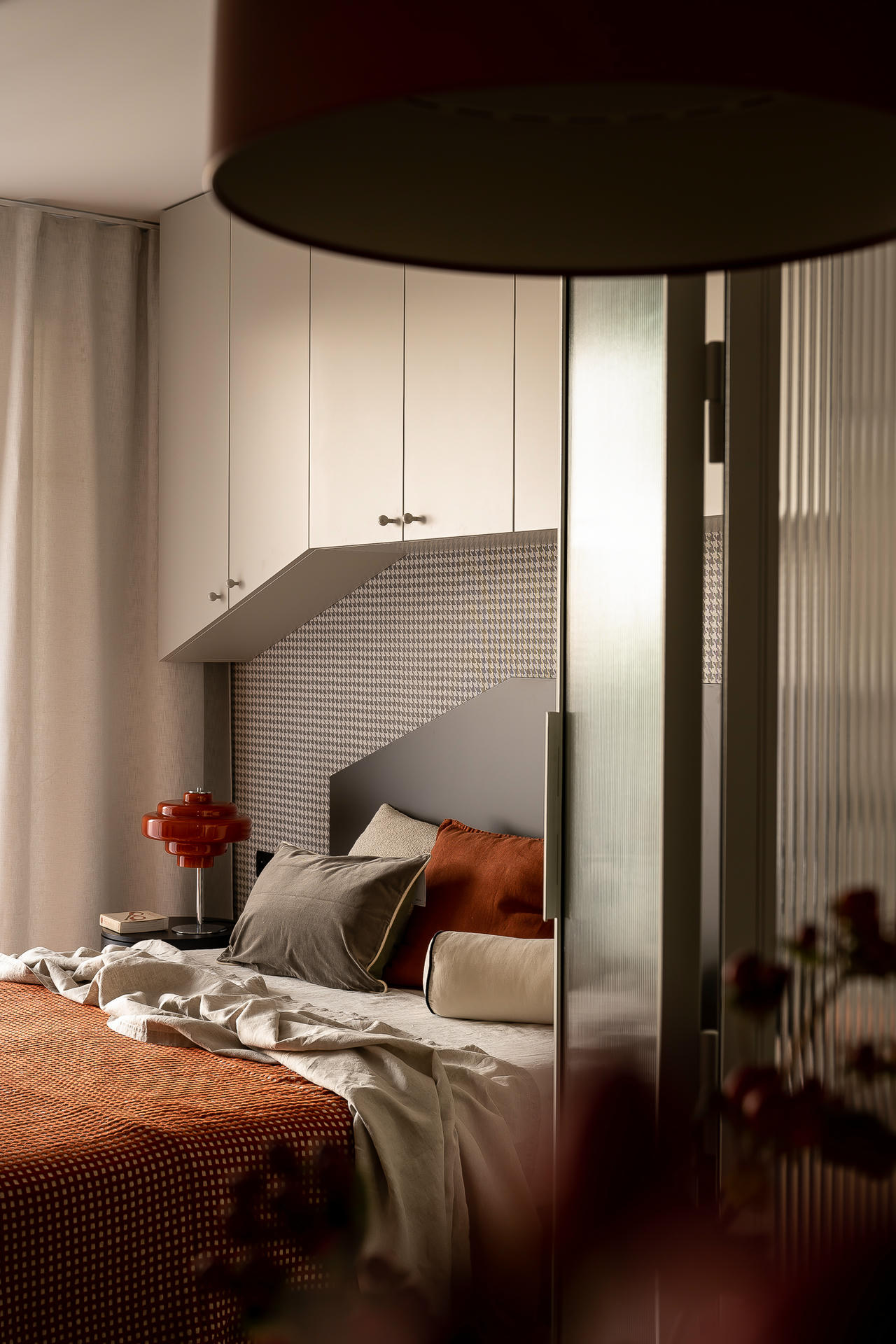 Bazą aranżacji są odcienie beżu, które ożywiają akcenty ceglastej czerwieni i pomarańczu. Intensywniejsze barwy pojawiają się na frontach mebli, w oświetleniu i dodatkach, budując charakter wnętrza. Całość dopełniają czarne detale – listwy przypodłogowe i metalowe elementy – które jawią się niby graficzny kontur.