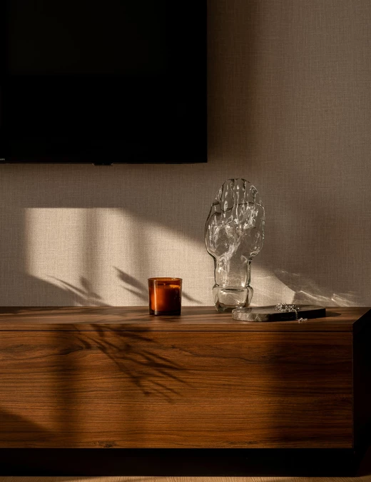 „Jednym z priorytetów w tym projekcie były blaty z kamienia naturalnego w kuchni i w łazience. Inwestorzy cenią sobie trwałość tego materiału i jego ponadczasowy charakter, dlatego miejsce na nie od początku znalazło się w budżecie” – wyjaśnia Anna Rybacka. W kuchni ciekawym rozwiązaniem okazało się dodatkowe miejsce robocze we wnęce nad piekarnikiem, które stało się idealną przestrzenią na ekspres do kawy i jednocześnie wzbogaciło formę zabudowy.