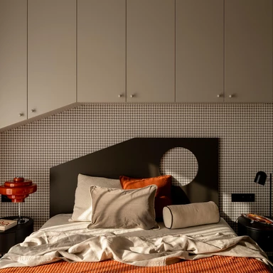 „Skos w układzie mieszkania nadał dynamiki aranżacji. Potem został powielony w kilku detalach mebli, między innymi w skosie szafek wiszących w sypialni, w zagłówku łóżka oraz w skośnym zakończeniu regału w pokoju dziennym. Ten zabieg całkowicie zmienił odbiór przestrzeni”.