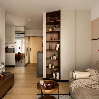 Większość mebli powstała na wymiar, dzięki czemu każdy centymetr został dobrze wykorzystany. Zabudowa w strefie wejścia płynnie przechodzi w kuchnię, w sypialni oprócz szafy znalazł się ciąg szafek nad łóżkiem, a w salonie pojemna szafa, regał i niewielkie miejsce do pracy.