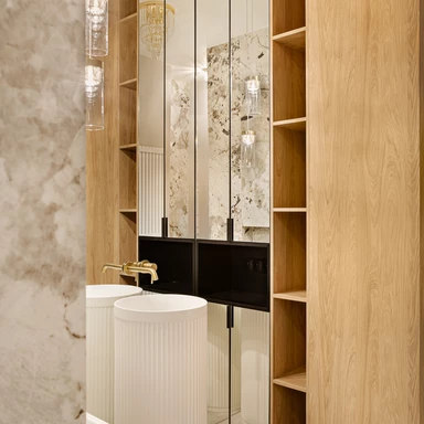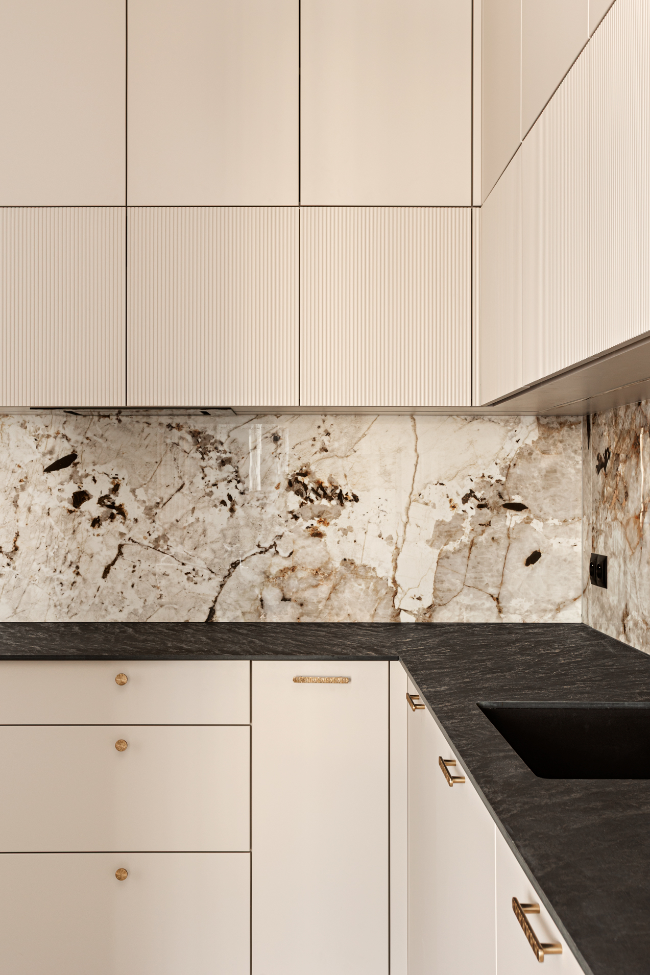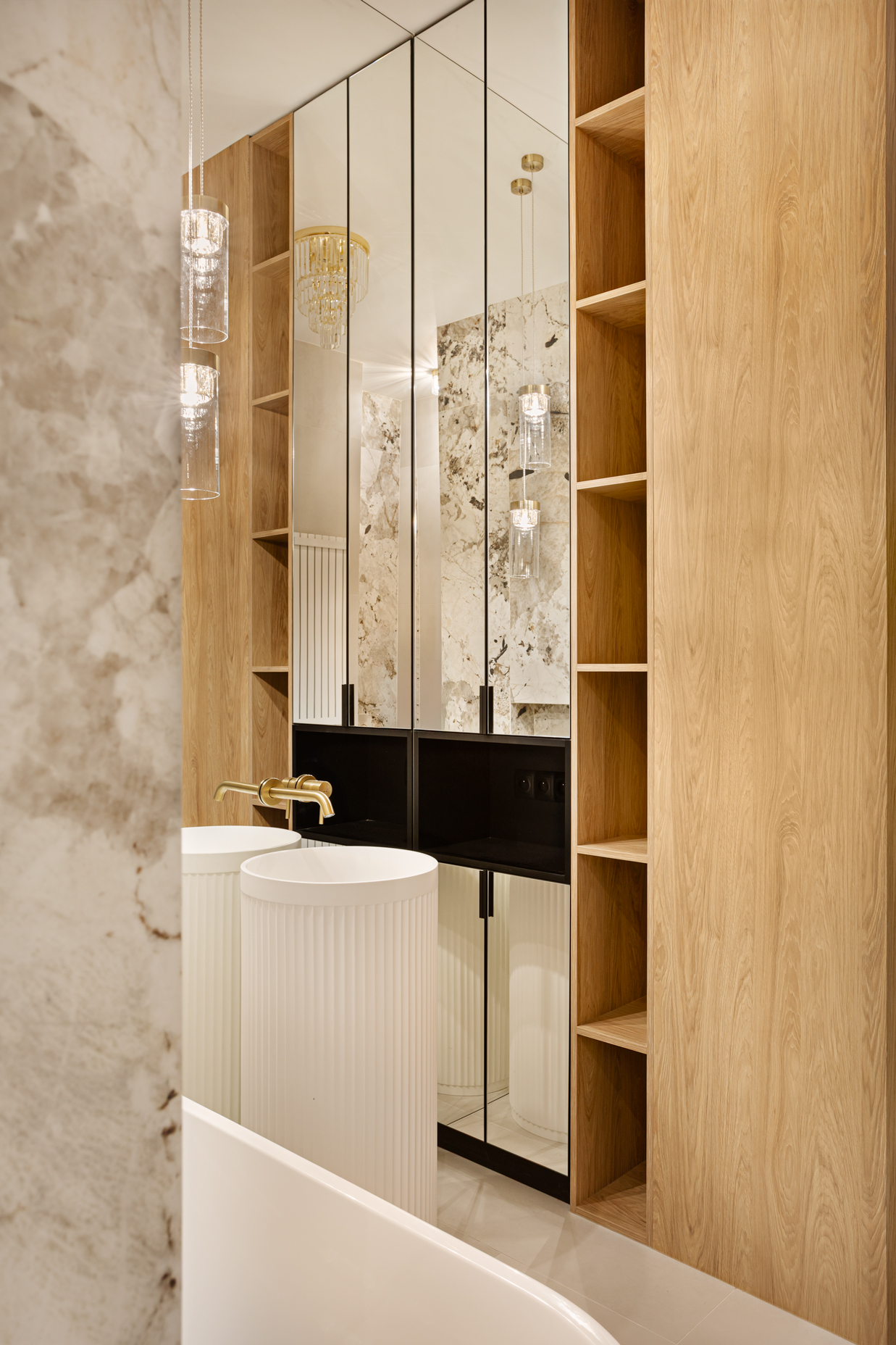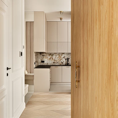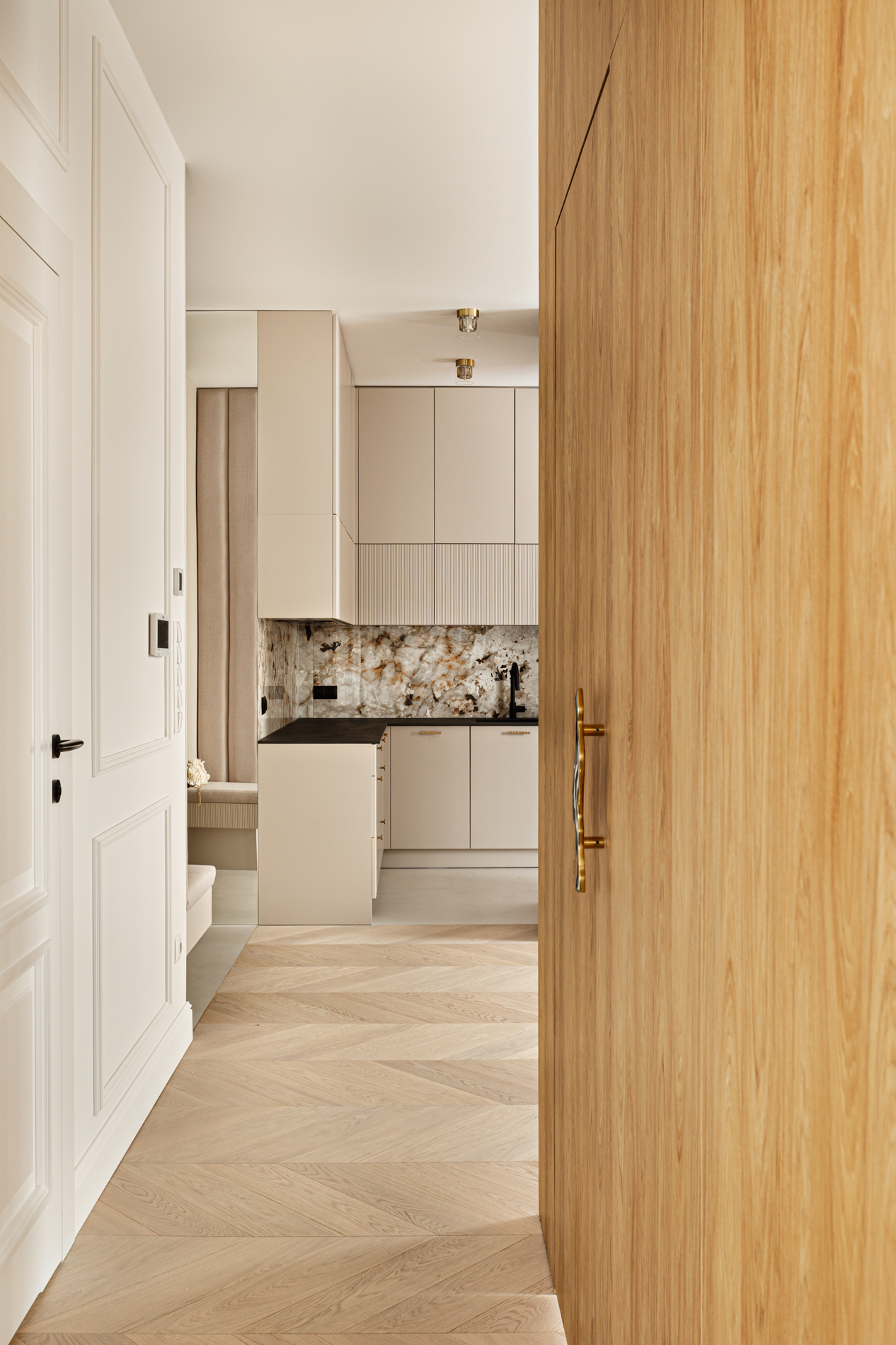 W projekcie KONC Studio szczególną rolę odgrywa precyzyjnie dobrany detal, który buduje atmosferę dopracowanego luksusu. Mosiężne uchwyty meblowe, antaby wykonane z masy perłowej oraz szkło ornamentowe nadają całości głębi i podkreślają rzemieślniczy charakter realizacji. Wszystkie te elementy tworzą spójne, ponadczasowe tło dla codzienności, które zachwyca dopracowaną formą i spokojną atmosferą, oferując wytchnienie od zgiełku panującego tuż za oknem.