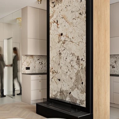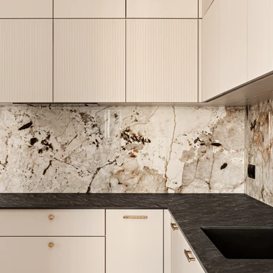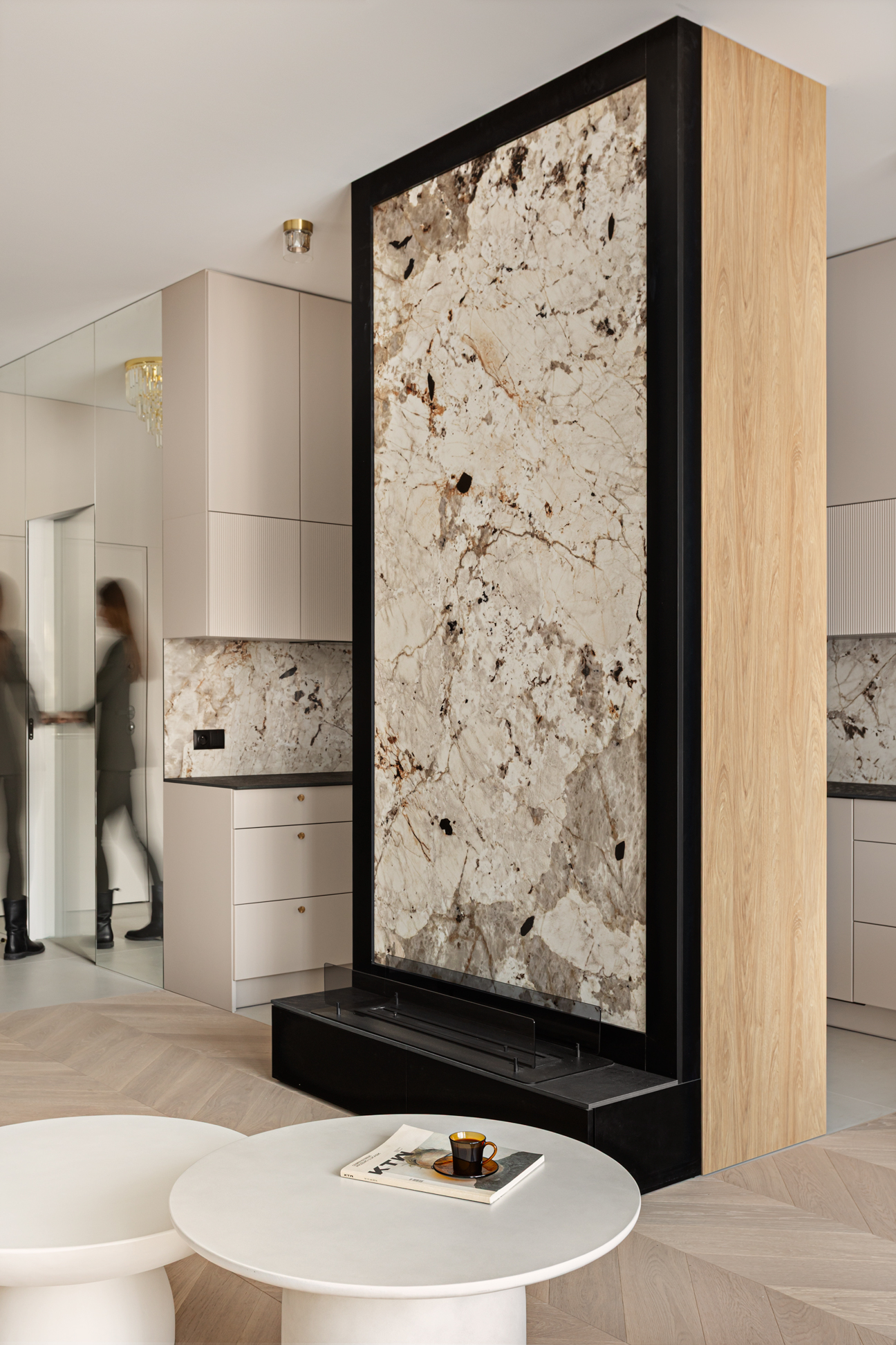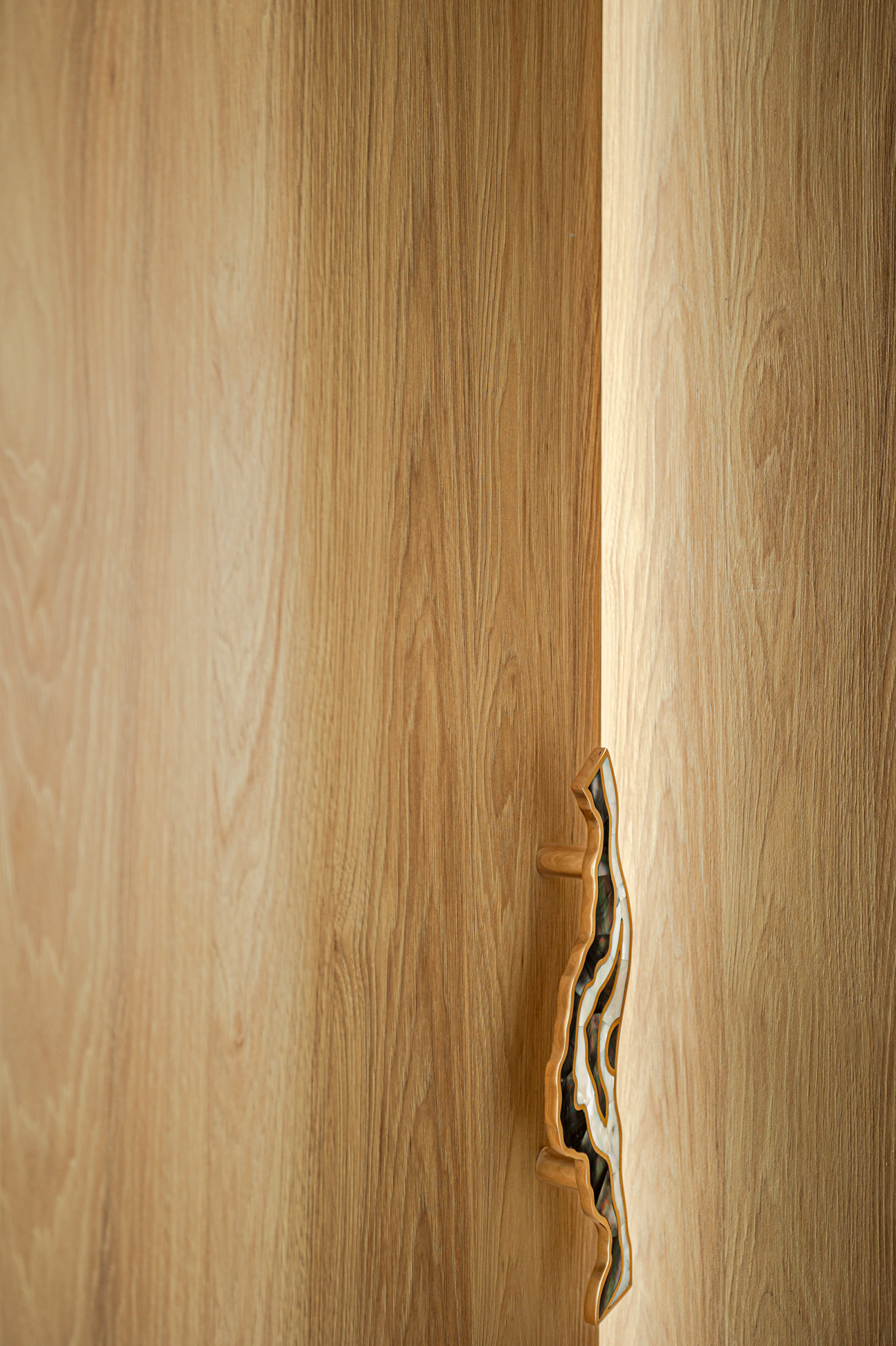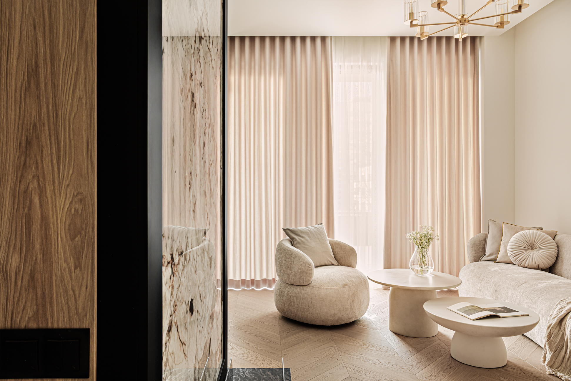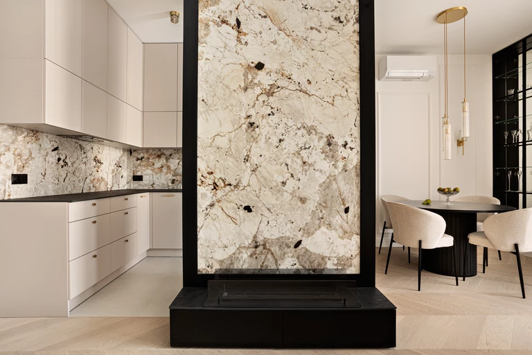 W projekcie KONC Studio szczególną rolę odgrywa precyzyjnie dobrany detal, który buduje atmosferę dopracowanego luksusu. Mosiężne uchwyty meblowe, antaby wykonane z masy perłowej oraz szkło ornamentowe nadają całości głębi i podkreślają rzemieślniczy charakter realizacji. Wszystkie te elementy tworzą spójne, ponadczasowe tło dla codzienności, które zachwyca dopracowaną formą i spokojną atmosferą, oferując wytchnienie od zgiełku panującego tuż za oknem.