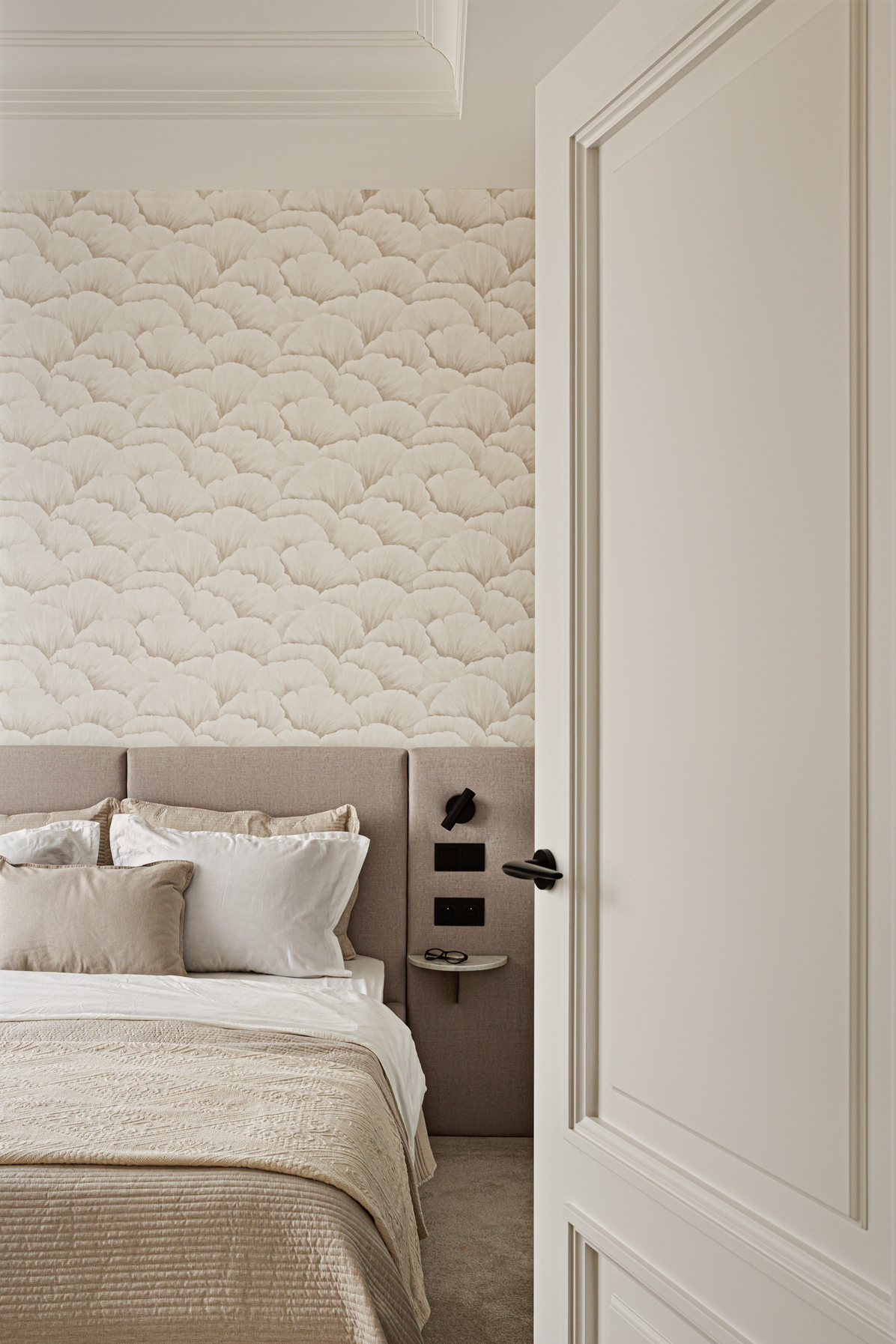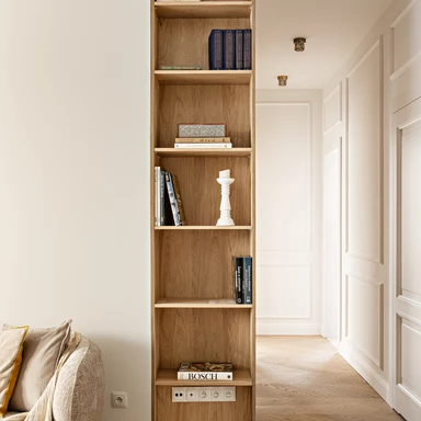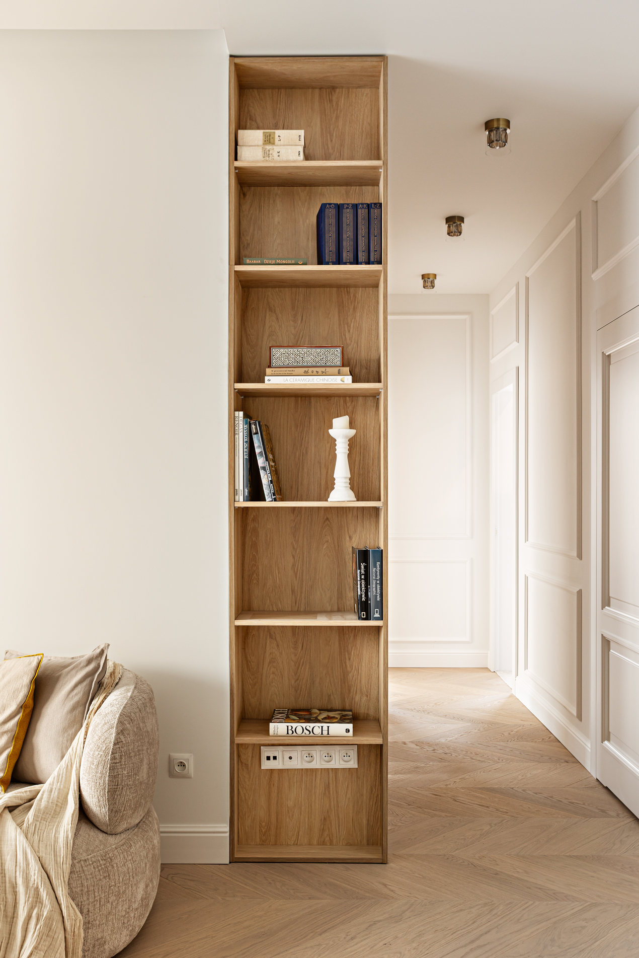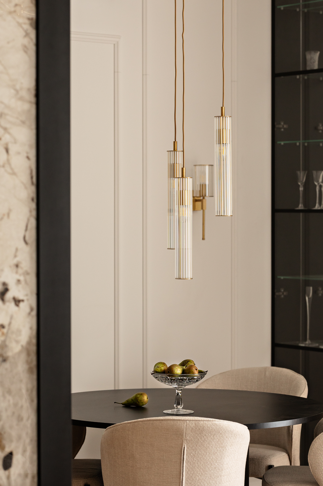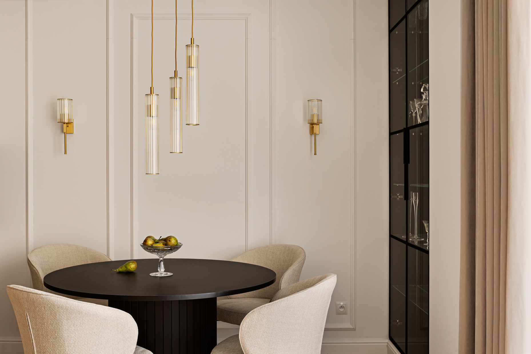 Inspiracją dla aranżacji 95-metrowego mieszkania stały się paryskie apartamenty, w których historyczna architektura płynnie współistnieje z nowoczesną funkcjonalnością. Wyjątkowa wysokość pomieszczeń, przekraczająca trzy metry, pozwoliła na wprowadzenie klasycznych elementów, takich jak dekoracyjna sztukaterie ścienna oraz efektowne, kryształowe lampy podkreślające reprezentacyjny charakter strefy dziennej. Na tym metrażu zaprojektowano trzy pokoje oraz otwartą część wspólną, łączącą salon z kuchnią.