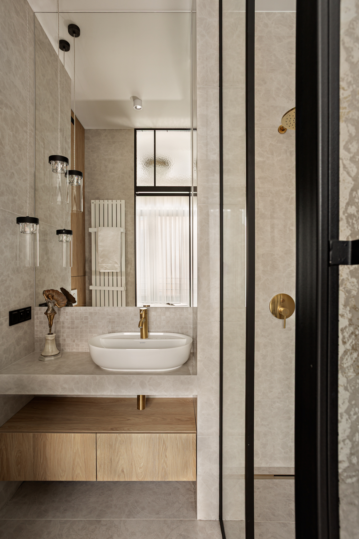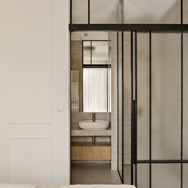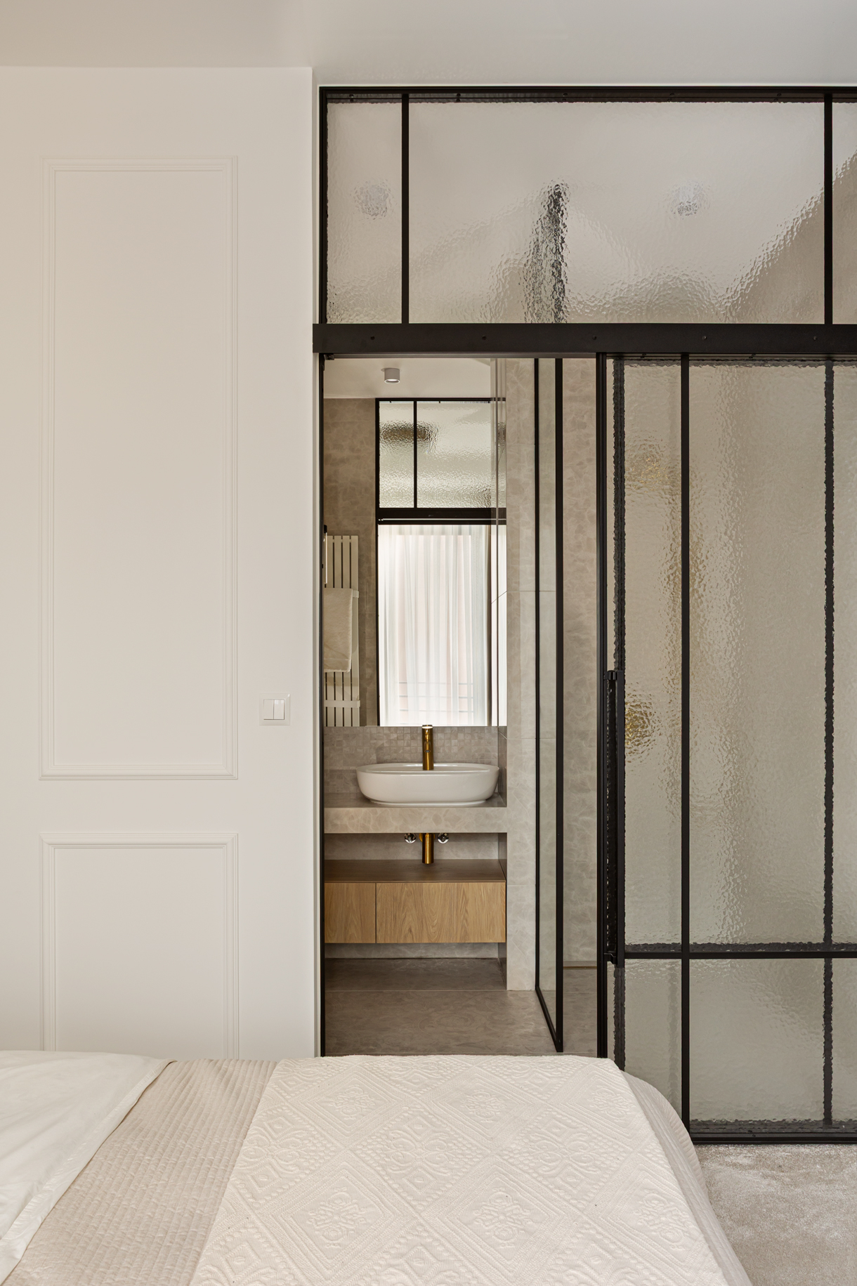 Jednym z kluczowych wyzwań podczas prac projektowych była modyfikacja pierwotnego układu funkcjonalnego. Zmiany instalacyjne umożliwiły wydzielenie dodatkowej łazienki bezpośrednio przy sypialni, co pozwoliło na stworzenie intymnej strefy prywatnej oraz ukrytej, niemal niewidocznej części gospodarczej. Pomiędzy sypialnią a nową łazienką zastosowano szklaną ścianę z czarnymi szprosami i szkłem ornamentowym. Rozwiązanie to subtelnie oddziela obie przestrzenie, nie ograniczając przy tym dostępu światła i zachowując poczucie przestronności wnętrza.