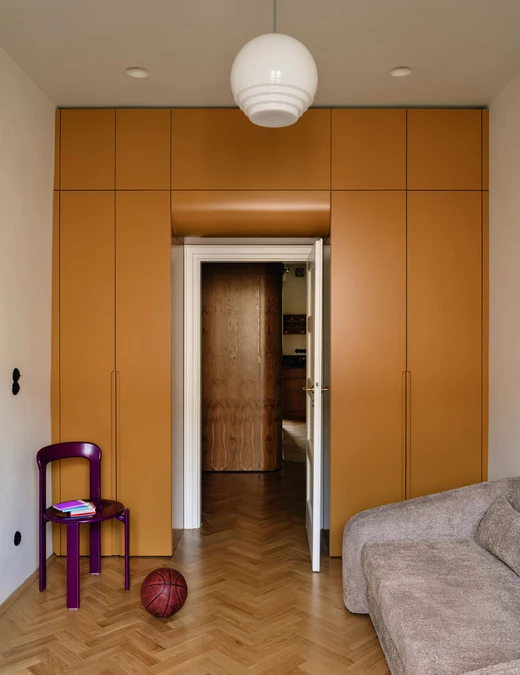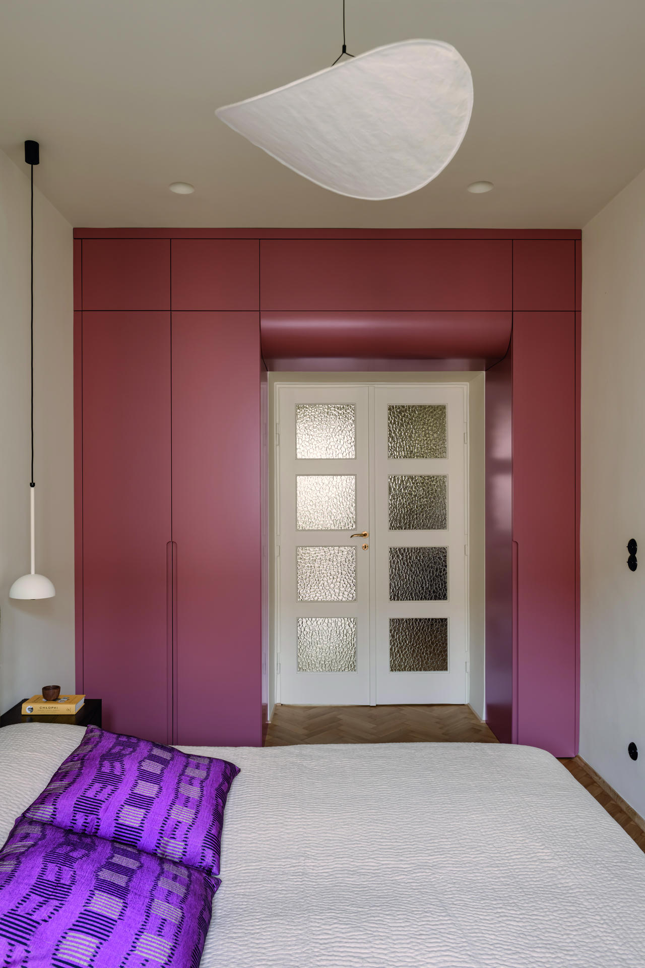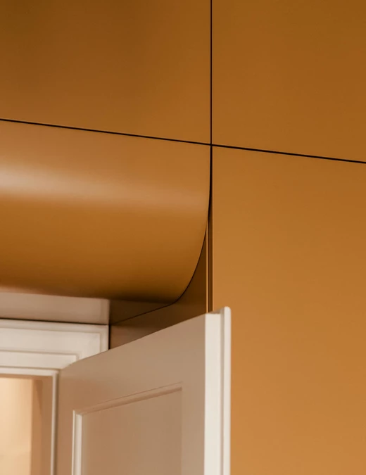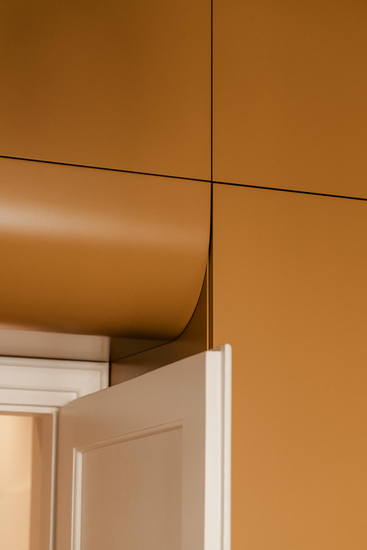 Sypialnia i gabinet zaskakują odważniejszą kolorystyką szaf. Pojawia się tu subtelny pudrowy róż oraz ciepły odcień curry. W sypialni szafa obejmuje również drzwi, tworząc efekt miękkiego portalu o płynnych, niemal rzeźbiarskich liniach.