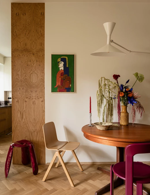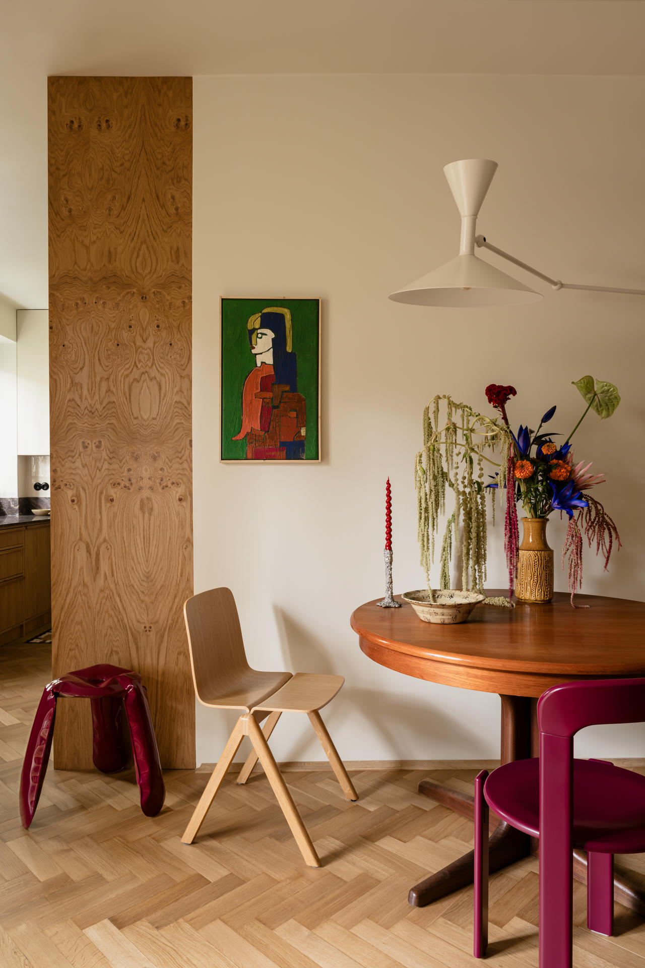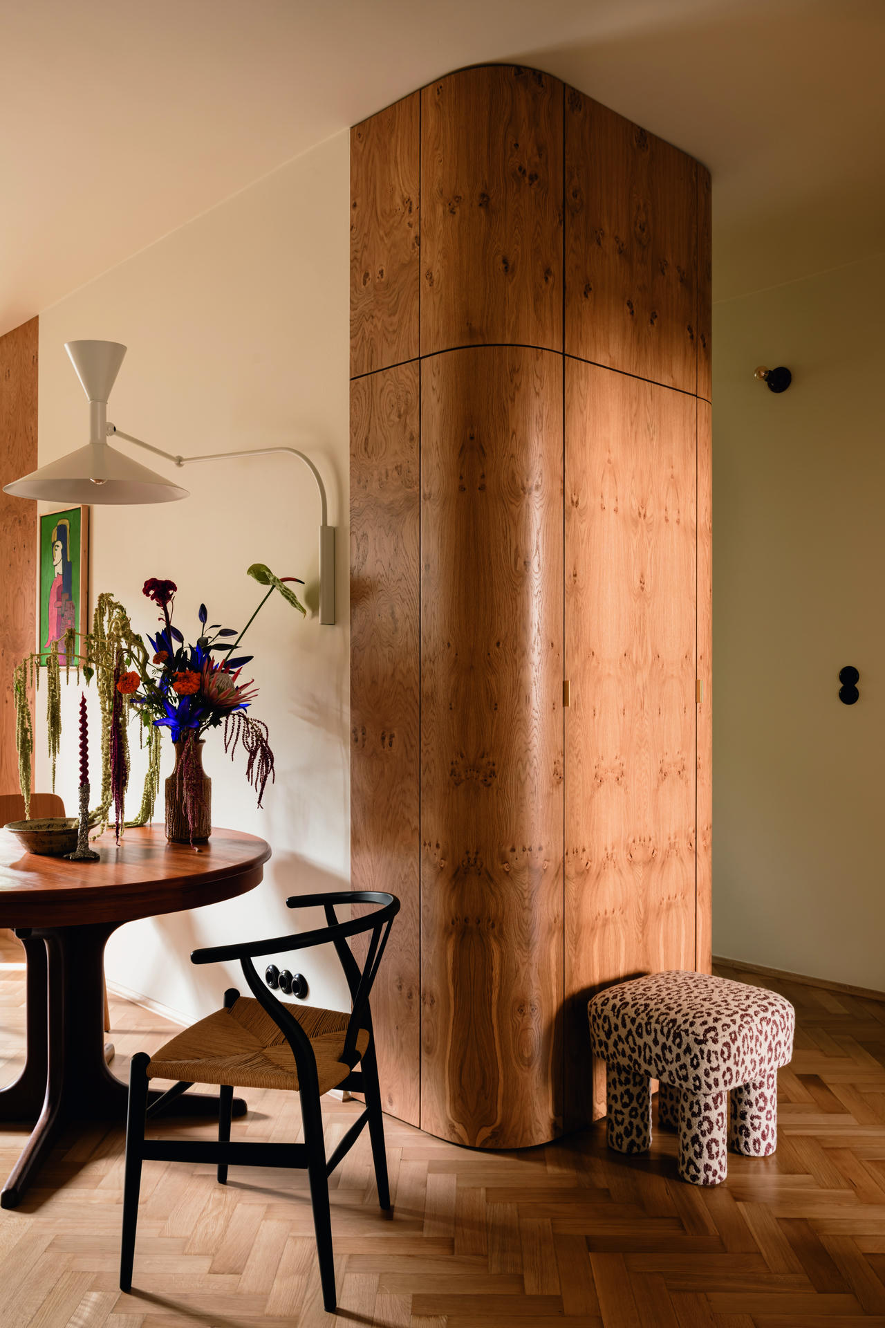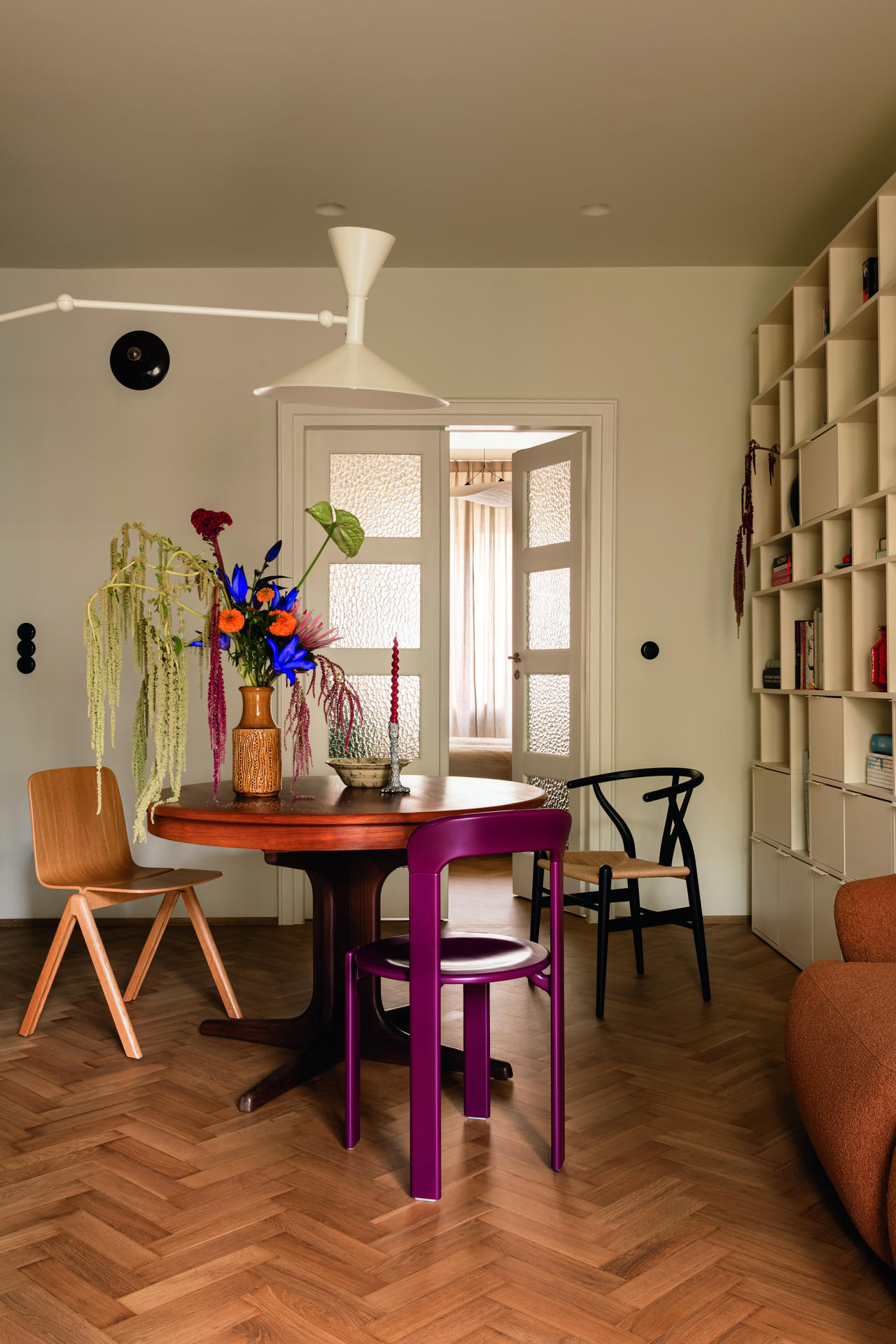 Salon zaprojektowano jako przestrzeń kontrastów, w której każdy element ma swoje znaczenie. Przy okrągłym, duńskim stole z lat 60. ustawiono różnorodne krzesła, od kultowego modelu Rey po ponadczasowy CH24 Wishbone Chair. Ich wyrazisty design równoważy neutralne tło: jasny regał na książki oraz minimalistyczny kinkiet „Nemo” projektu Le Corbusiera. Chropowata struktura ścian dodaje wnętrzu autentyczności, a miodowa sofa harmonijnie współgra z ciepłym odcieniem podłogi.