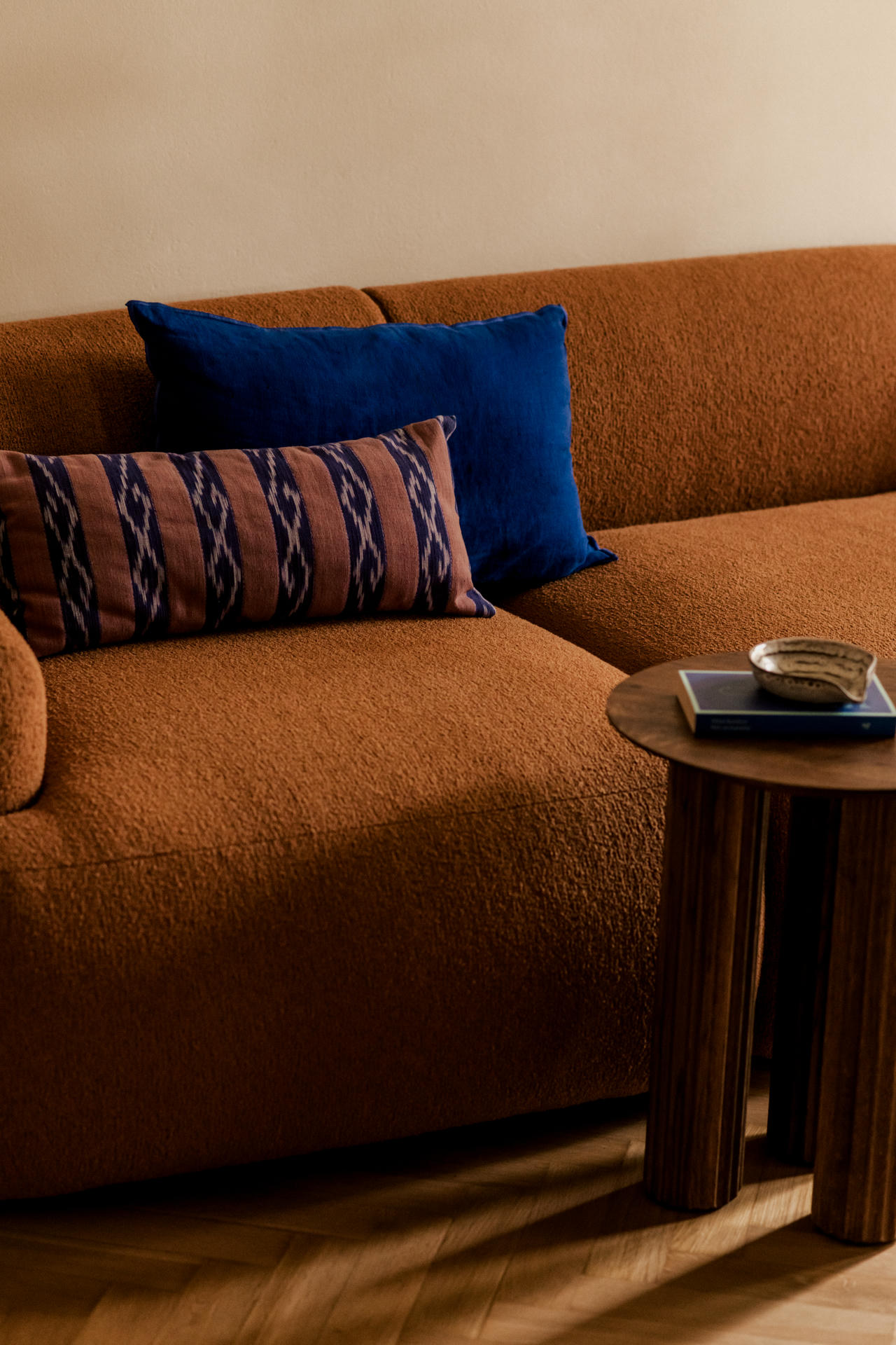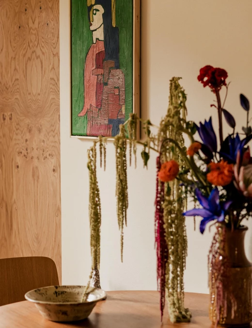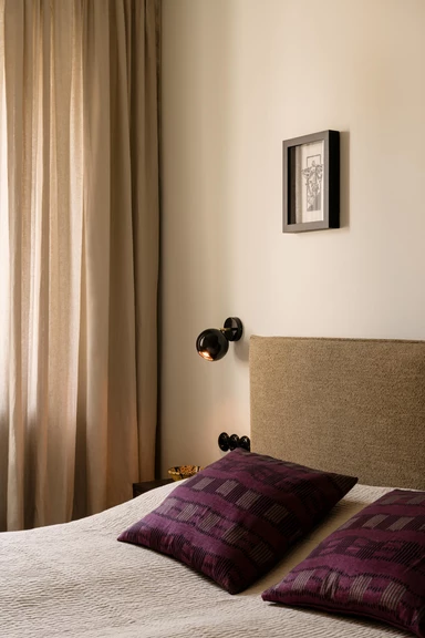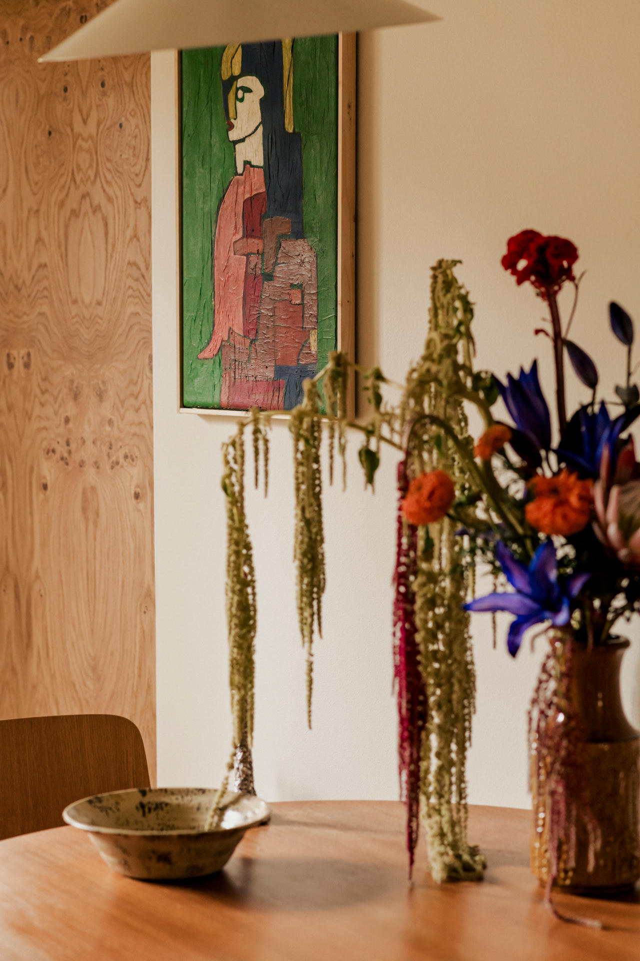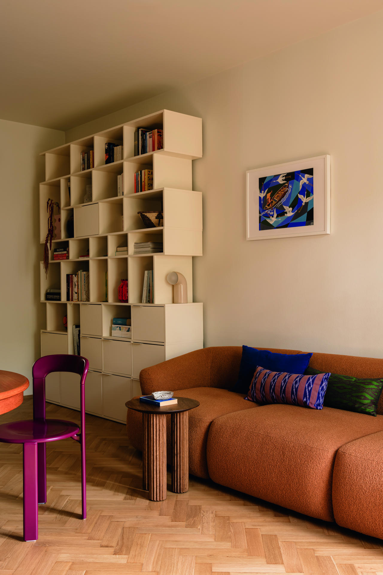 Salon zaprojektowano jako przestrzeń kontrastów, w której każdy element ma swoje znaczenie. Przy okrągłym, duńskim stole z lat 60. ustawiono różnorodne krzesła, od kultowego modelu Rey po ponadczasowy CH24 Wishbone Chair. Ich wyrazisty design równoważy neutralne tło: jasny regał na książki oraz minimalistyczny kinkiet „Nemo” projektu Le Corbusiera. Chropowata struktura ścian dodaje wnętrzu autentyczności, a miodowa sofa harmonijnie współgra z ciepłym odcieniem podłogi.