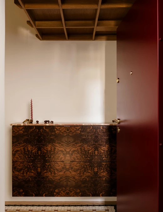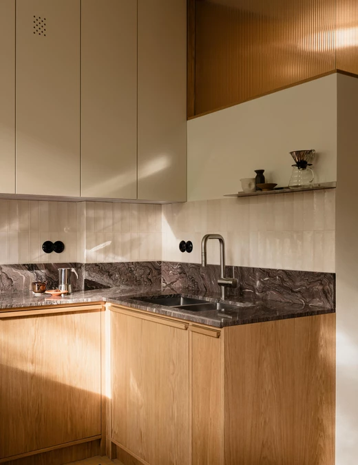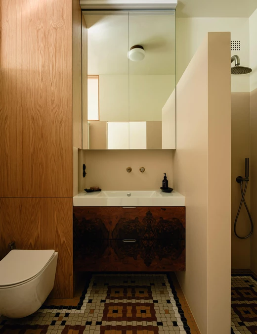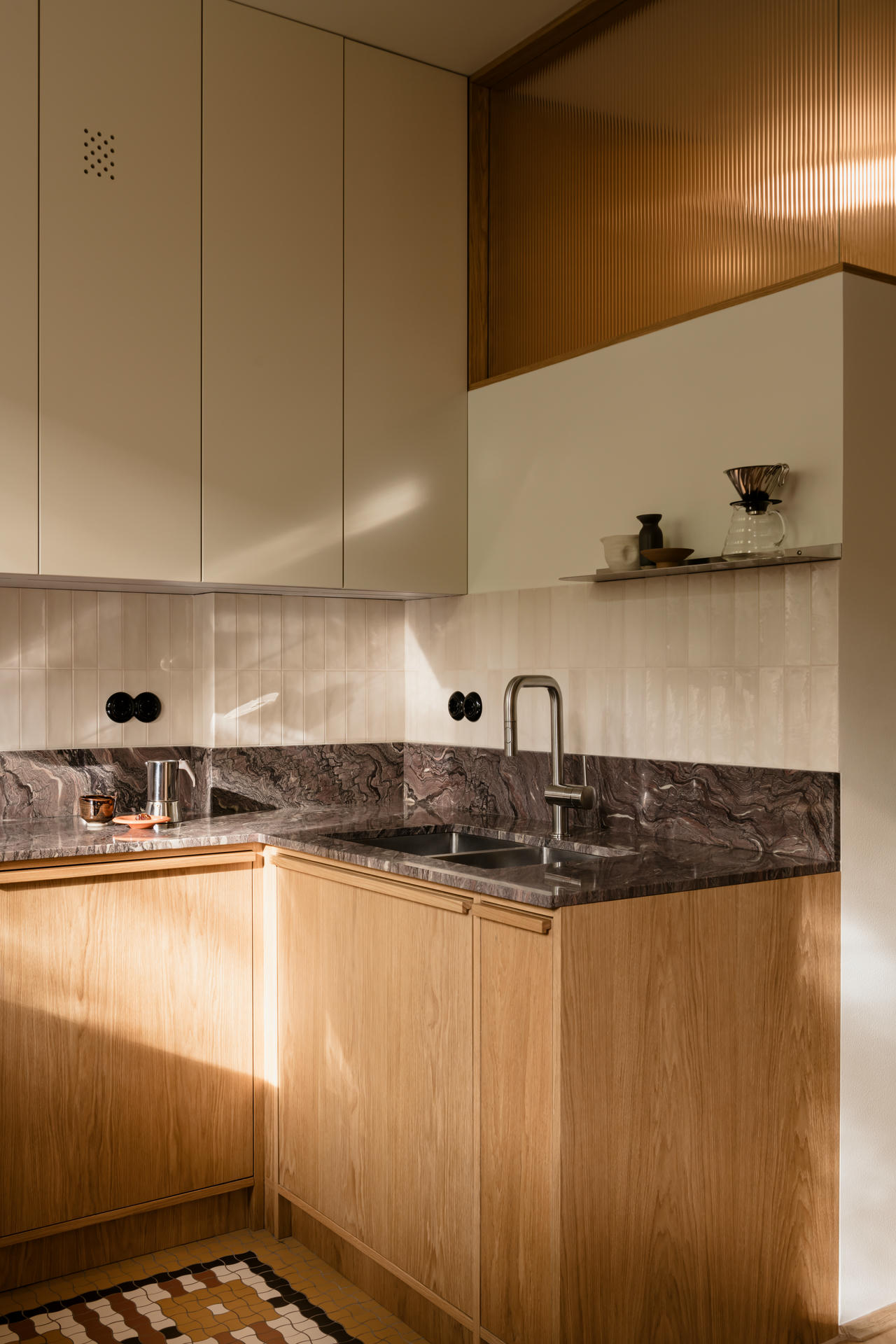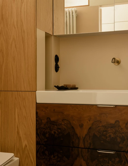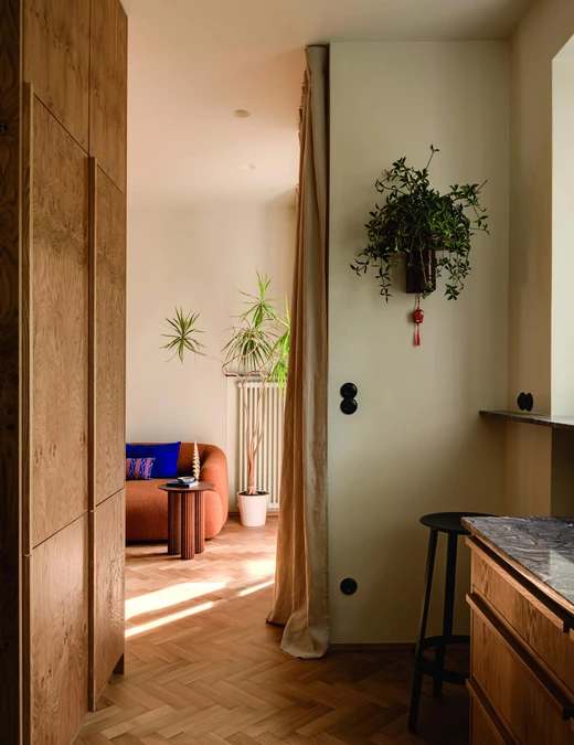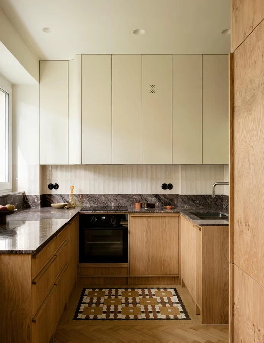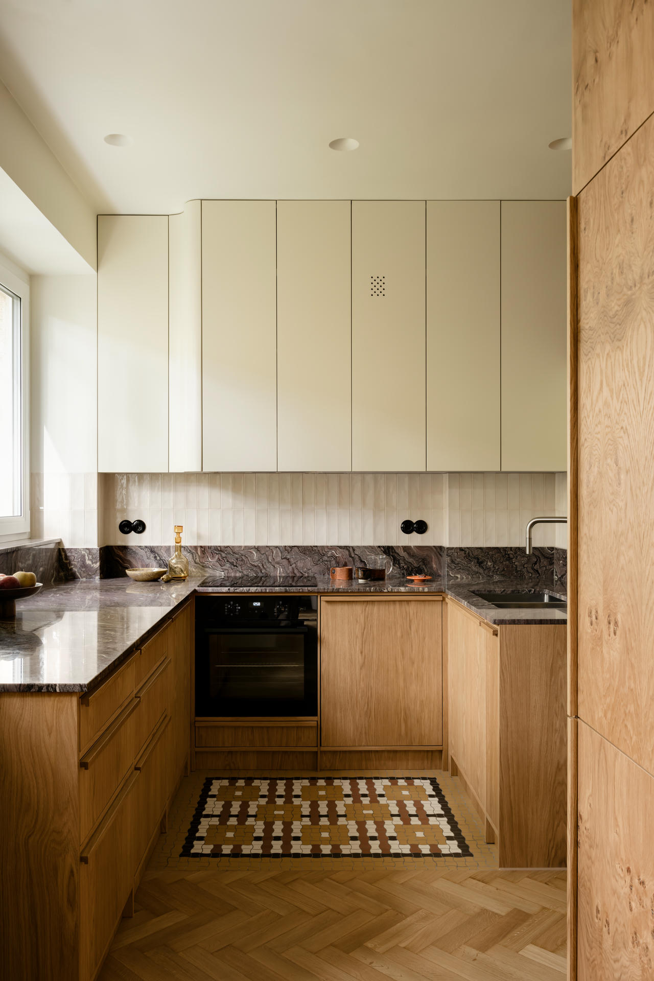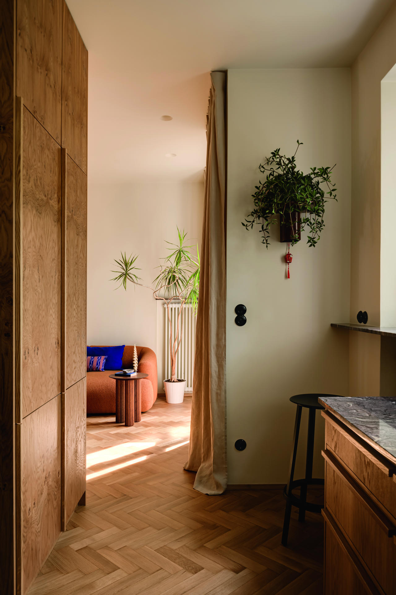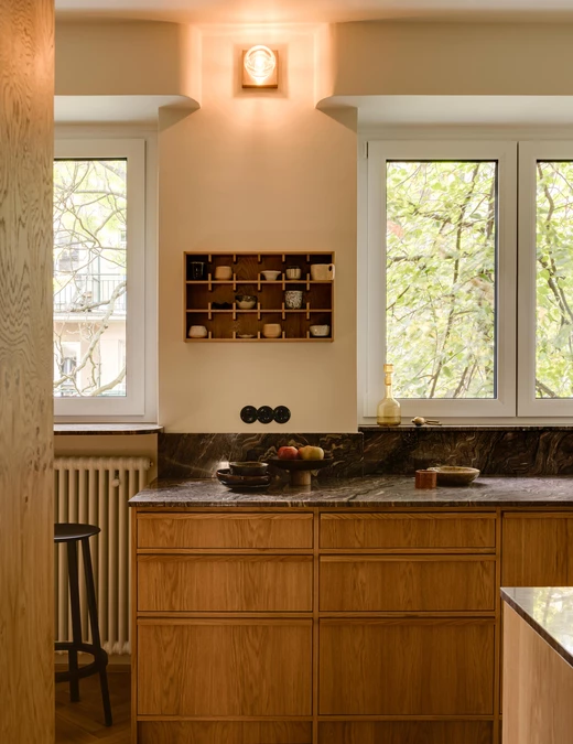 Kuchnia zachwyca precyzją wykonania i szlachetnością materiałów. Marmurowy blat zestawiono z drewnem i ceramiką, tworząc kompozycję opartą na naturalnych fakturach. Całość dopełnia światło, jeden z najważniejszych „materiałów” tego projektu. Przez cały dzień słońce przebija się między drzewami rosnącymi przed kamienicą, rysując na ścianach zmieniające się wzory.