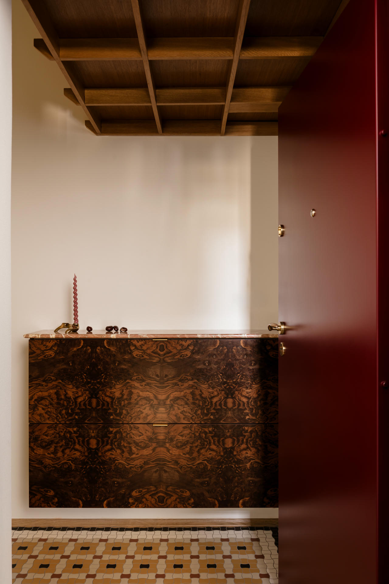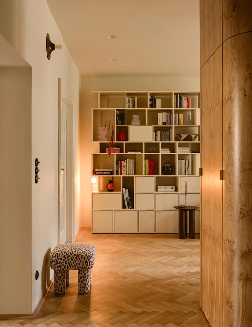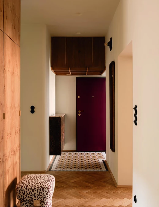 Sercem wnętrza są starannie odrestaurowane elementy oryginalne: drzwi wewnętrzne, drewniany parkiet ułożony w klasyczną jodełkę, pawlacz z barwionej sklejki i forniru oraz mosiężne klamki.