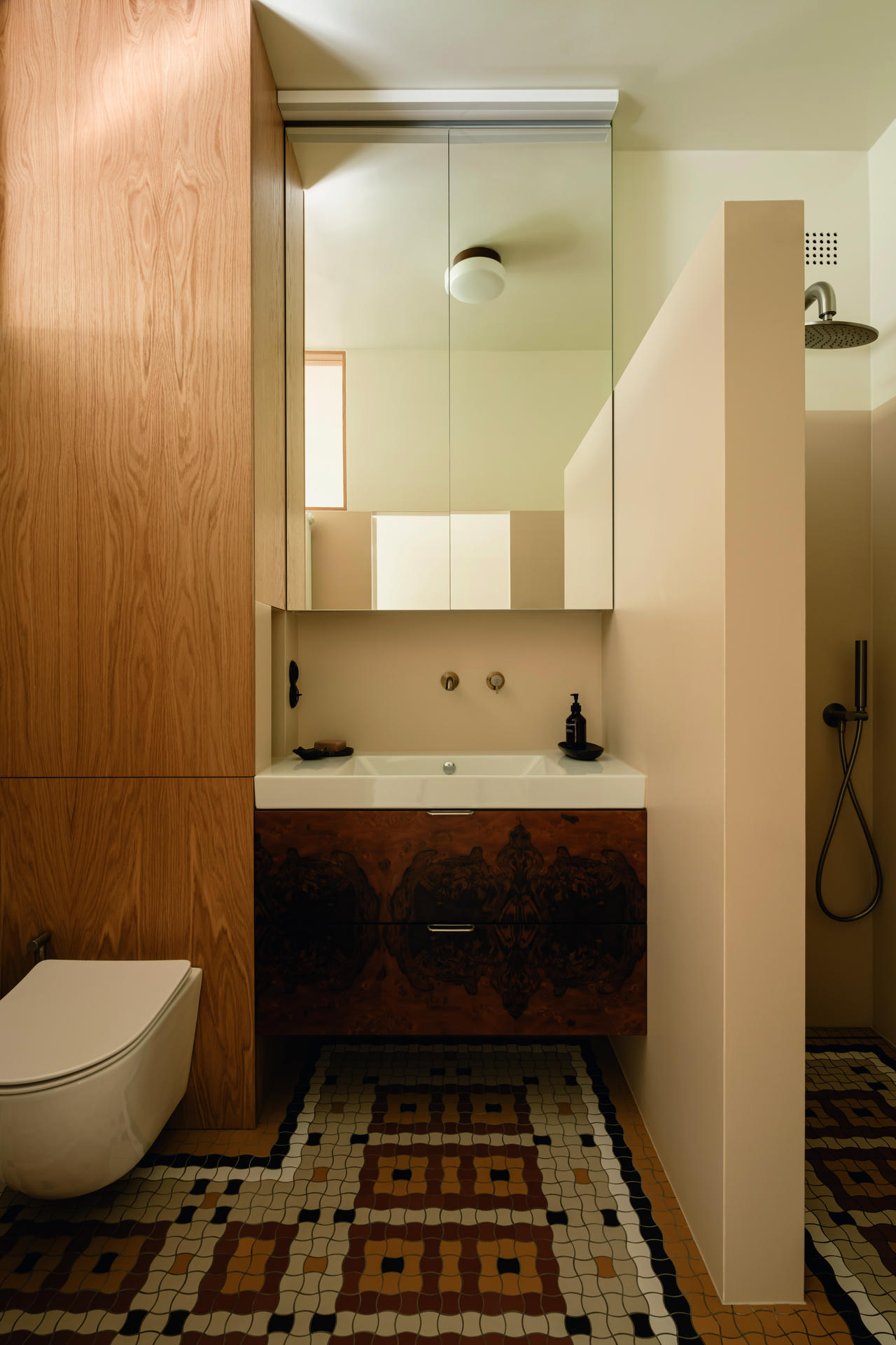 W łazience kontynuowano estetykę całego mieszkania, dbając o spójność materiałową. Posadzka z gorsecików współgra z elegancką szafką z czeczotki, a klasyczne inspiracje zestawiono z nowoczesnymi rozwiązaniami technicznymi. Ornamentowe szkło świetlika wychodzącego na kuchnię delikatnie rozprasza światło.