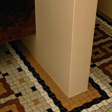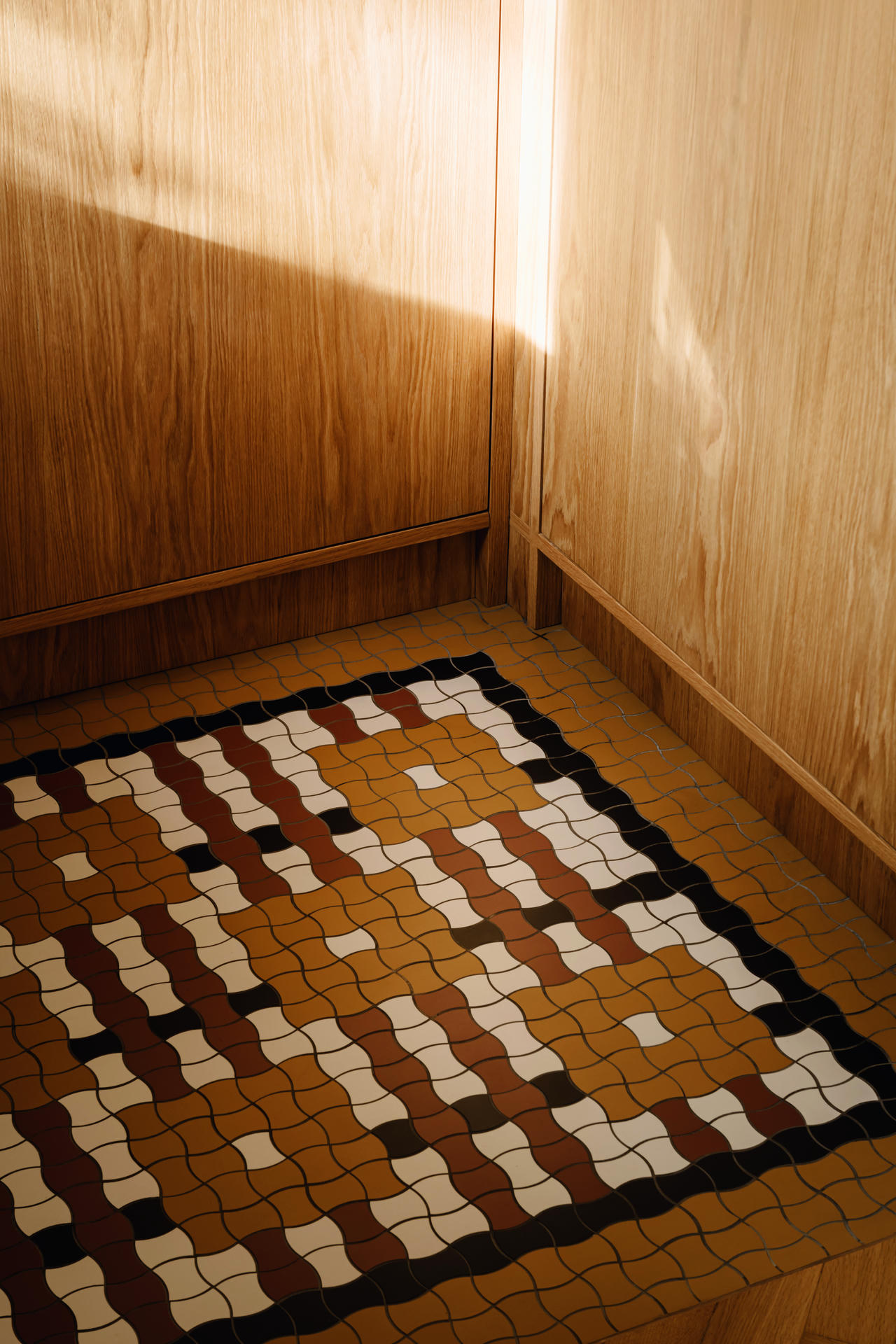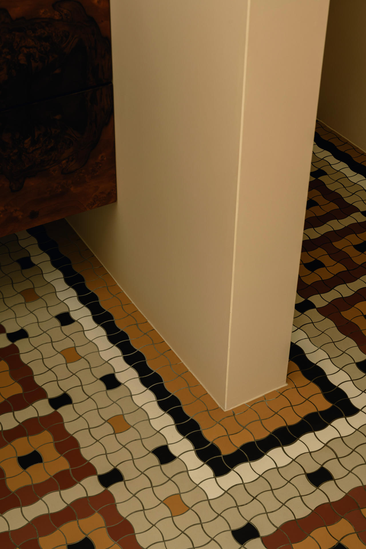 Jednym z motywów przewodnich projektu są płytki inspirowane warszawskimi „gorsecikami”, czyli popularnymi w latach 30. XX wieku ceramicznymi płytkami z charakterystycznym przewężeniem w „talii”, przypominającym kobiecy gorset. W tym mieszkaniu inspiracje nimi pojawiają się w przedpokoju, gdzie w kompozycji wita nas kilka oryginalnych sztuk odnalezionych podczas wyburzeń, a także w kuchni i łazience.