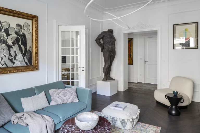 Jak w prawdziwym wielkomiejskim apartamencie, także i tu, przy ulicy Dąbrowskiego ścianami zawładnęła sztuka, także i w złotych ramach. Jednak najbardziej spektakularnym dziełem w tym wnętrzu jest potężna rzeźba mężczyzny bez głowy dłuta absolwenta poznańskiej ASP Krzysztofa Wojtukiewicza. Muskularny mężczyzna, chociaż bez głowy, puszcza do nas oko. To klasyczne, pełne harmonii wnętrze, lecz dalekie od sztampy i śmiertelnej powagi.