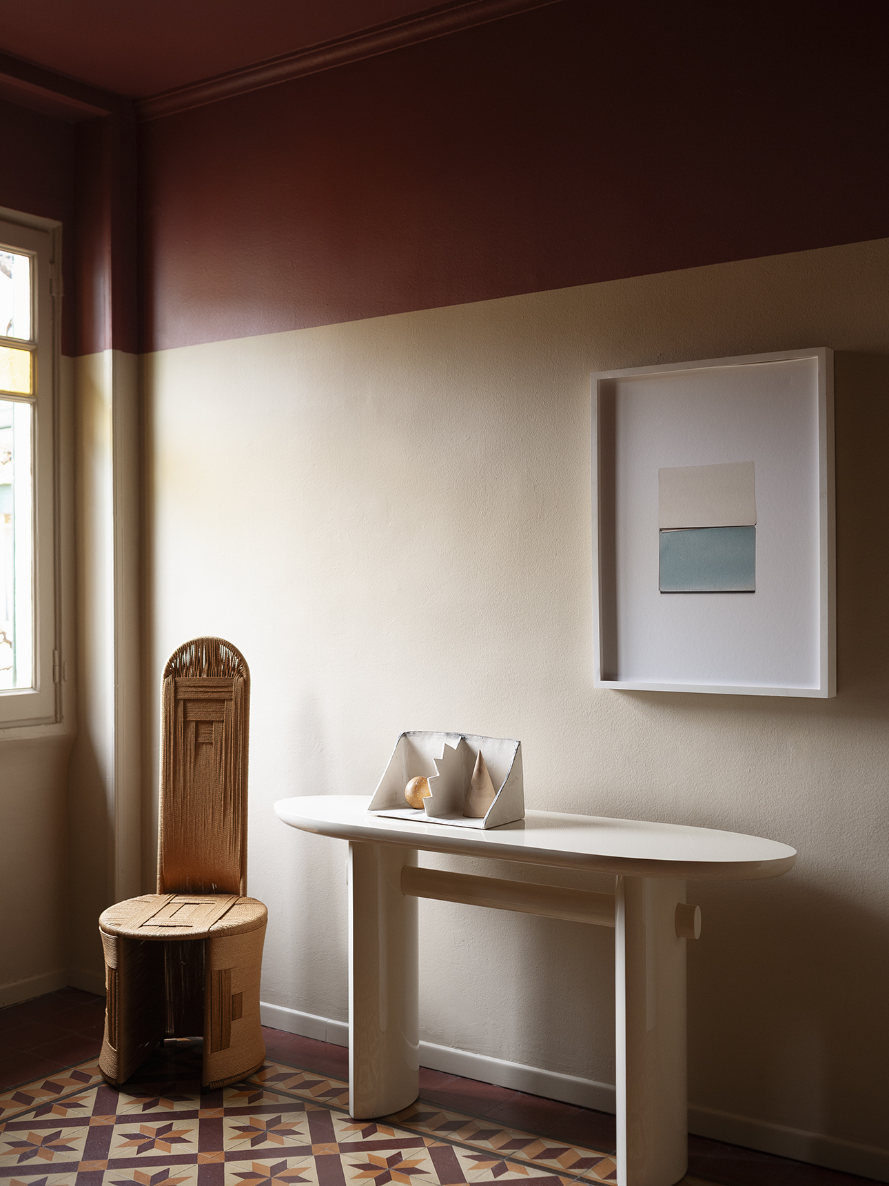 Strefę relaksu projektantki ze Studiopepe zaplanowały jako miejsce odpoczynku i nieformalnych spotkań. Pojawia się tu wygodny fotel o miękkiej linii, konsola o delikatnie zaokrąglonych krawędziach oraz ceramiczna rzeźba, która pełni rolę artystycznego punktu odniesienia. Naprzeciwko ustawiły szezlong z charakterystycznym modułowym oparciem, zestawiony z prostym, drewnianym stolikiem bocznym,dominuje ikona włoskiego wzornictwa – lampa Shogun projektu Mario Botty.