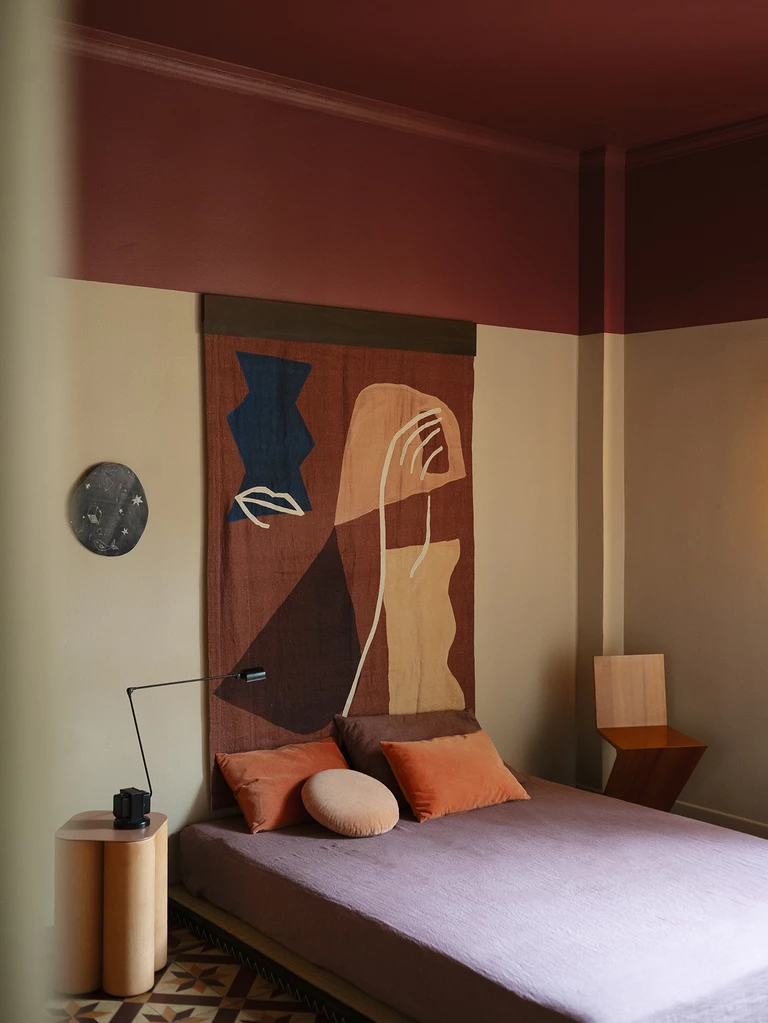Ścianę nad łóżkiem w sypialni wypełnia duży tekstylny panel z kolekcji Sibylle Studiopepe. Na łóżku projektantki ułożyły aksamitne poduszki w zgaszonych kolorach. Obok stanęło krzesło Zig Zag projektu Gerrita Rietvelda – klasyk modernizmu, który wprowadza mocny, graficzny akcent. Aranżację uzupełnia niewielki skórzany stolik i prosta lampa stołowa, podkreślające bardziej intymny charakter tego pomieszczenia.