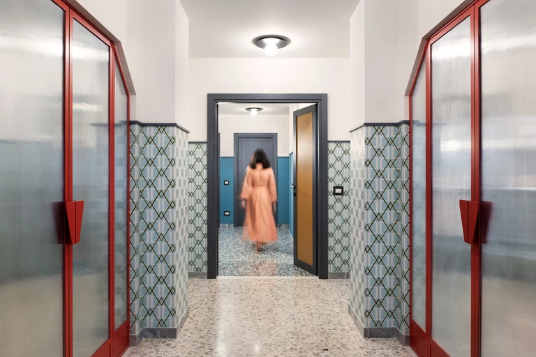 Architekci, z Marco Rullim na czele, podeszli do projektu z niezwykłym wyczuciem. Zastany układ mieszkania, logiczny i dobrze skomponowany, pozostał w dużej mierze nienaruszony. Zamiast burzyć ściany, skupiono się na rekonfiguracji kuchni i łazienek oraz dopracowaniu komunikacji w sposób, który nie zakłóca pierwotnego rytmu wnętrza.