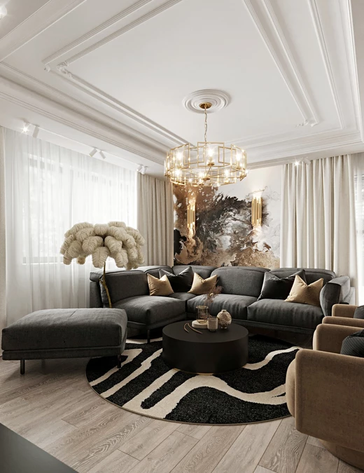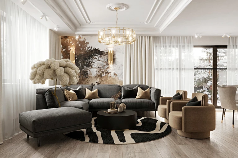 Czarny stolik kawowy o prostej, ale wyrazistej formie pełni rolę stylistycznego łącznika w salonie. Stonowane odcienie mebli dają świetny pretekst dla dekoracji i dodatków w kolorze starego złota. Graficzny wzór tapety łączy wszystkie odcienie występujące w aranżacji.