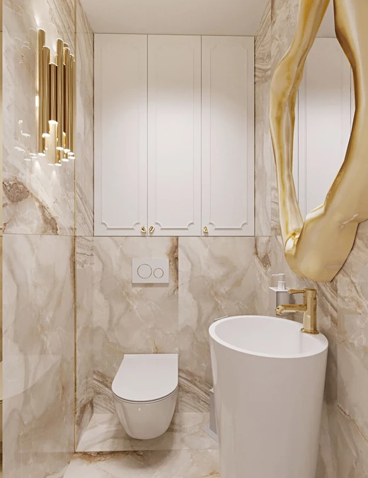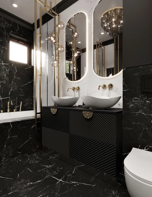 Głównym elementem aranżacji w łazience jest gres z rysunkiem czarnego marmuru, a towarzyszące mu sztukaterie i złote dodatki wprowadzają efekt pożądanego przepychu, który także w tym pomieszczeniu jest pod kontrolą.
