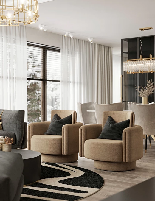 Elegancką sofę narożną i puf z tej samej kolekcji projektantka zestawiła z fotelami Bofii marki Bizzarto. Chociaż meble różnią się formą, stylem i kolorystką, to jednocześnie znakomicie się równoważą. Grafitowa sofa na nóżkach idealne wpisuje się w styl modern classic. Z kolei geometryczne fotele Bofii zaprojektowane przez Grynasz Studio w swych rzeźbiarskich kształtach stanowią kwintesencję modernizmu. Jak wyjaśnia autorka projektu, ich minimalistyczna forma przełamuje wszechobecny kontrolowany przepych. Siedzisko z podłokietnikami o optymalnej wysokości wsparte jest na obrotowej podstawie. Dzięki temu interesującą formę, która zapewnia przyjemny relaks, można łatwo dopasować do potrzeb.