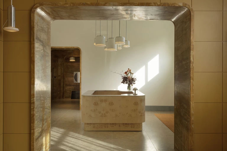 Warto zwrócić uwagę na eleganckie, kamienne opaski wykonane z Giallo. Panele ścienne w kolorze ochry dodają przestrzeni lekko futurystycznego charakteru. We wnętrzu znalazło się dużo mebli vintage, część obiektów pochodzi z Maison Gerard, a tkaniny z Zak and Fox.