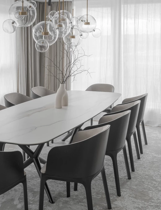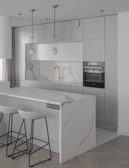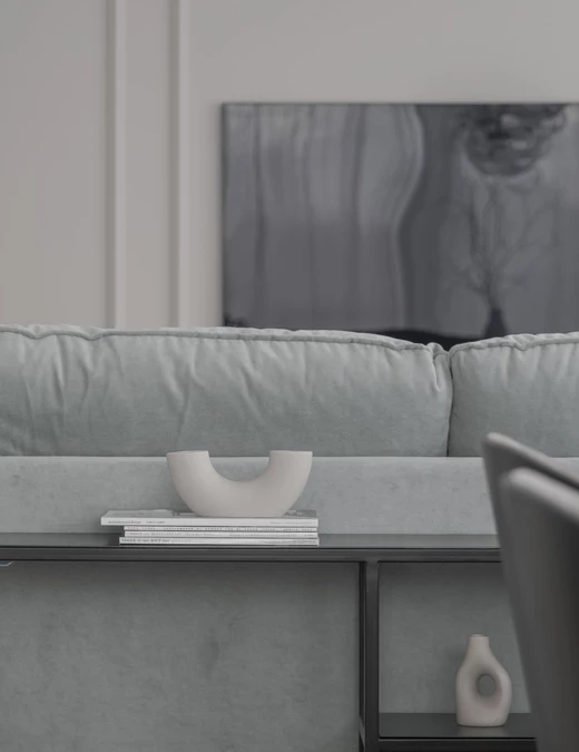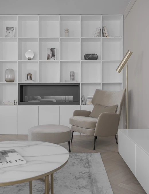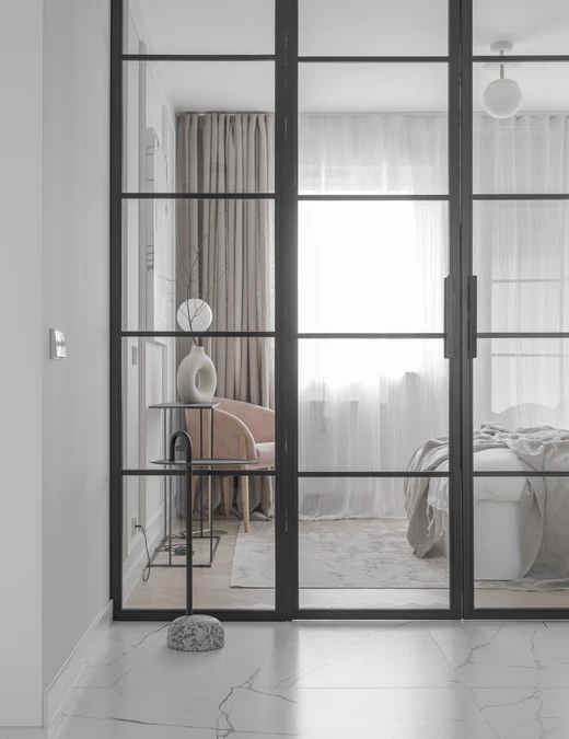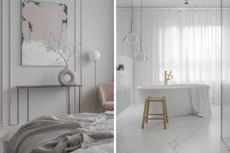 Cała przestrzeń utrzymana jest w delikatnych odcieniach. Wszechobecną biel uzupełnia jasne dębowe drewno, naturalne beże, satynowe szarości i dyskretne pudrowe barwy podkreślone czernią detali. We wnętrzach pojawiają się także materiały wykończeniowe inspirowane naturą. Wybrane przestrzenie, otulone zostały przez lniane zasłony, które, załamując promienie słoneczne, tworzą przy tym przepiękne, miękkie światło wewnątrz apartamentu.