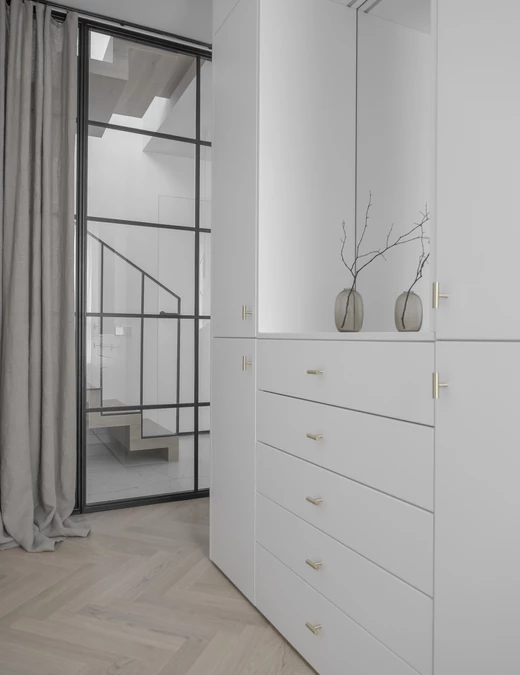 Niezaprzeczalnie przyciągającym wzrok elementem w mieszkaniu są schody. Indywidualnie zaprojektowane, potraktowane zostały jako swego rodzaju rzeźba. Proste w formie stopnie o konstrukcji dywanowej uzupełnia ciemna stalowa balustrada. Schodom na poziomie parteru towarzyszy duża industrialna szklana ściana, która nadaje tym subtelnym wnętrzom nieco więcej charakteru.