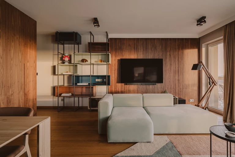 I tak część dzienna obejmuje salon z aneksem kuchennym. To przede wszystkim strefa spotkań. Ustawione naprzeciwko siebie sofy (Hay) sprzyjają spędzaniu czasu z rodziną – tak jak duży stół w jadalni (Fameg). Kolorystyka części dziennej apartamentu miała stwarzać swobodną, przytulną atmosferę – stąd drewno w odcieniu orzecha amerykańskiego, ciepłe złociste zasłony, dodatki w palecie barw ziemi. Na ścianie przeciwległej do strefy wypoczynkowej zamontowano, wykonany na zamówienie, regał. Kubikowe, kolorowe półki pomieszczą pokaźną kolekcję konstrukcji lego, której właścicielem jest inwestor.