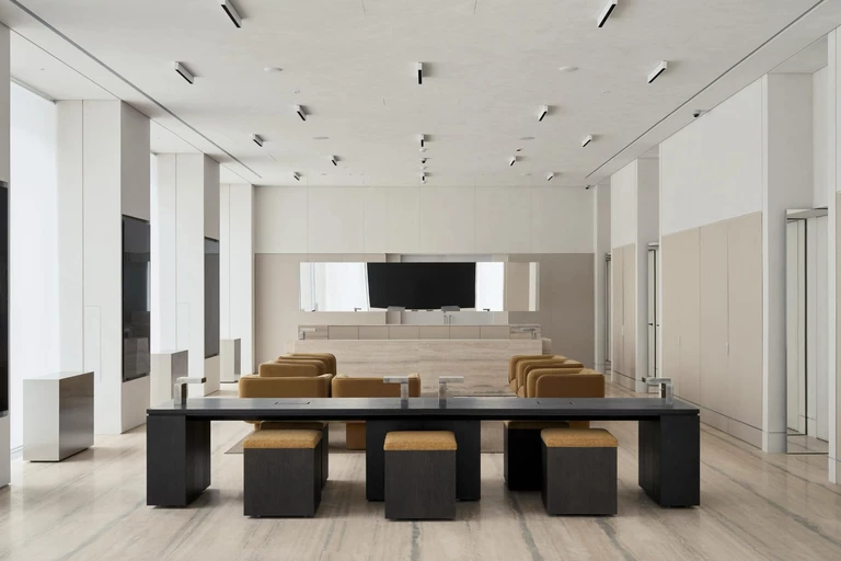 Oświetlenie, traktowane przez pracownię jako integralny element architektury, buduje atmosferę wnętrza i podkreśla jego detale. Obok światła dziennego ważną rolę odgrywa oświetlenie punktowe, które kieruje uwagę na makiety, detale wykończeniowe i wybrane strefy. W ciągach komunikacyjnych zastosowano rozwiązania optycznie skracające ich długość, a w strefach VIP stworzono kameralne, przytulne warunki sprzyjające skupieniu.