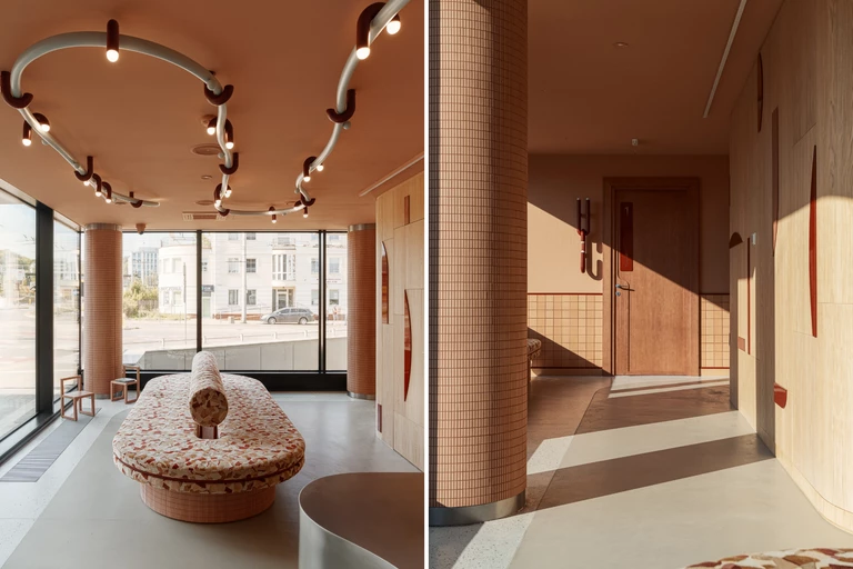Wnętrze kliniki miało być przede wszystkim przyjazne dla dzieci i ich rodziców. Udało się to osiągnąć m.in. dzięki zastosowanej kolorystyce – dominują tu ciepłe bordo, pomarańczowy odcień Peach Fuzz i miękki błękit. Ten zestaw barw otula dębowe drewno w jasnym odcieniu, które ociepla wnętrze. „W przeciwieństwie do konwencjonalnych, białych ścian szpitalnych, te ciepłe barwy pomagają zmniejszyć stres i lęk u dzieci” - wyjaśnia projektantka.