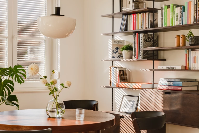 W centralnym punkcie części dziennej znajdują się stół z krzesłami. Meble te doskonale komponują się z regałem wykonanym przez lokalnych rzemieślników według indywidualnego projektu. Strefę dzienną uzupełnia lekka i jasna sofa.