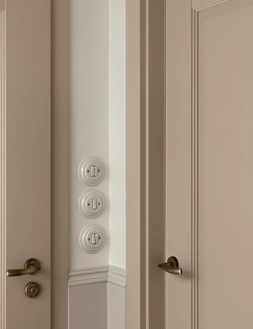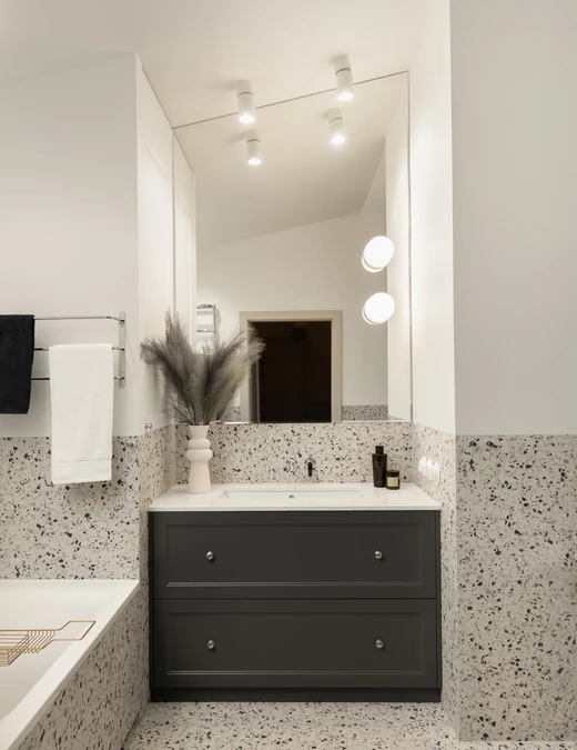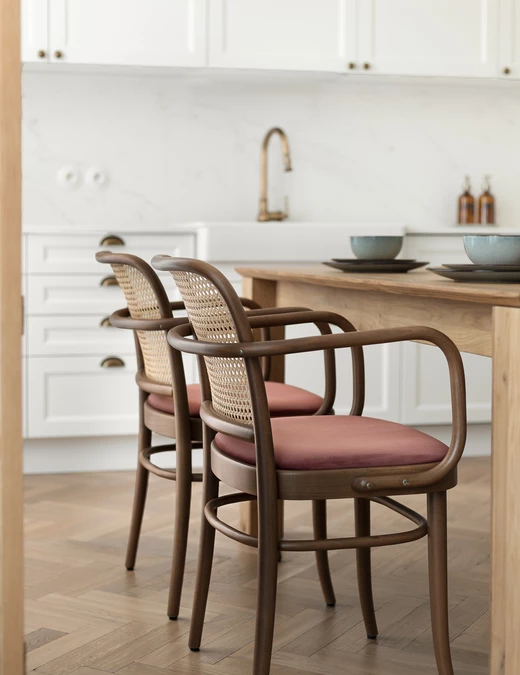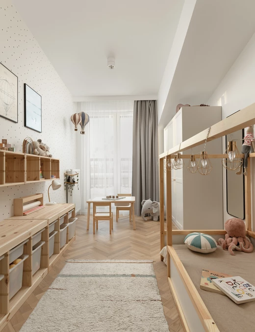 W realizacji połączono wysokiej klasy perły dizajnu z meblami wykonanymi na zamówienie oraz wyposażeniem z popularnych sklepów sieciowych. W aranżacji salonu wykorzystano stoliki drewniane od Noti, należące do kolekcji „Mishell” autorstwa Piotra Kuchcińskiego, oraz krzesła marki TON. W projekcie pokoju dziecięcego użyto szaf na wymiar od IKEA. W  głównej sypialni meble na indywidualne zamówienie uzupełniają stolik kawowy „OKA” zaprojektowany przez Maję Ganszyniec dla marki NURT, fotel „Alex” marki Sits i stoliki nocne „FOU” od MISA FORM.