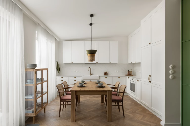 Podstawowym założeniem projektu było wykreowanie przestrzeni sprzyjającej pracy z domu i gotowaniu. Z tego względu w mieszkaniu nie zabrakło wygodnego biurka oraz dużej, przestronnej kuchni. Inwestorom zależało także na zastosowaniu jasnych zabudów meblowych, które zlewałyby się z kolorem ścian i wykorzystaniu harmonijnych barw ziemi – elementy te również znalazły się w projekcie.