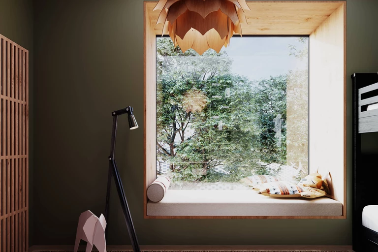 Zaprojektowana przestrzeń leży na działce w bliskim sąsiedztwie domów jednorodzinnych z wysoką roślinnością. Doświetlenie domu znajduje się głównie od strony niewielkiego ogródka oraz od strony ulicy. Aby dodatkowo rozświetlić wszystkie piętra zastosowano dwa świetliki w dachu, które wpuszczają światło do wszystkich kondygnacji oraz klatki schodowej.