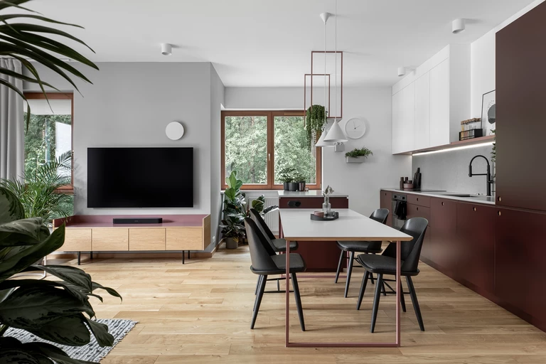 W tym mieszkaniu pierwsze skrzypce grają trzy elementy – bordo, biel oraz rośliny. Wydaje się, że zaprojektowanie całego mieszkania w oparciu o takie wybory jest nieco zachowawcze, jednakże architekci Marta Raca i Michał Raca ze studia Raca Architekci udowadniają, że jest całkowicie inaczej.