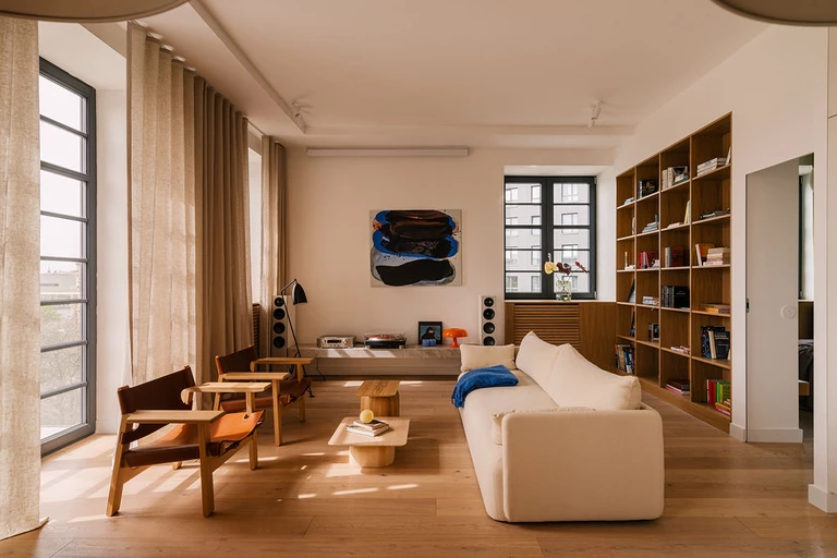 Sercem mieszkania jest otwarta strefa dzienna, która składa się z kuchni, jadalni i salonu. Dominują w niej proste formy i naturalne materiały – dębowy fornir na ścianach i meblach oraz kamienne blaty, które nadają aranżacji trwałość i elegancki charakter. Całość skąpana jest w naturalnym świetle dziennym, które przedostaje się do wnętrza przez duże okna z widokiem na Odrę.