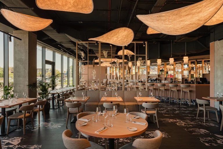 We wnętrzu przeplatają się jasny słomkowy dąb, plecione beżowe tkaniny tapicerskie, terakota w cielistym kolorze oraz wzorzysta podłoga o czarno-białej barwie. Aranżację dopełniają lampy New Works Tense „falujące” nad stolikami oraz Artemide Falkland, które zdobią bar i strefę wejściową.