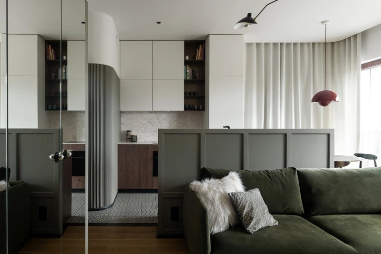 Kameralny klimat wnętrza zbudowano wokół naturalnej, stonowanej kolorystyki. Kolory miały dobrze zgrać się z drewnem i bazą w postaci bieli i czerni, stąd pojawił się odcień zielono-beżowy, który urozmaicił ten zestaw. Dziecku właścicieli mieszkania ten kolor skojarzył się ze słoniem. To określenie na tyle trafne, że architekci postanowili zatytuować tak projekt.