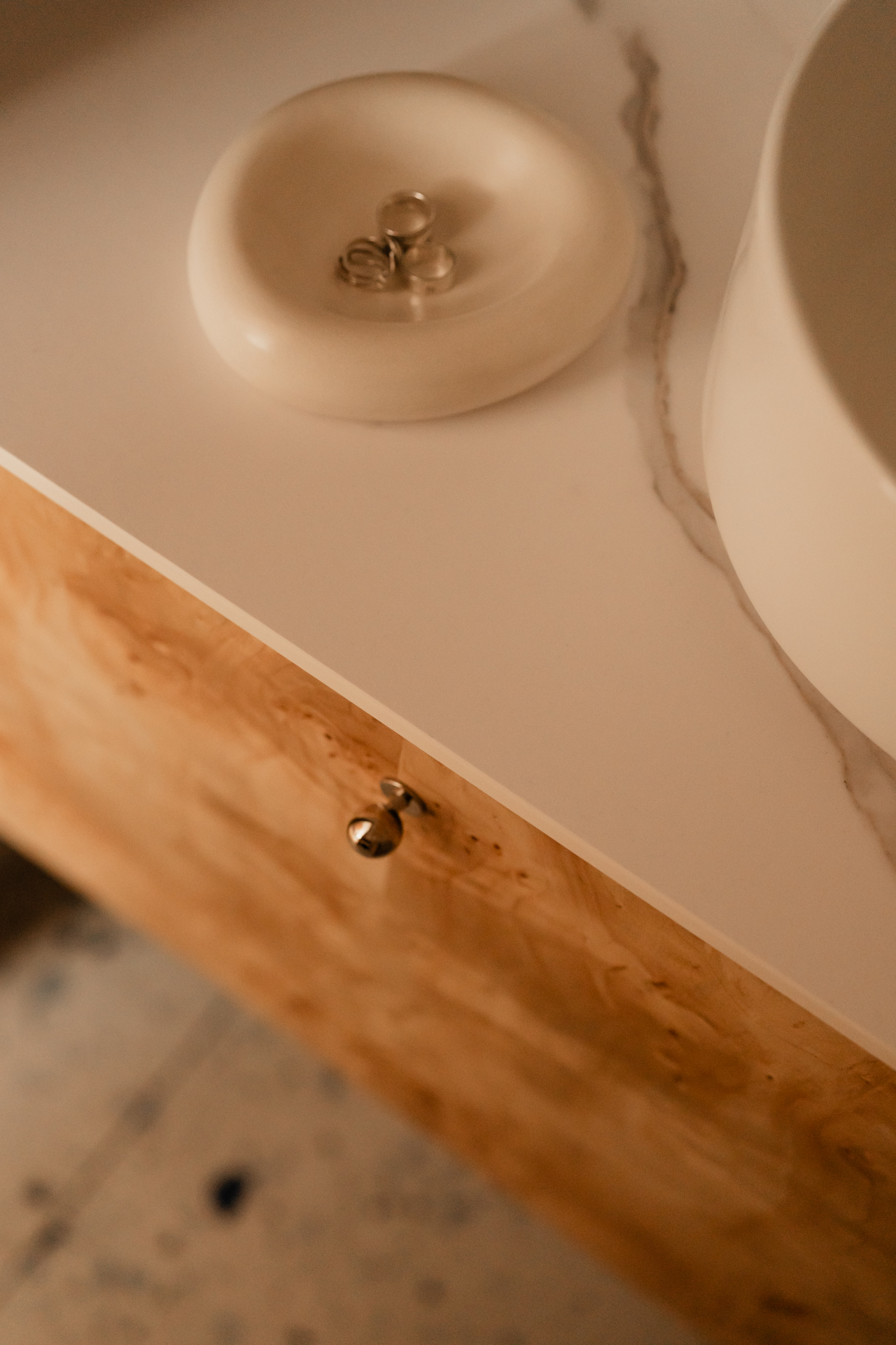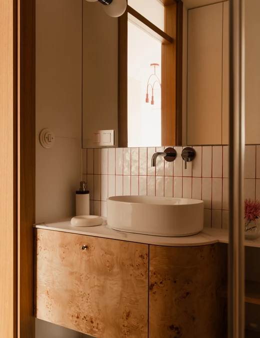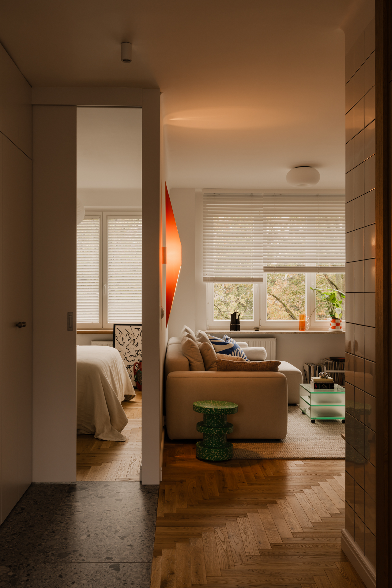 Mieszkanie jest doświetlone z dwóch stron, a zaproponowane przez architekta częściowe wyburzenie ścian otworzyło je na naturalne światło, które zmienia się wraz z rytmem dnia. Rano miękko rozlewa się po fornirowanej kuchni, w południe odbija w lustrze między oknem a zabudową, a wieczorem tańczy na czeczotowych frontach w łazience. Dzięki temu niewielka przestrzeń zyskała wyjątkową głębię i przejrzystość.
