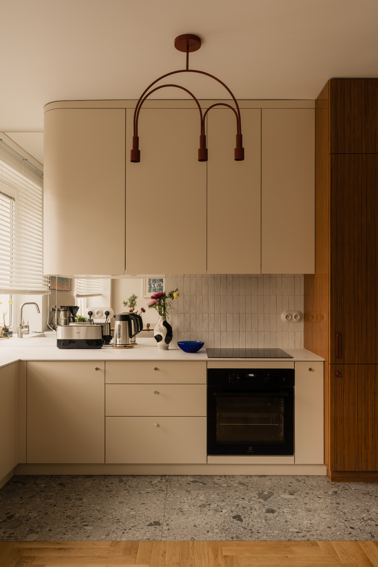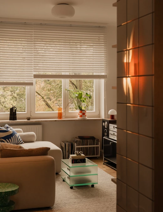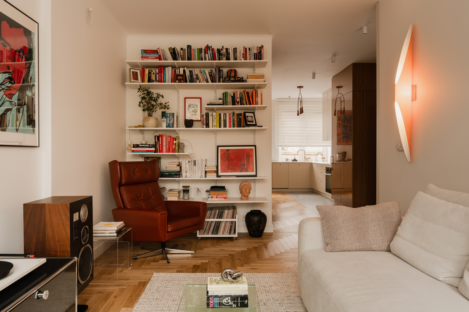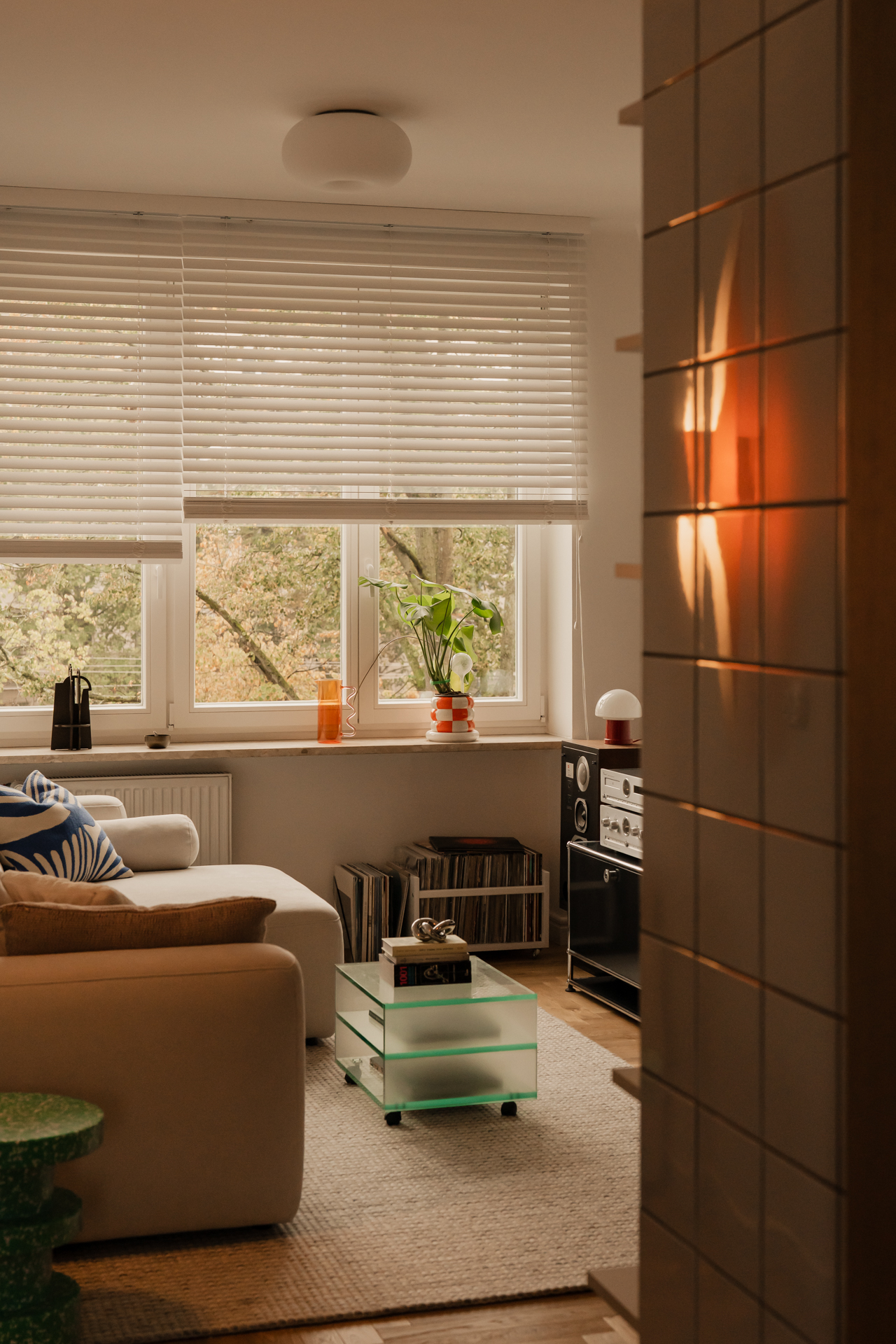 Choć styl mieszkania zdradza wrażliwość na design i piękno, jest ono przede wszystkim przestrzenią do życia – ciepłą, miękką, pełną światła, zróżnicowanych faktur i dźwięków muzyki płynącej z gramofonu. Retro detale, takie jak ceramiczne włączniki, harmonijnie współgrają z nowoczesnymi akcentami.